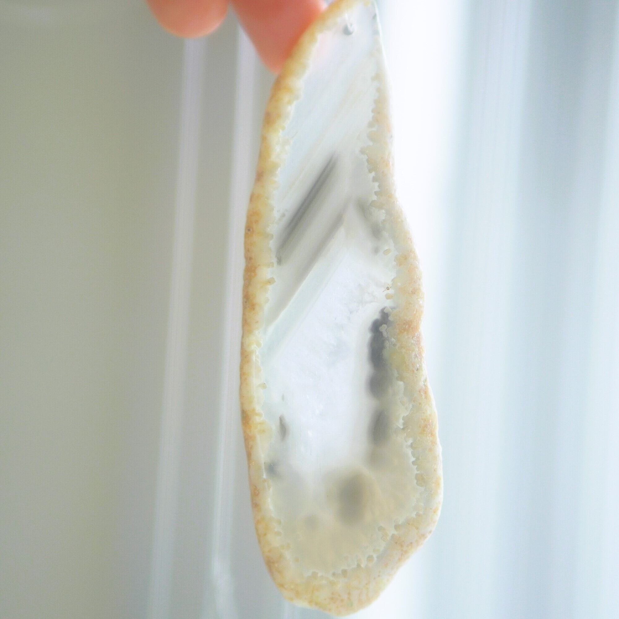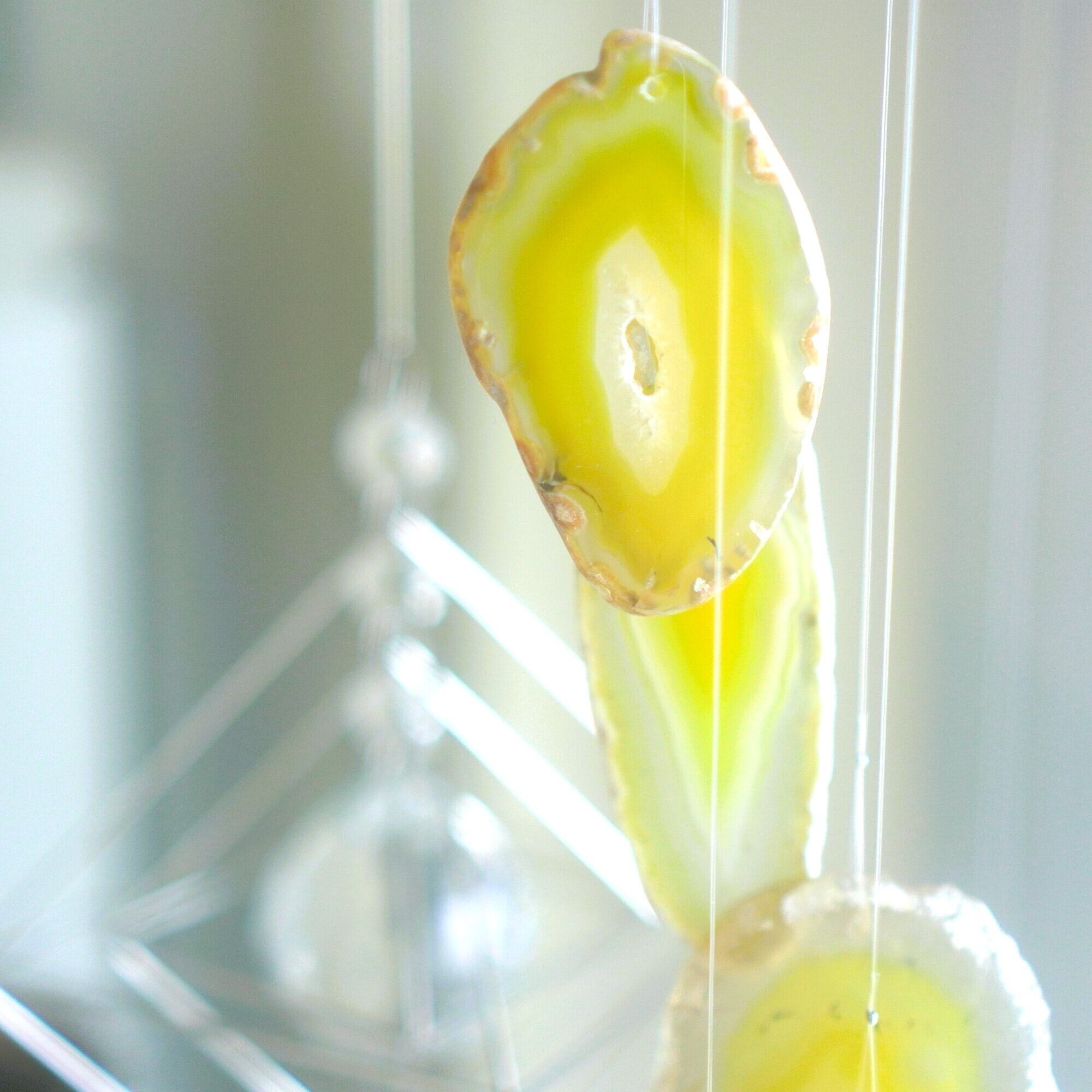 重ねる石同士の側面の加工状態によっても良い音が鳴ったり鳴らなかったり、石の見た目だけで組み合わせを決められないことが難しいポイントでもあるのですが、そんな中、たくさんの石の中から選ばれた5枚のスライスアゲートから出来上がったチャイムたちは、どこか悠々自適に空を泳ぐ妖精のようでもあり、それぞれの音を楽しそうに奏でてくれます。