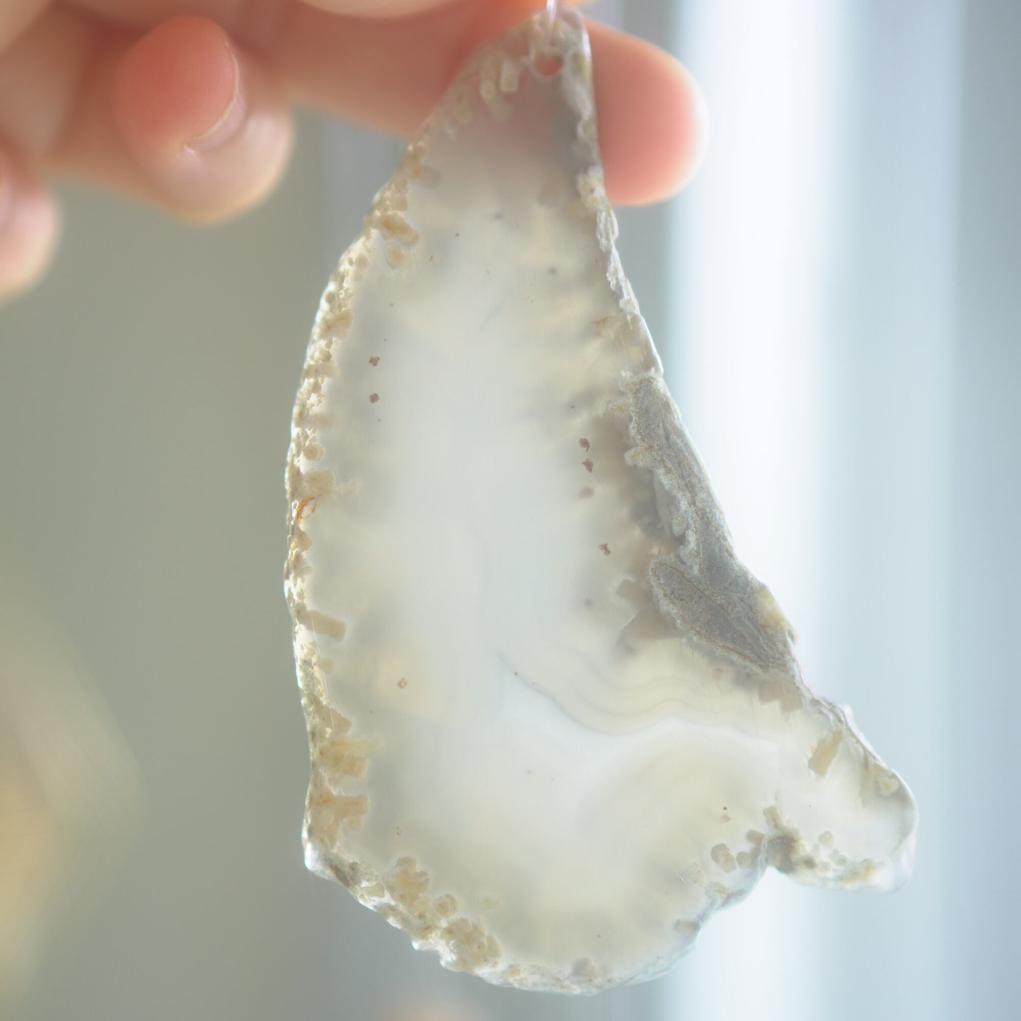 重ねる石同士の側面の加工状態によっても良い音が鳴ったり鳴らなかったり、石の見た目だけで組み合わせを決められないことが難しいポイントでもあるのですが、そんな中、たくさんの石の中から選ばれた5枚のスライスアゲートから出来上がったチャイムたちは、どこか悠々自適に空を泳ぐ妖精のようでもあり、それぞれの音を楽しそうに奏でてくれます。
