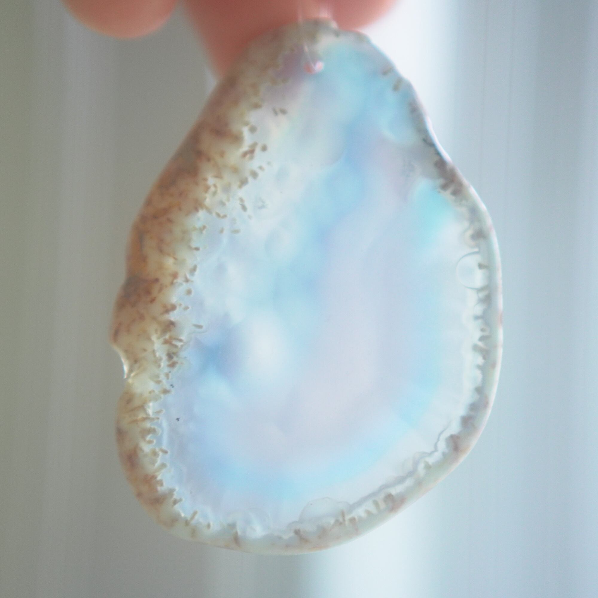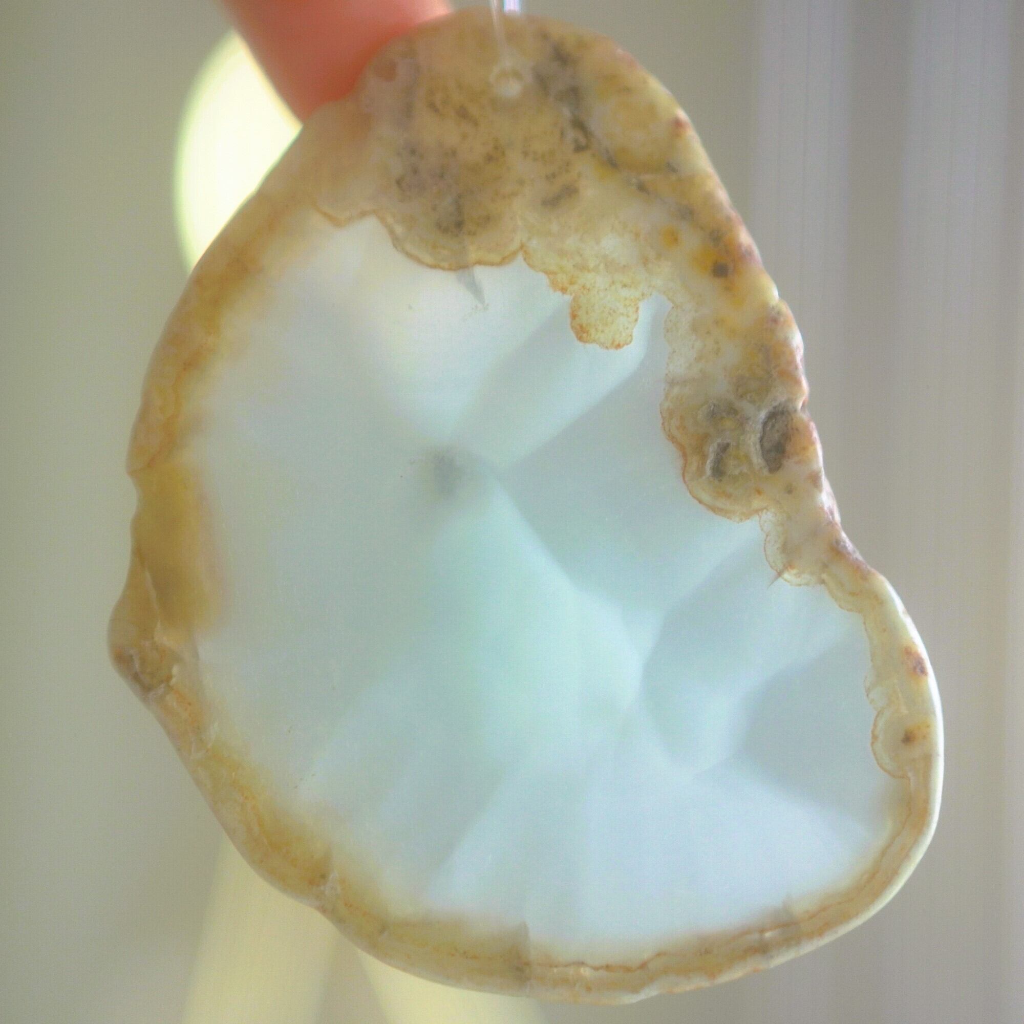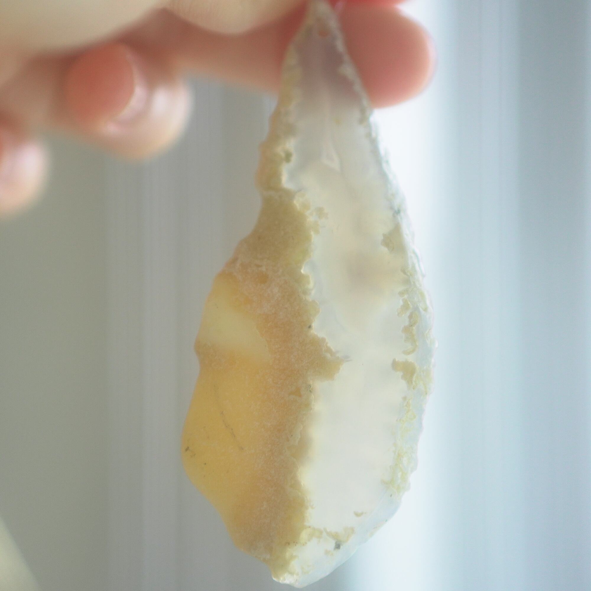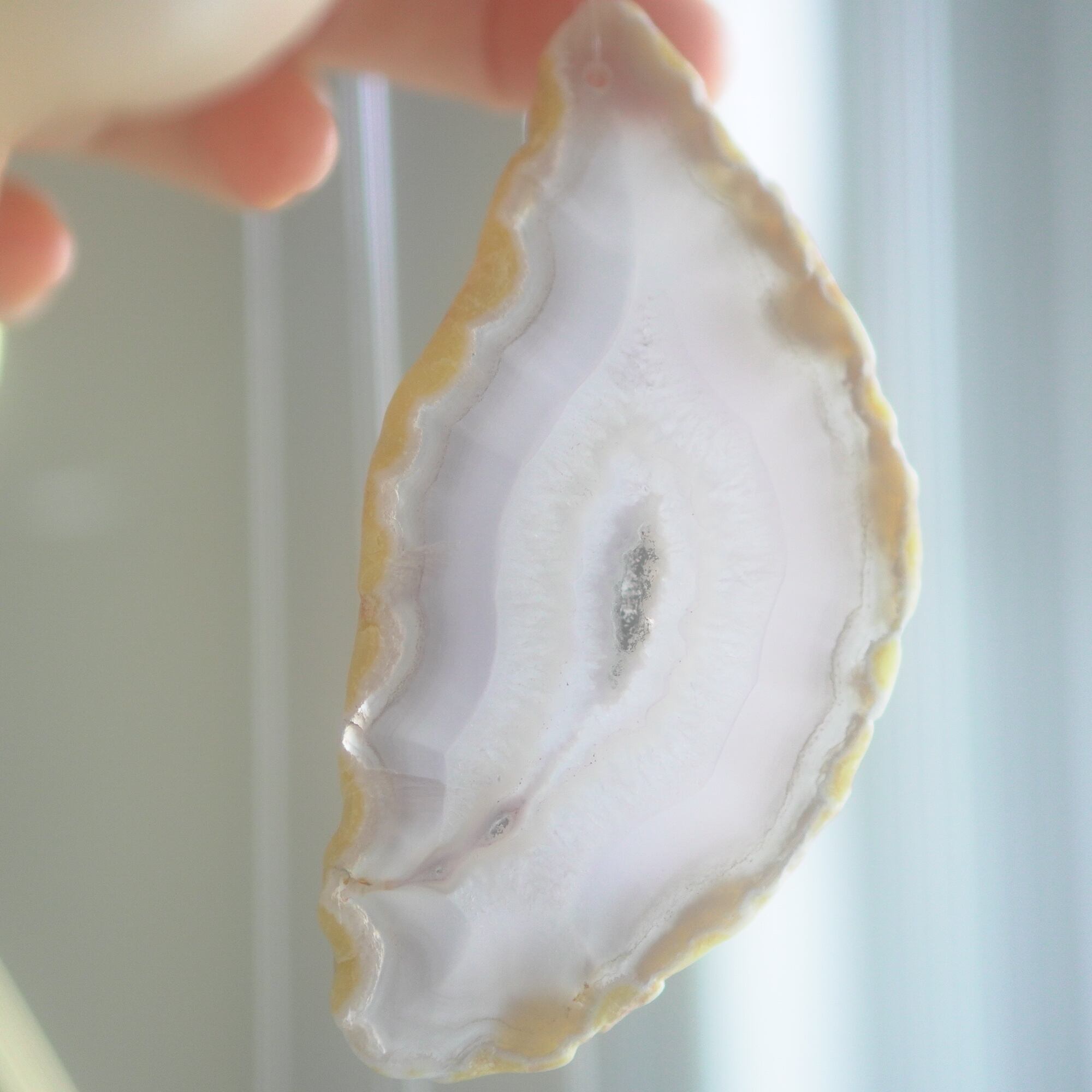 重ねる石同士の側面の加工状態によっても良い音が鳴ったり鳴らなかったり、石の見た目だけで組み合わせを決められないことが難しいポイントでもあるのですが、そんな中、たくさんの石の中から選ばれた5枚のスライスアゲートから出来上がったチャイムたちは、どこか悠々自適に空を泳ぐ妖精のようでもあり、それぞれの音を楽しそうに奏でてくれます。