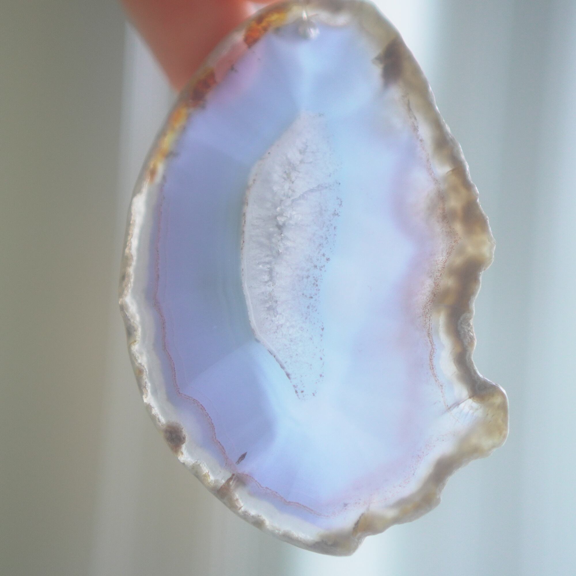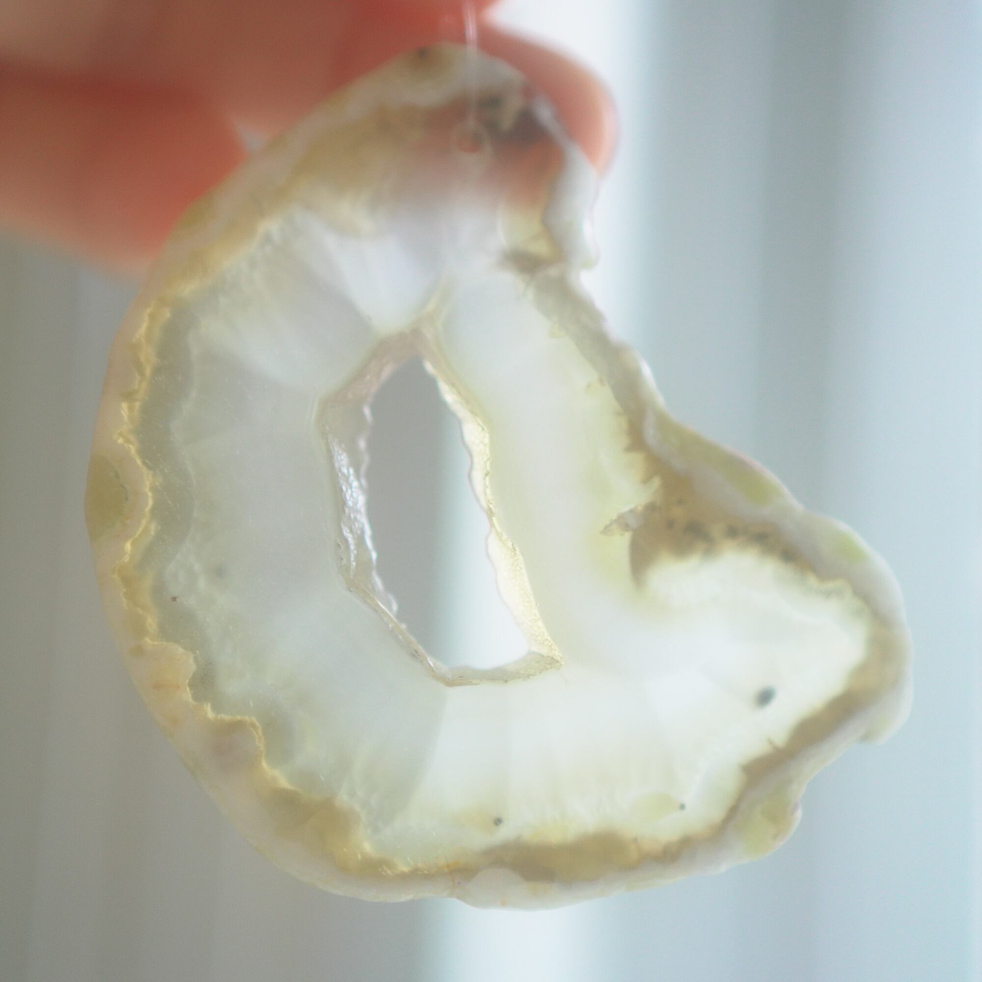 重ねる石同士の側面の加工状態によっても良い音が鳴ったり鳴らなかったり、石の見た目だけで組み合わせを決められないことが難しいポイントでもあるのですが、そんな中、たくさんの石の中から選ばれた5枚のスライスアゲートから出来上がったチャイムたちは、どこか悠々自適に空を泳ぐ妖精のようでもあり、それぞれの音を楽しそうに奏でてくれます。
