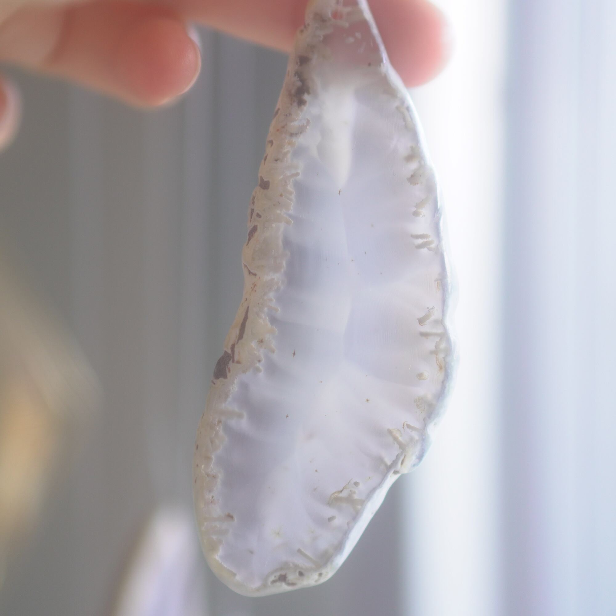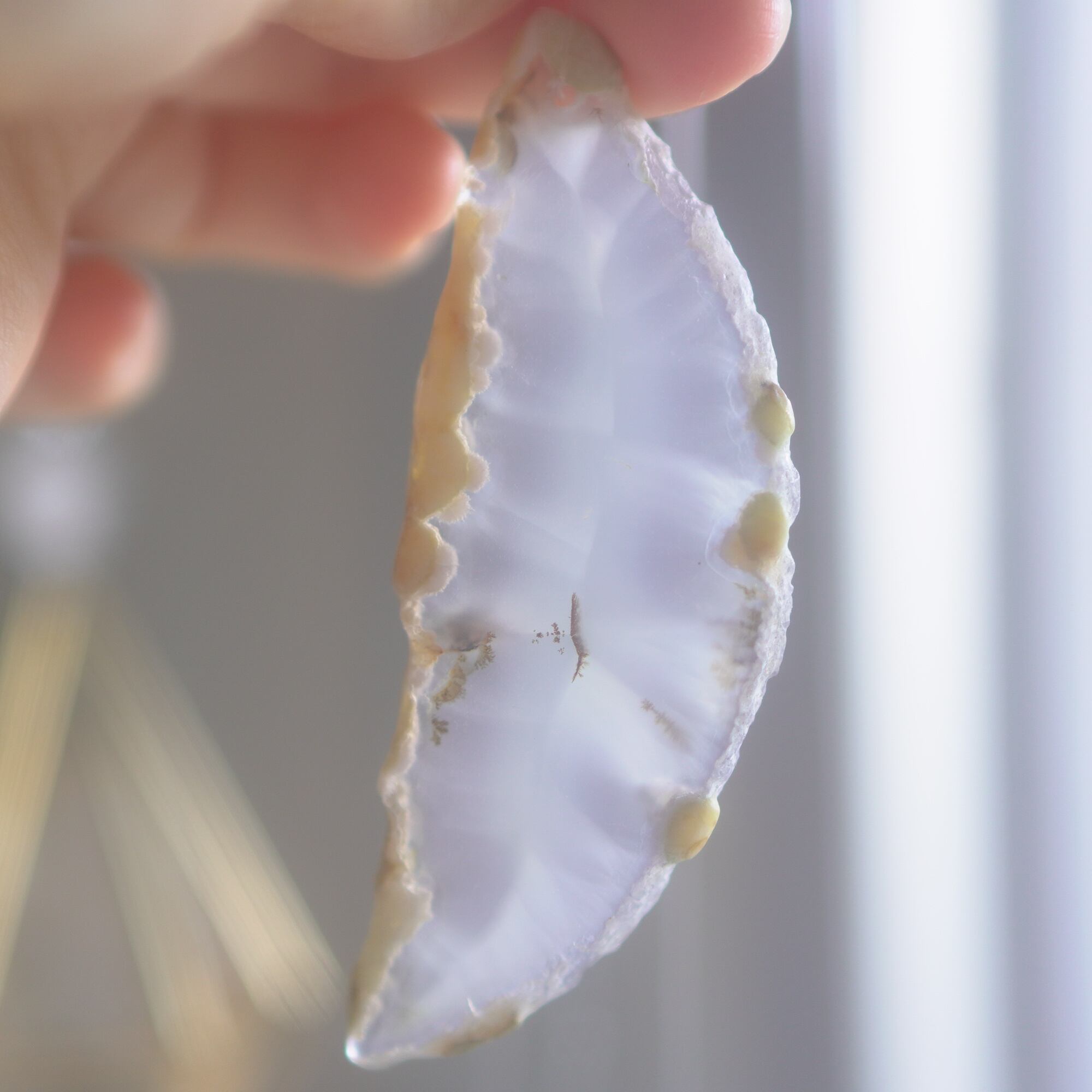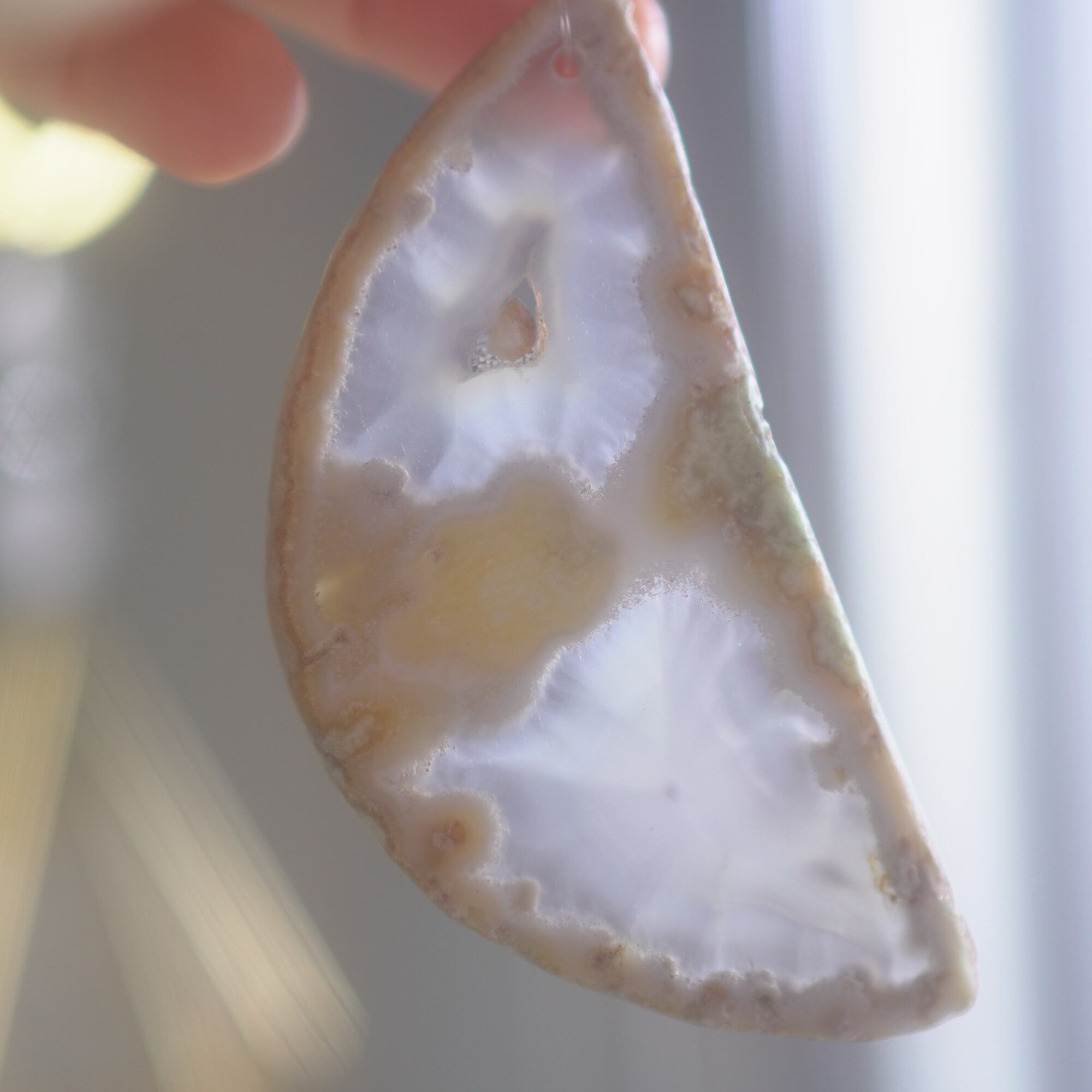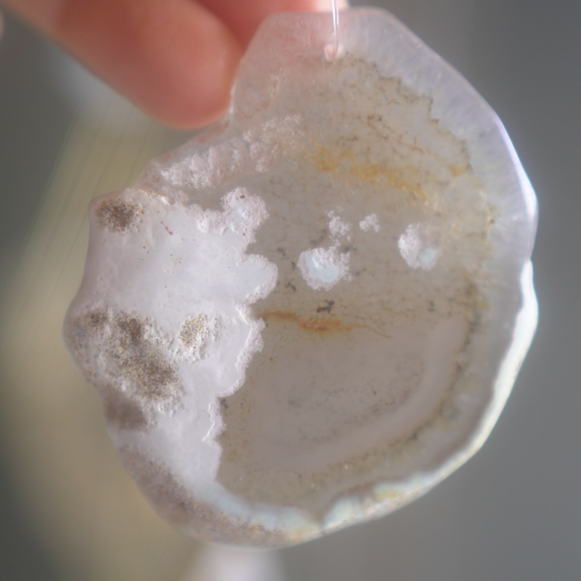 重ねる石同士の側面の加工状態によっても良い音が鳴ったり鳴らなかったり、石の見た目だけで組み合わせを決められないことが難しいポイントでもあるのですが、そんな中、たくさんの石の中から選ばれた5枚のスライスアゲートから出来上がったチャイムたちは、どこか悠々自適に空を泳ぐ妖精のようでもあり、それぞれの音を楽しそうに奏でてくれます。