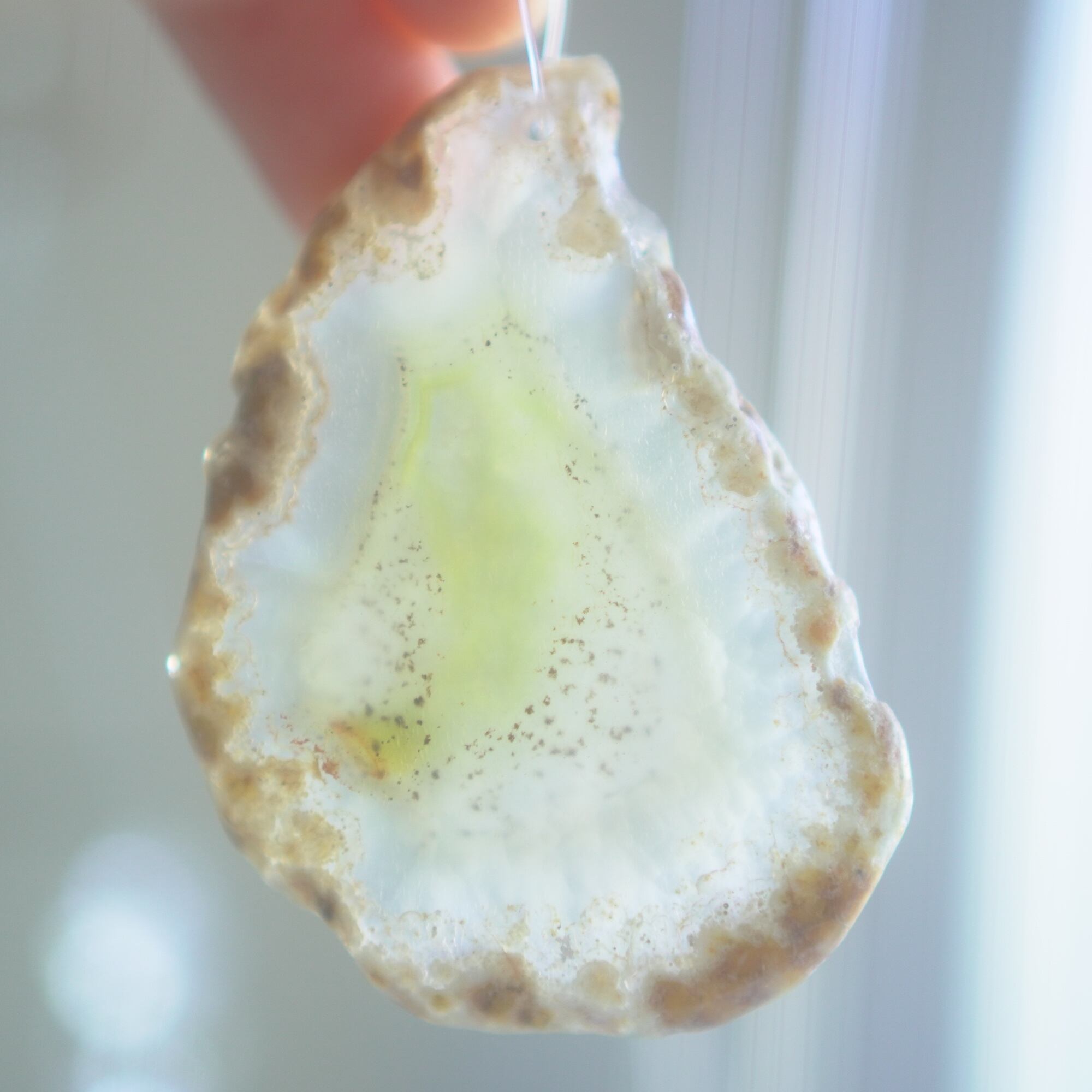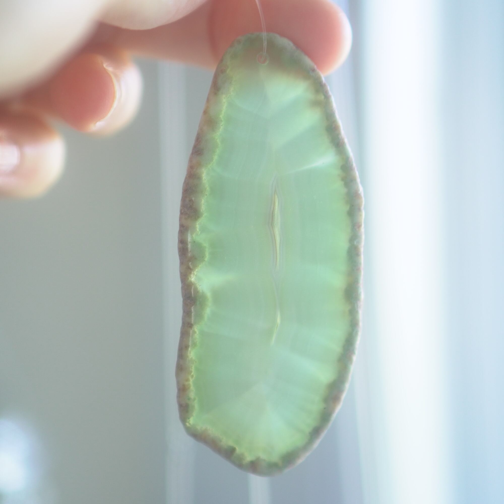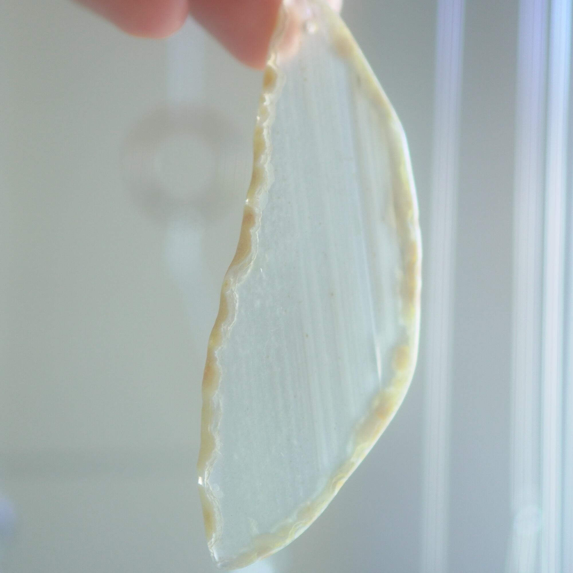 重ねる石同士の側面の加工状態によっても良い音が鳴ったり鳴らなかったり、石の見た目だけで組み合わせを決められないことが難しいポイントでもあるのですが、そんな中、たくさんの石の中から選ばれた5枚のスライスアゲートから出来上がったチャイムたちは、どこか悠々自適に空を泳ぐ妖精のようでもあり、それぞれの音を楽しそうに奏でてくれます。