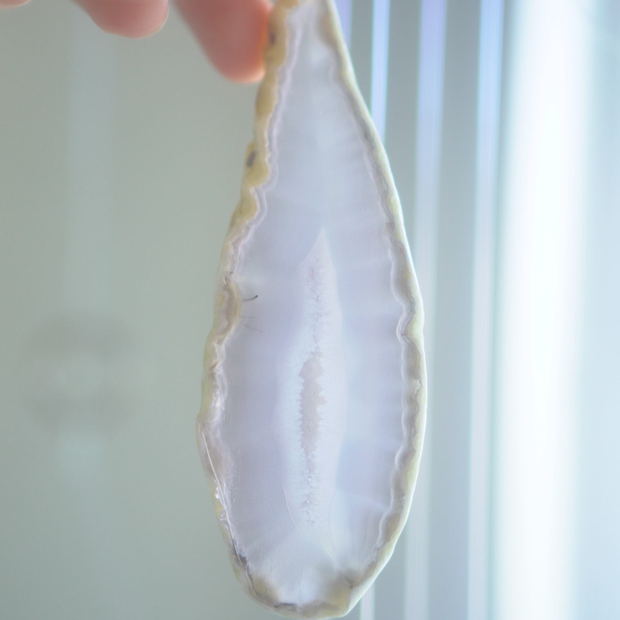 重ねる石同士の側面の加工状態によっても良い音が鳴ったり鳴らなかったり、石の見た目だけで組み合わせを決められないことが難しいポイントでもあるのですが、そんな中、たくさんの石の中から選ばれた5枚のスライスアゲートから出来上がったチャイムたちは、どこか悠々自適に空を泳ぐ妖精のようでもあり、それぞれの音を楽しそうに奏でてくれます。