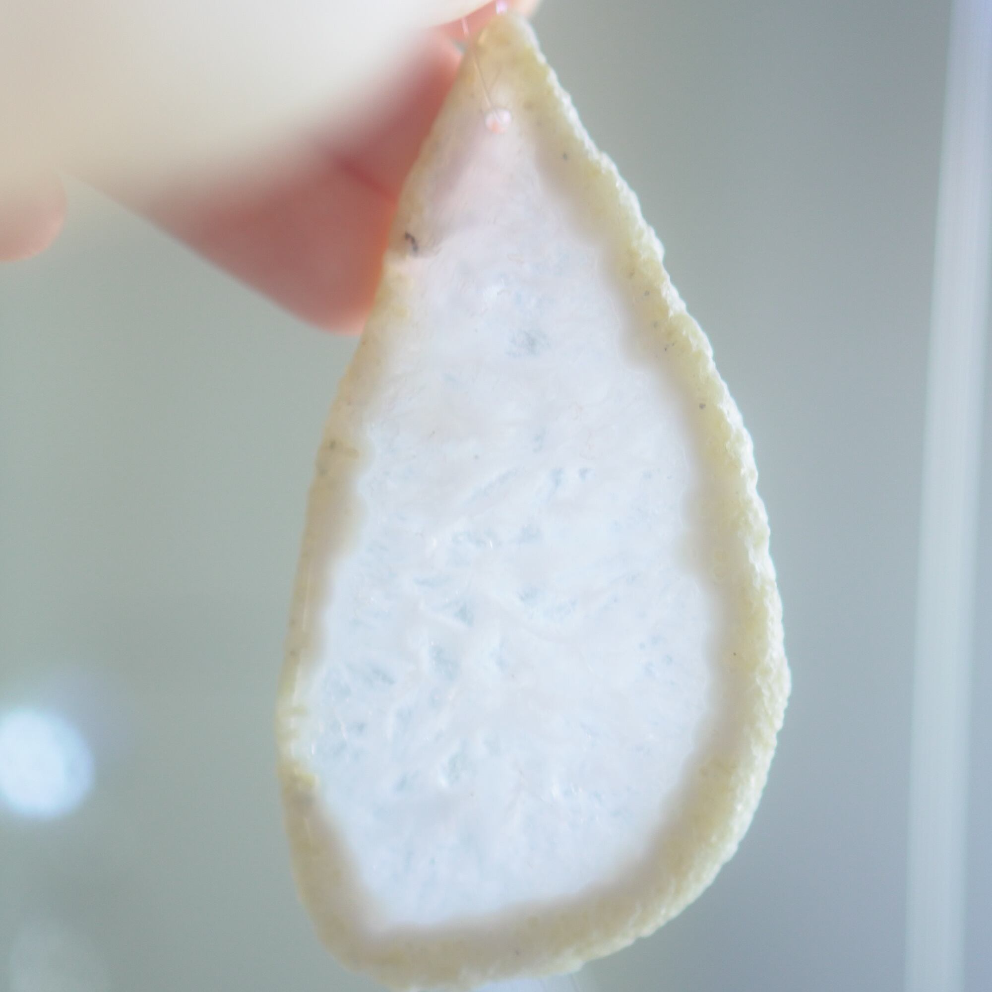 元々の瑪瑙風鈴とは使っている石の大きさや厚みが異なり、こちらのものはそれ同士重ねるだけでは特別音が鳴らない厚さのスライスアゲートを使用しているのですが、間に2本、細長い形状のアゲートを挟むことによって音が鳴る仕組みになっています。(もう少し変則的な組み合わせ方で音が鳴っていることもあります)