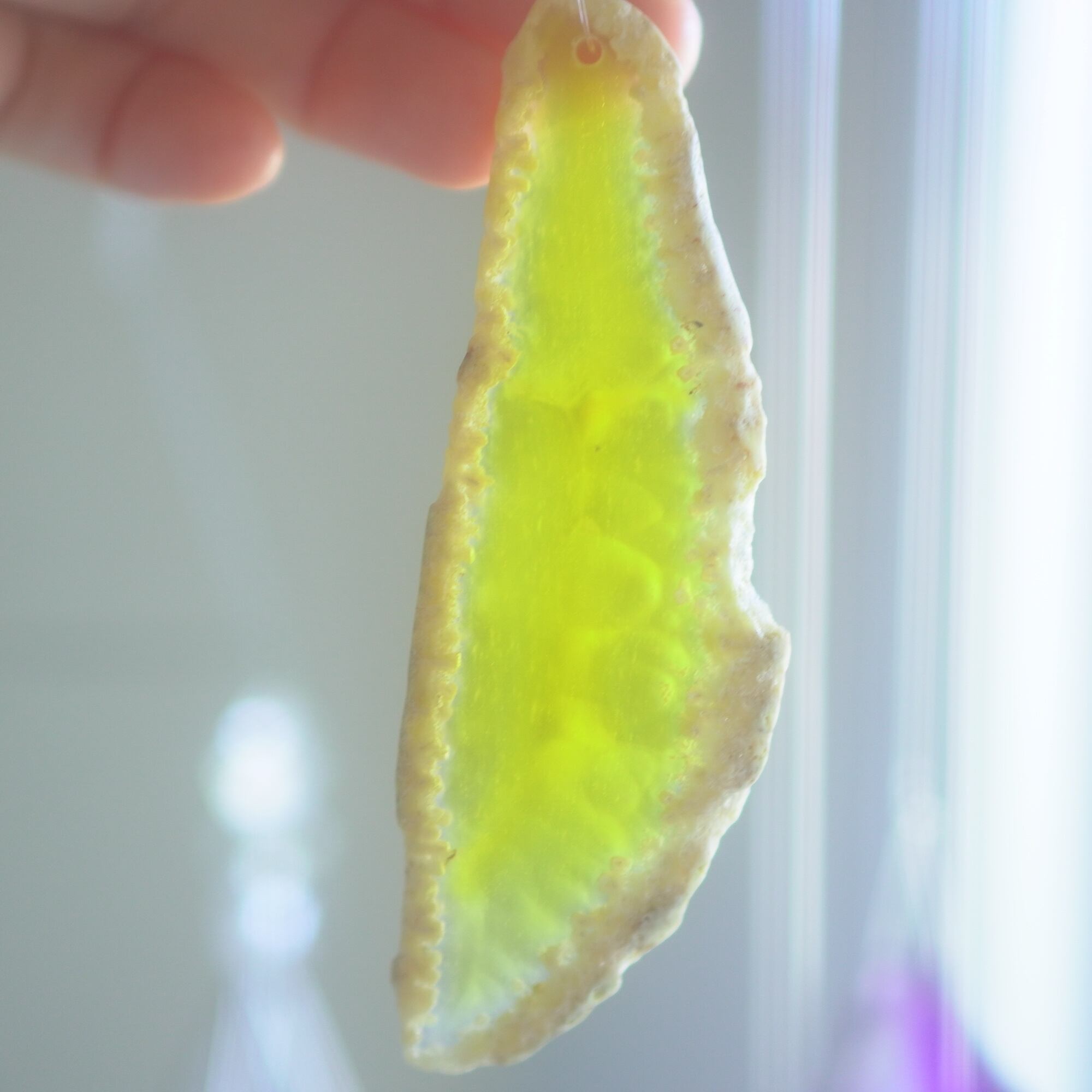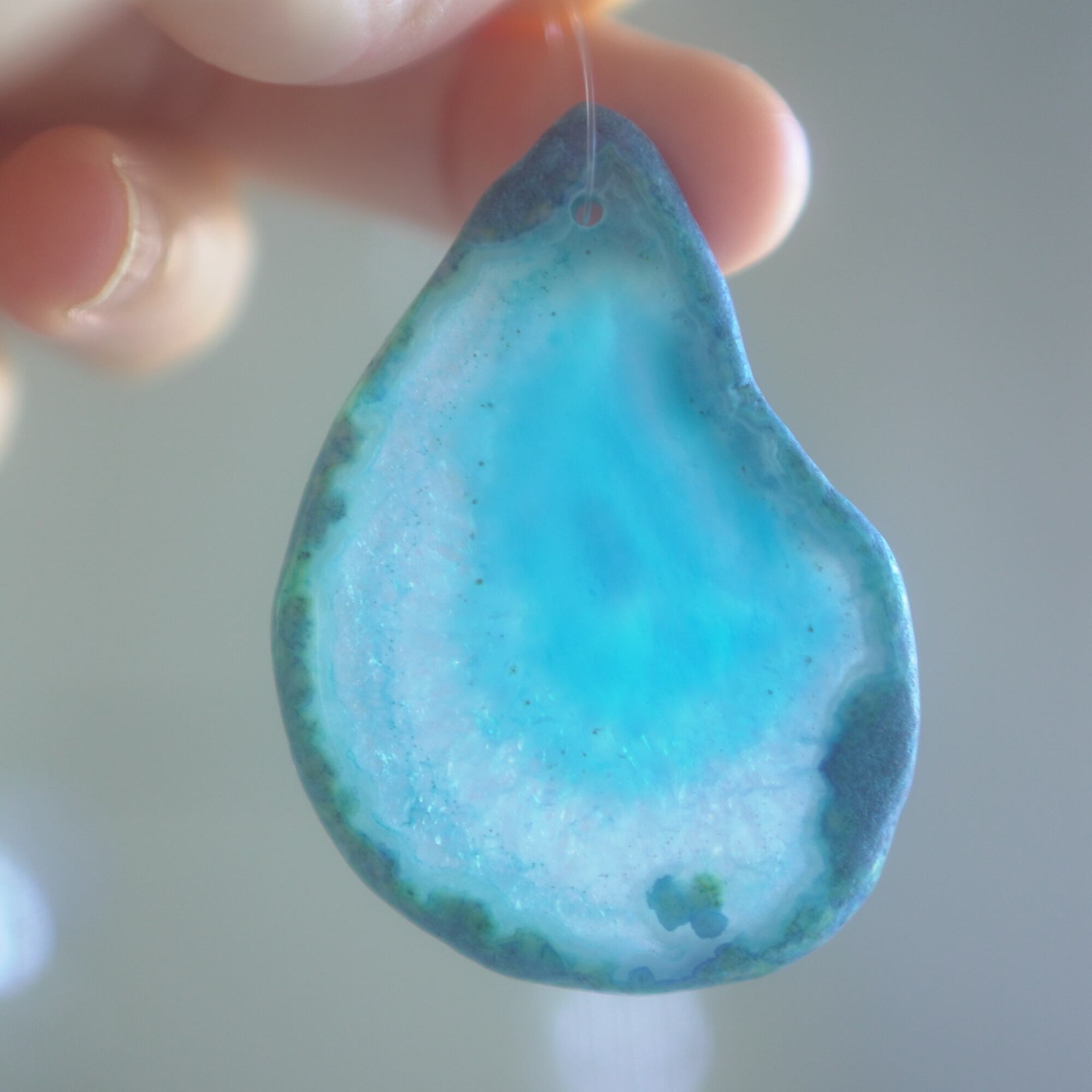 ✧染色の石なので耐光性(光による経年でのカラー変化の耐性)に優れているわけではなくベランダなど一日の中で長時間強い日光に当たるような場所に飾られるのはおすすめしないのですが、陽光に透かした時にだけ真価を発揮する美しさがありますので、是非、時折翳したりして光と一緒にお楽しみいただけたらと思います。特に濃い鮮やかな色など、色変化が気になられる場合は、日光のあまり当たらない場所に飾ってくださいね✧