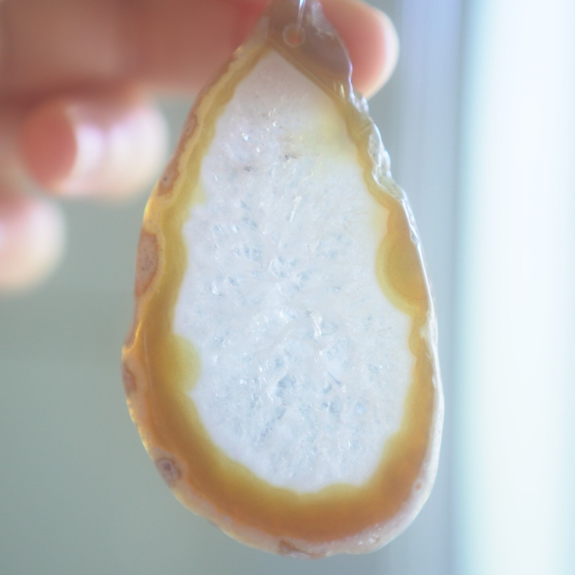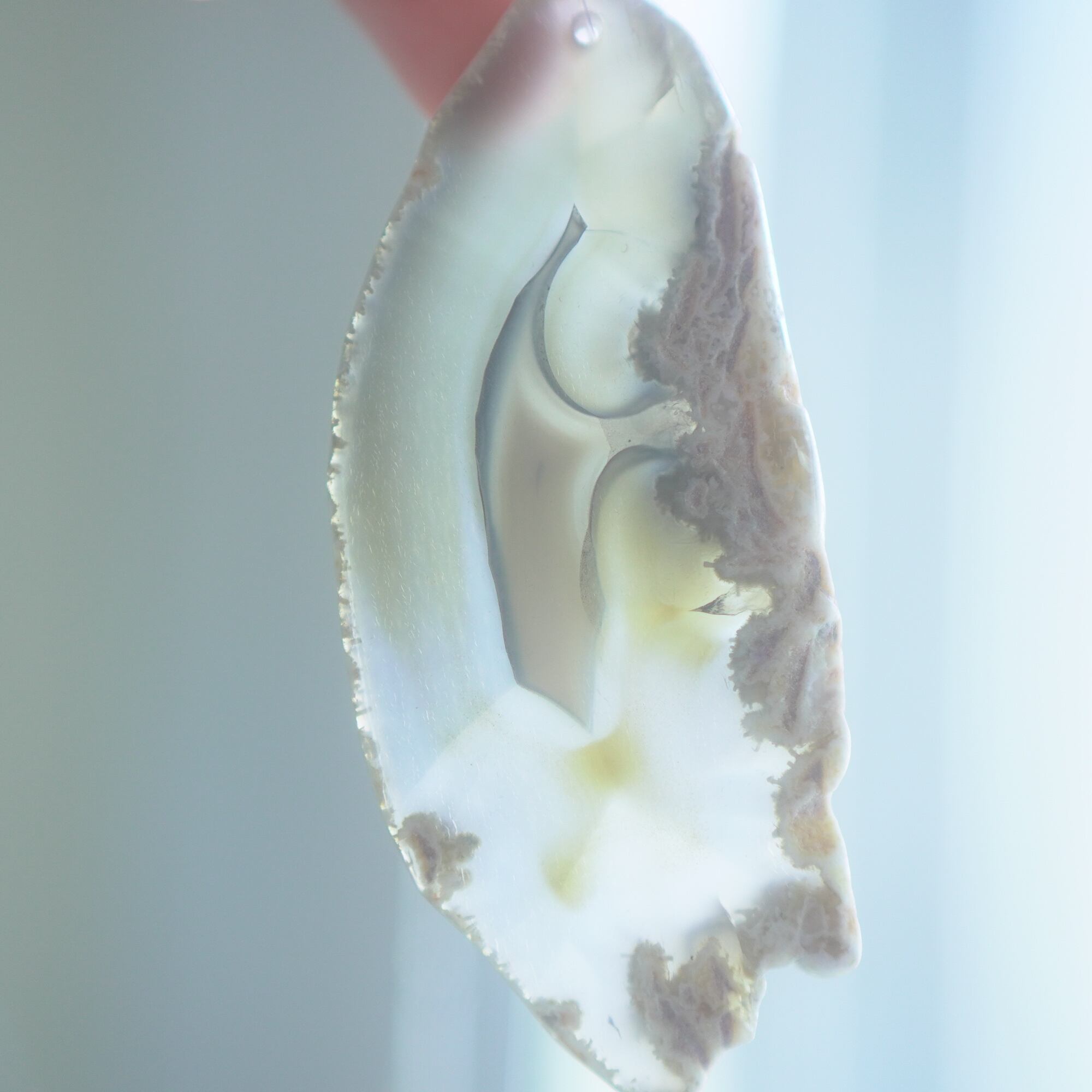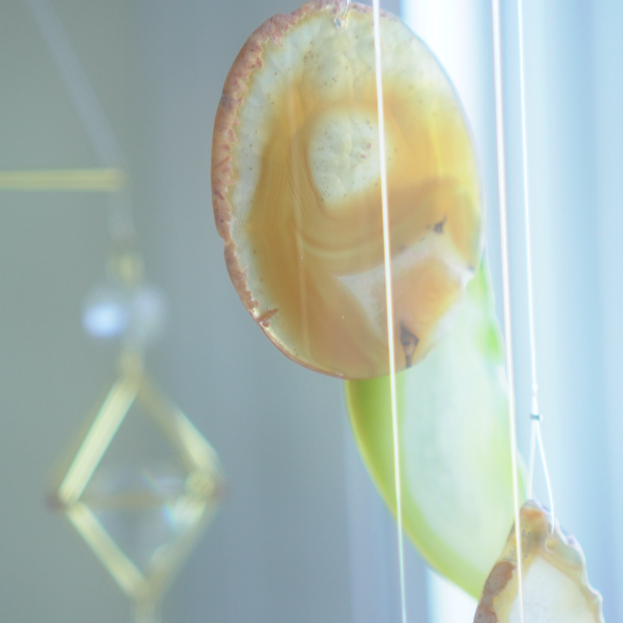 重ねる石同士の側面の加工状態によっても良い音が鳴ったり鳴らなかったり、石の見た目だけで組み合わせを決められないことが難しいポイントでもあるのですが、そんな中、たくさんの石の中から選ばれた5枚のスライスアゲートから出来上がったチャイムたちは、どこか悠々自適に空を泳ぐ妖精のようでもあり、それぞれの音を楽しそうに奏でてくれます。
