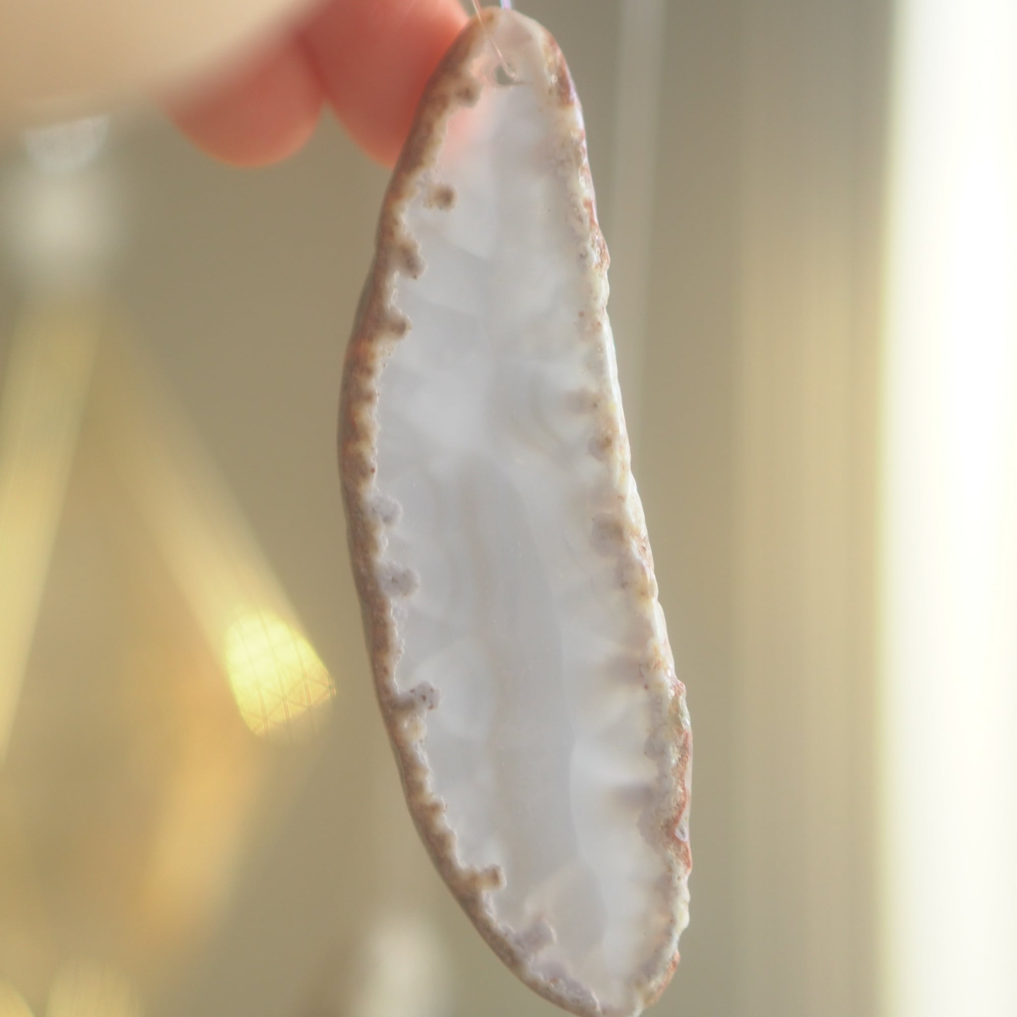 元々の瑪瑙風鈴とは使っている石の大きさや厚みが異なり、こちらのものはそれ同士重ねるだけでは特別音が鳴らない厚さのスライスアゲートを使用しているのですが、間に2本、細長い形状のアゲートを挟むことによって音が鳴る仕組みになっています。(もう少し変則的な組み合わせ方で音が鳴っていることもあります)