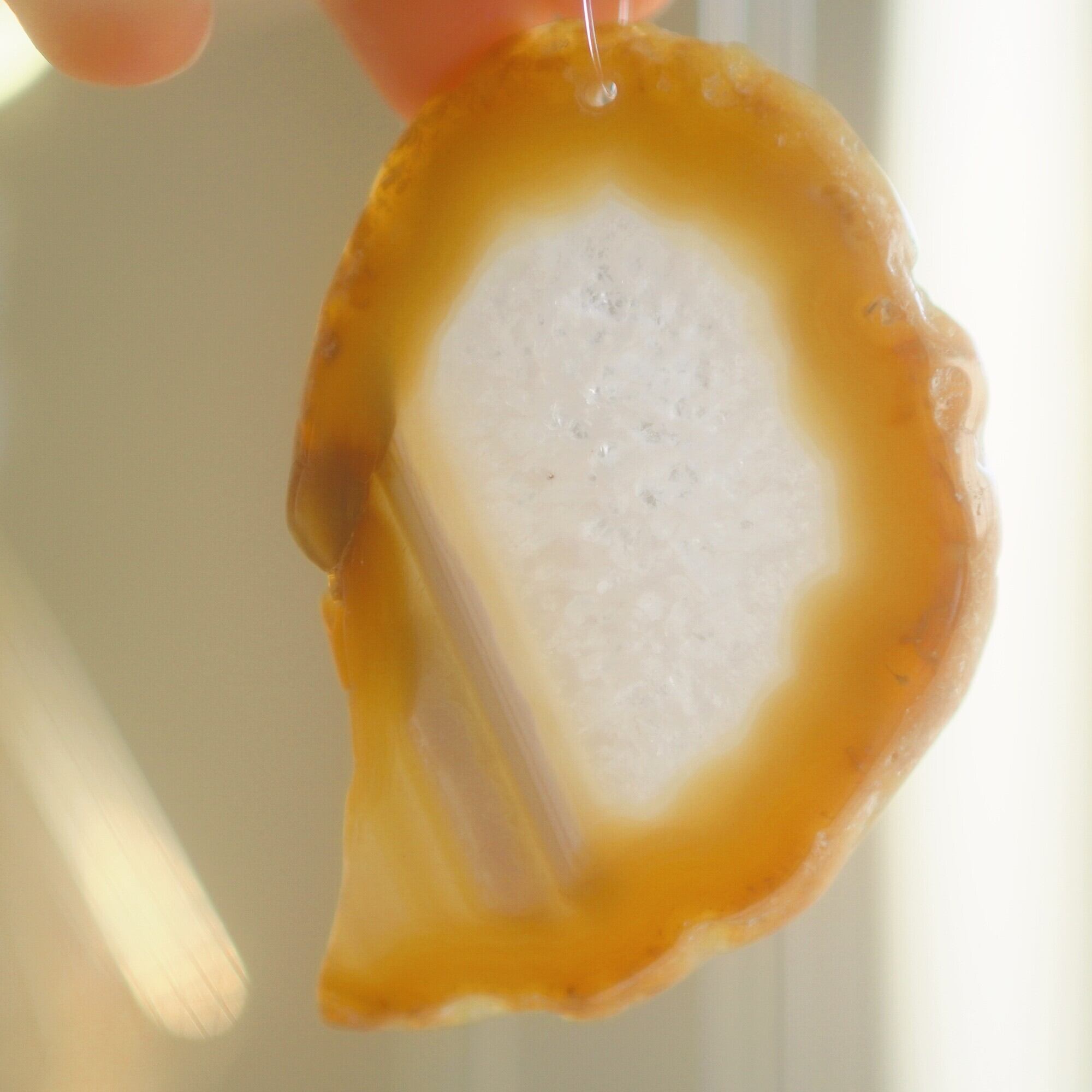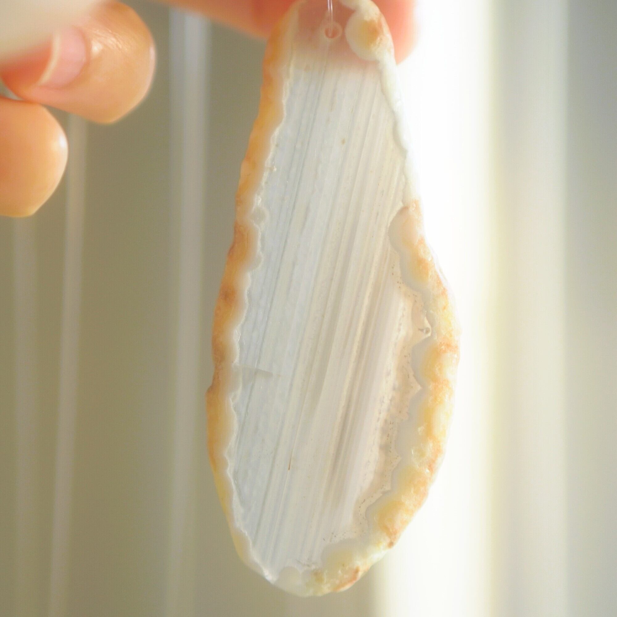 元々の瑪瑙風鈴とは使っている石の大きさや厚みが異なり、こちらのものはそれ同士重ねるだけでは特別音が鳴らない厚さのスライスアゲートを使用しているのですが、間に2本、細長い形状のアゲートを挟むことによって音が鳴る仕組みになっています。(もう少し変則的な組み合わせ方で音が鳴っていることもあります)