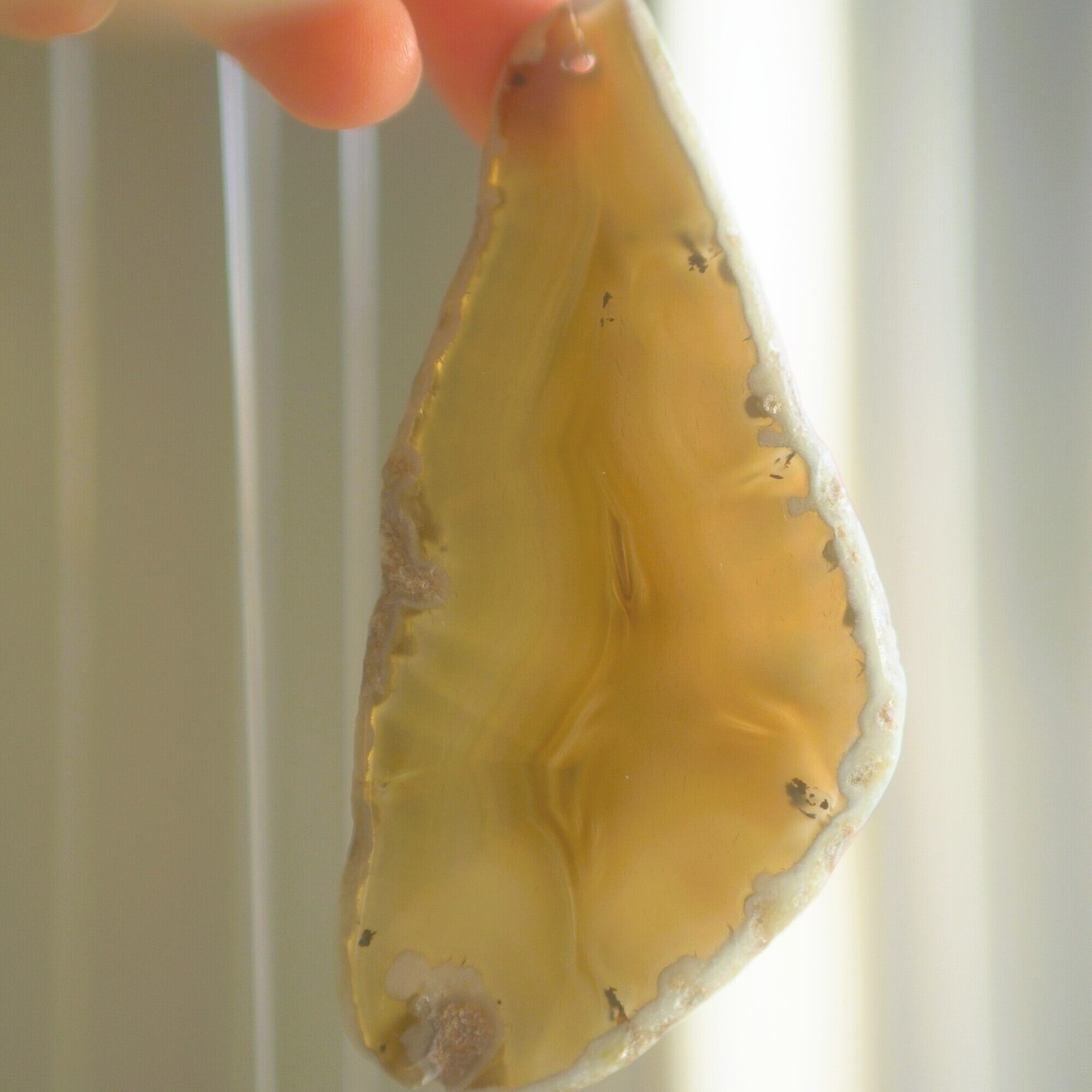 重ねる石同士の側面の加工状態によっても良い音が鳴ったり鳴らなかったり、石の見た目だけで組み合わせを決められないことが難しいポイントでもあるのですが、そんな中、たくさんの石の中から選ばれた5枚のスライスアゲートから出来上がったチャイムたちは、どこか悠々自適に空を泳ぐ妖精のようでもあり、それぞれの音を楽しそうに奏でてくれます。