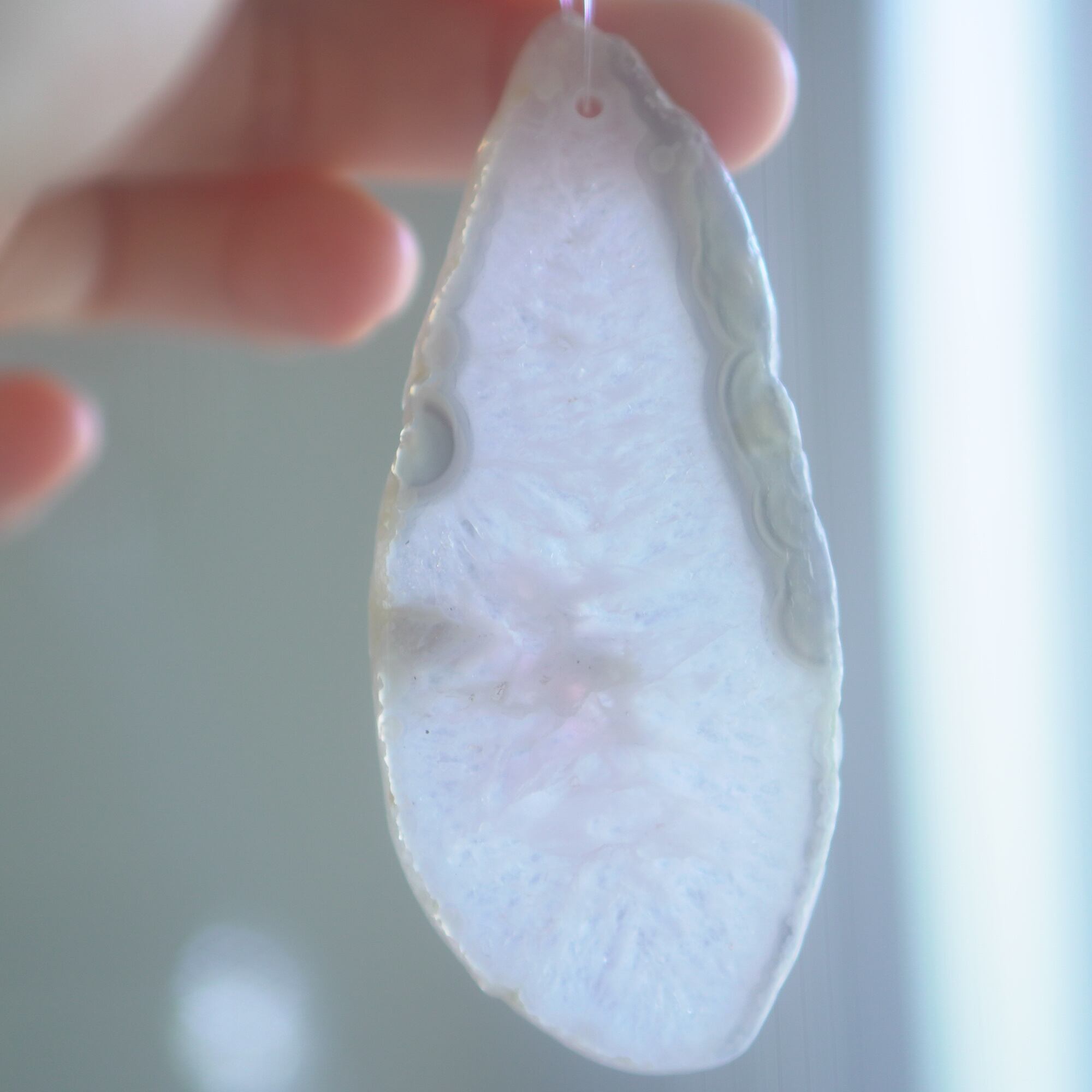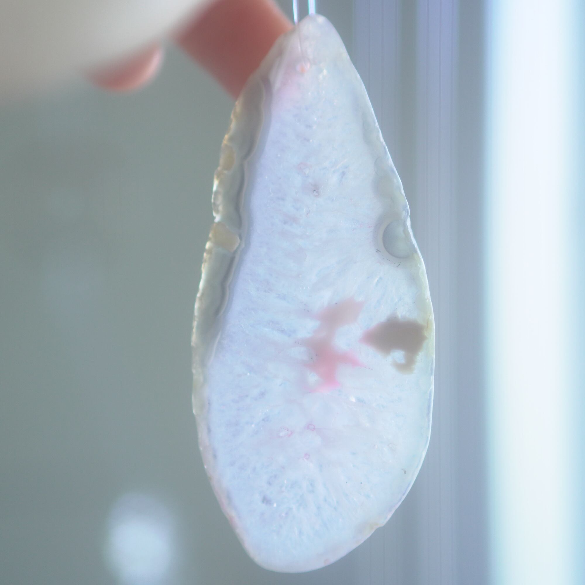 重ねる石同士の側面の加工状態によっても良い音が鳴ったり鳴らなかったり、石の見た目だけで組み合わせを決められないことが難しいポイントでもあるのですが、そんな中、たくさんの石の中から選ばれた5枚のスライスアゲートから出来上がったチャイムたちは、どこか悠々自適に空を泳ぐ妖精のようでもあり、それぞれの音を楽しそうに奏でてくれます。