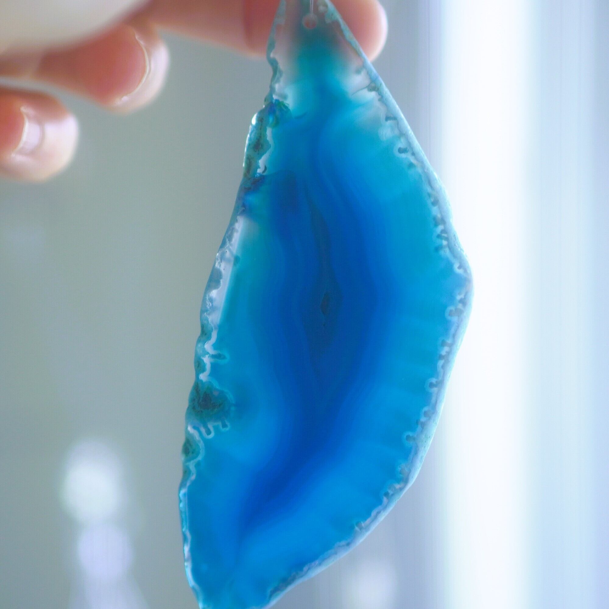 ✧染色の石なので耐光性(光による経年でのカラー変化の耐性)に優れているわけではなくベランダなど一日の中で長時間強い日光に当たるような場所に飾られるのはおすすめしないのですが、陽光に透かした時にだけ真価を発揮する美しさがありますので、是非、時折翳したりして光と一緒にお楽しみいただけたらと思います。特に濃い鮮やかな色など、色変化が気になられる場合は、日光のあまり当たらない場所に飾ってくださいね✧
