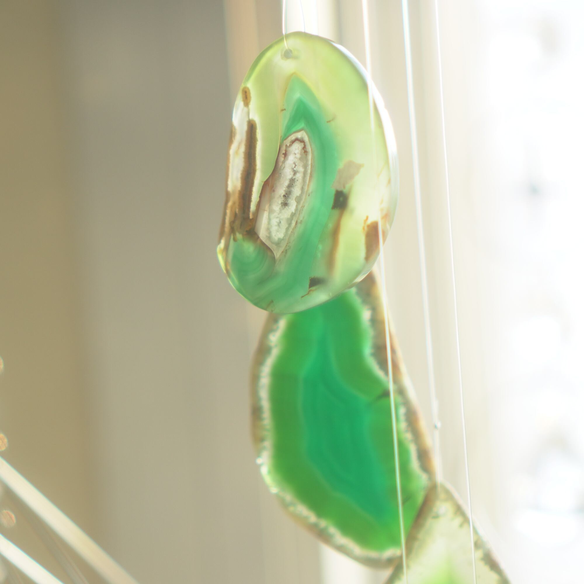 重ねる石同士の側面の加工状態によっても良い音が鳴ったり鳴らなかったり、石の見た目だけで組み合わせを決められないことが難しいポイントでもあるのですが、そんな中、たくさんの石の中から選ばれた5枚のスライスアゲートから出来上がったチャイムたちは、どこか悠々自適に空を泳ぐ妖精のようでもあり、それぞれの音を楽しそうに奏でてくれます。