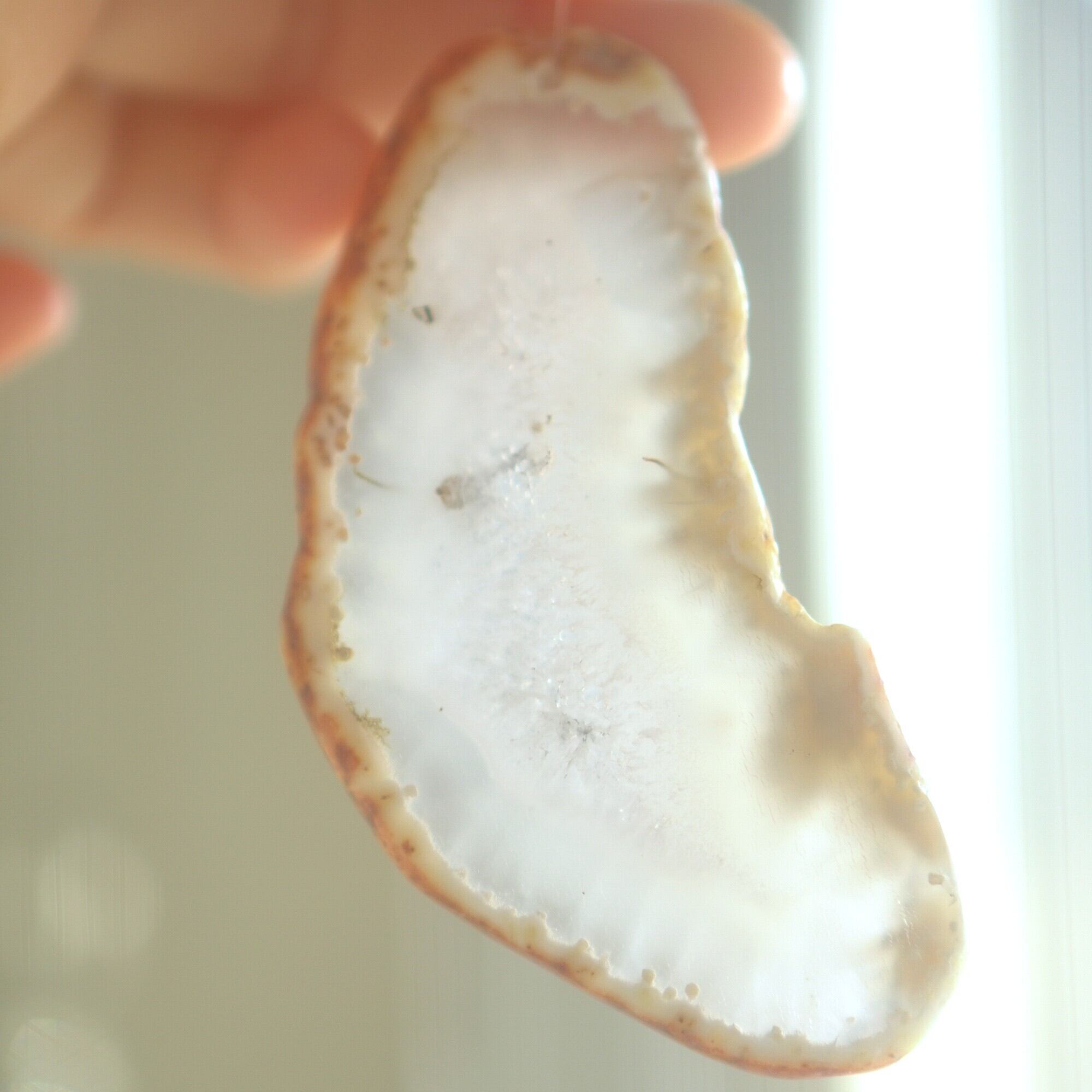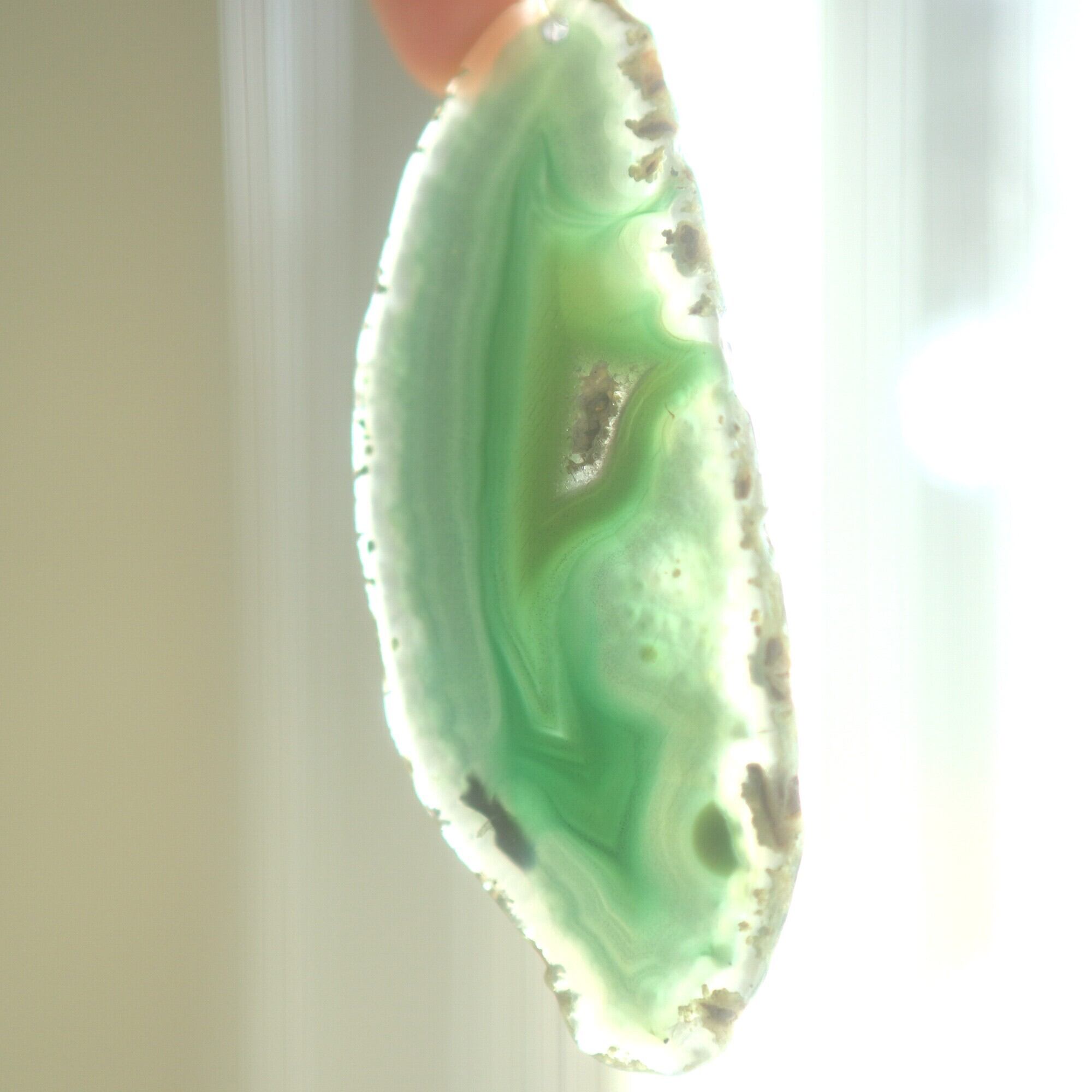 重ねる石同士の側面の加工状態によっても良い音が鳴ったり鳴らなかったり、石の見た目だけで組み合わせを決められないことが難しいポイントでもあるのですが、そんな中、たくさんの石の中から選ばれた5枚のスライスアゲートから出来上がったチャイムたちは、どこか悠々自適に空を泳ぐ妖精のようでもあり、それぞれの音を楽しそうに奏でてくれます。