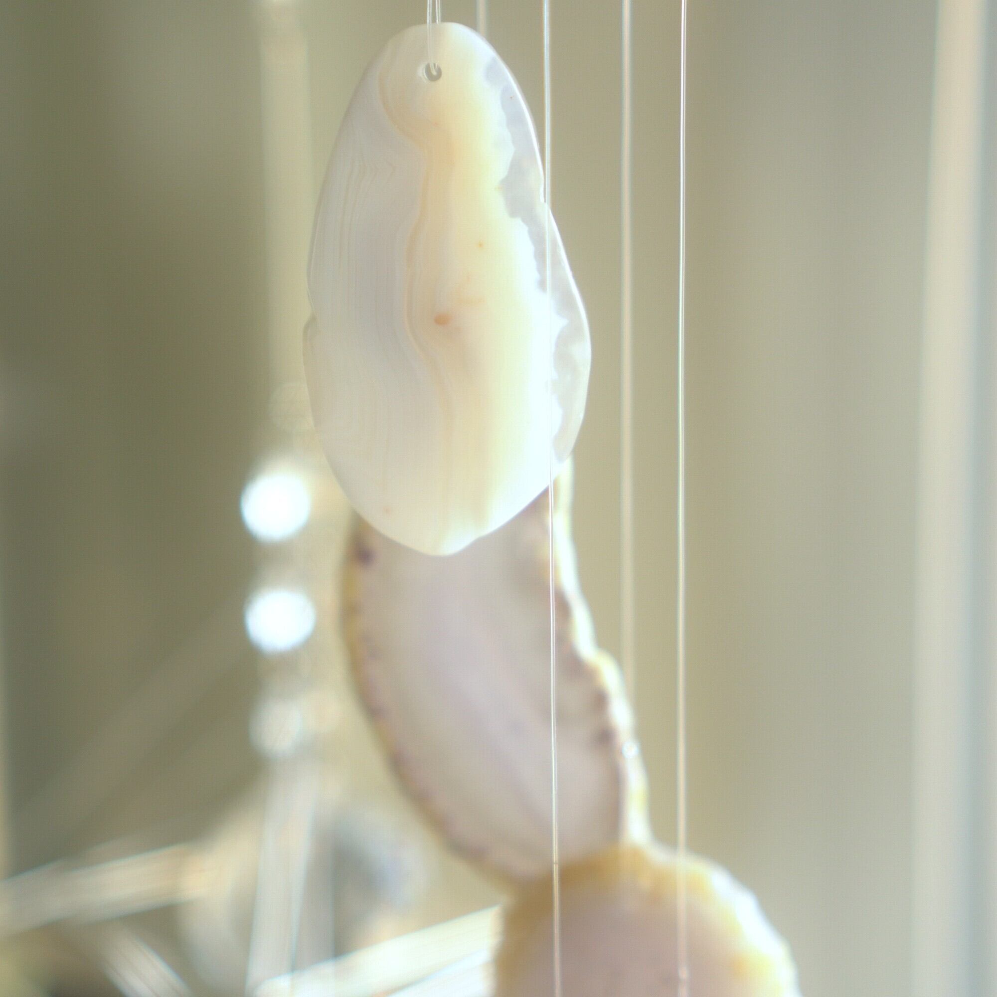 元々の瑪瑙風鈴とは使っている石の大きさや厚みが異なり、こちらのものはそれ同士重ねるだけでは特別音が鳴らない厚さのスライスアゲートを使用しているのですが、間に2本、細長い形状のアゲートを挟むことによって音が鳴る仕組みになっています。(もう少し変則的な組み合わせ方で音が鳴っていることもあります)