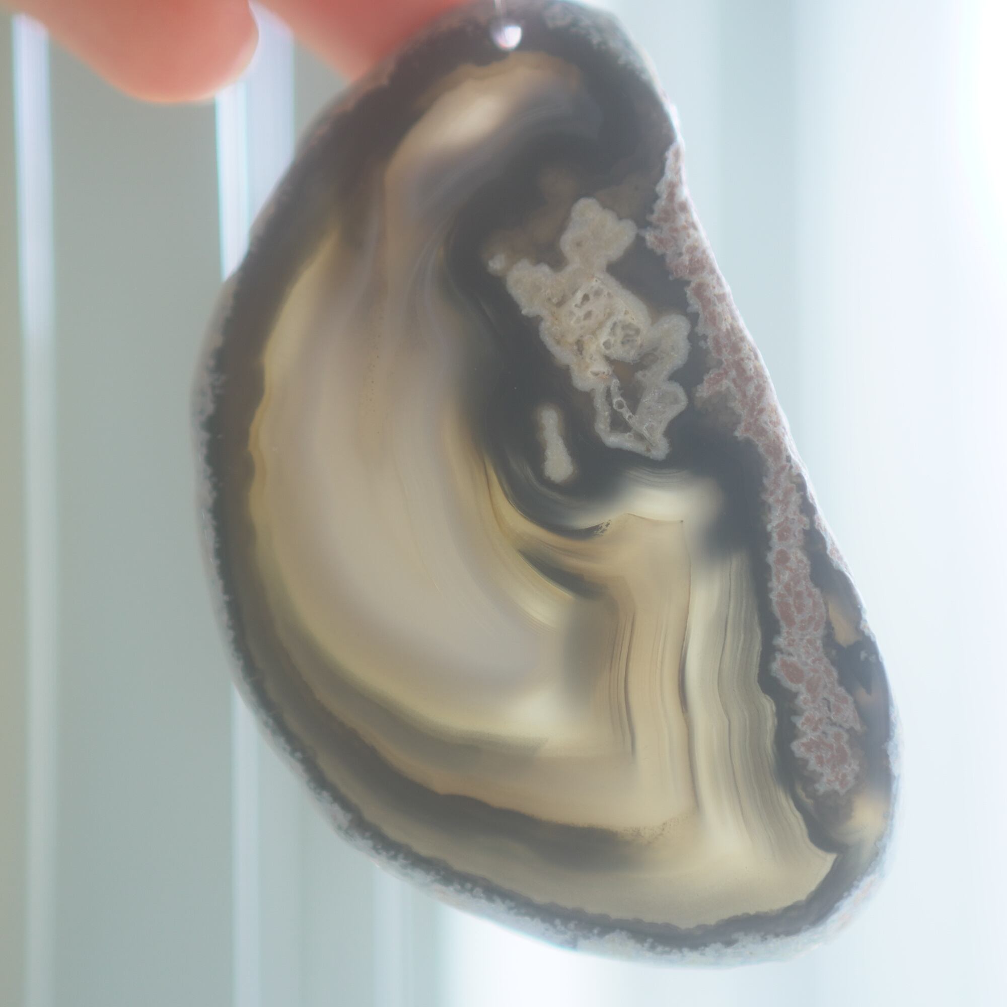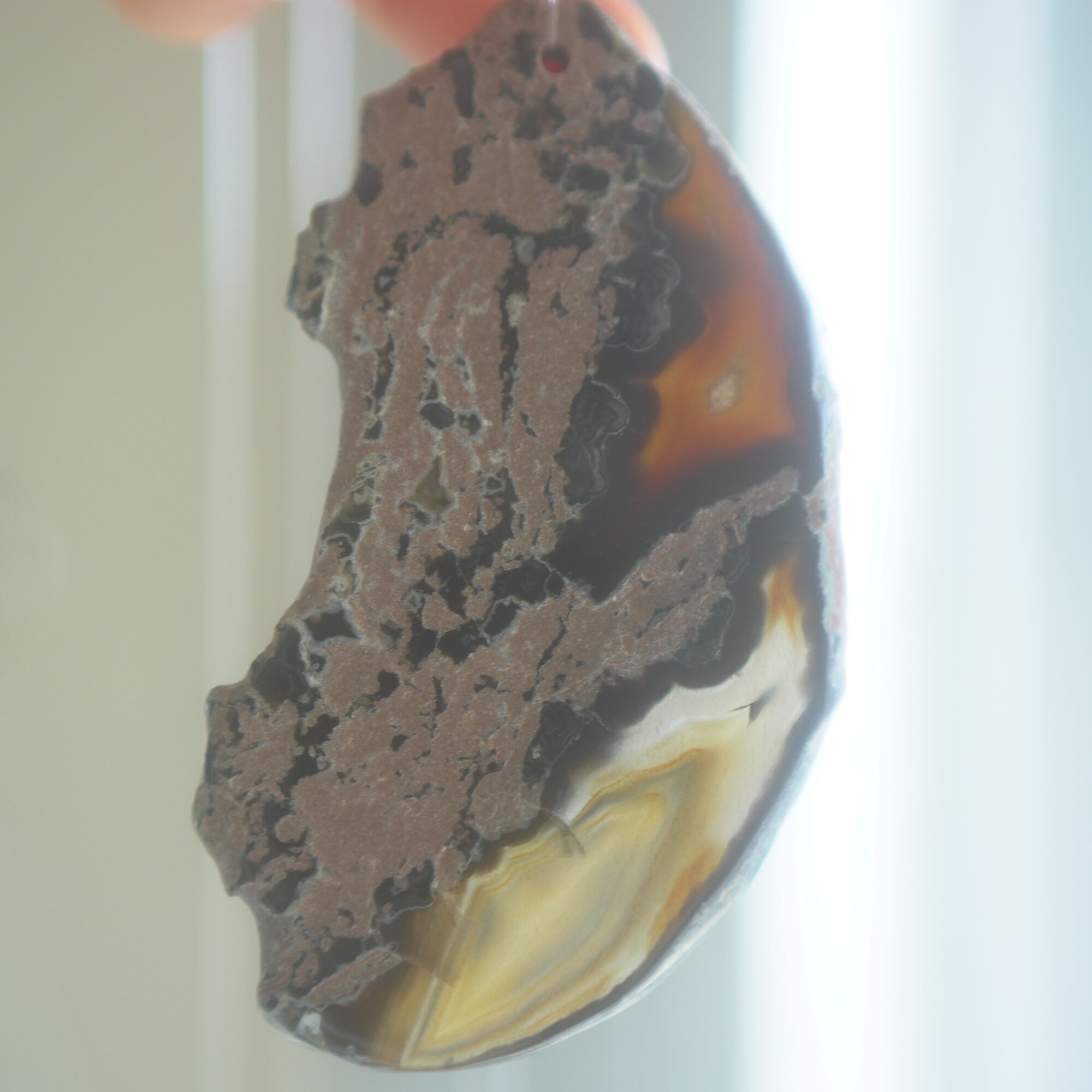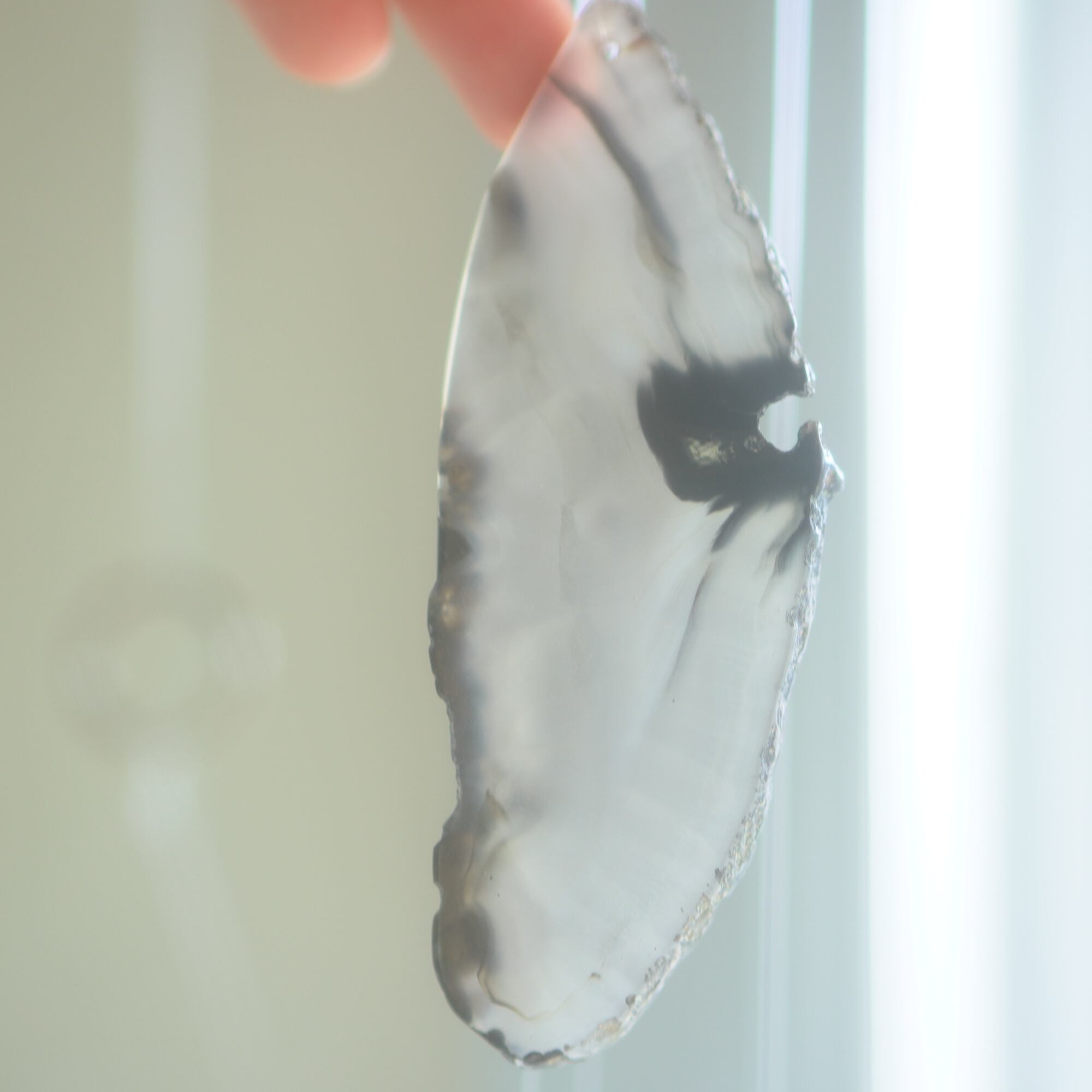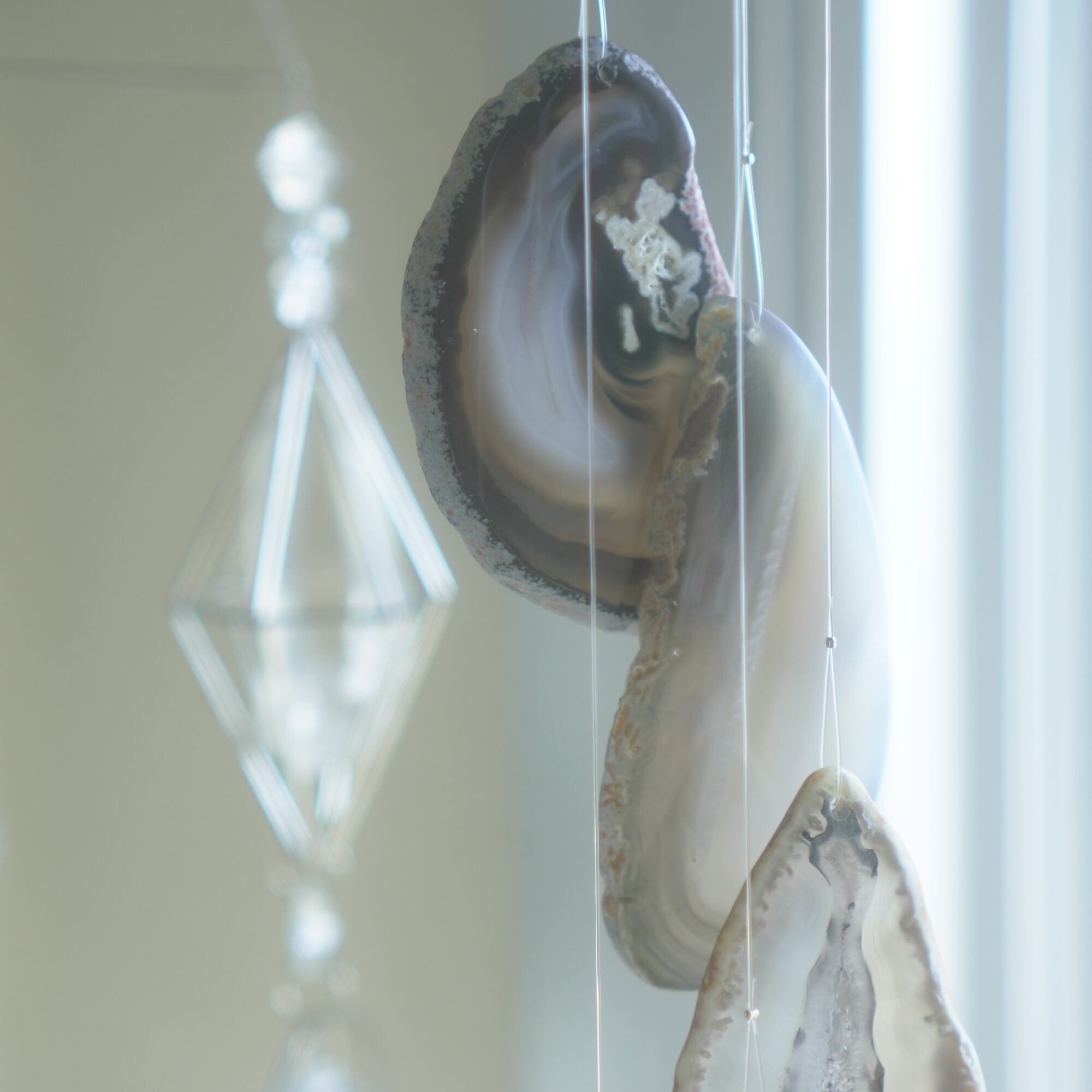 重ねる石同士の側面の加工状態によっても良い音が鳴ったり鳴らなかったり、石の見た目だけで組み合わせを決められないことが難しいポイントでもあるのですが、そんな中、たくさんの石の中から選ばれた5枚のスライスアゲートから出来上がったチャイムたちは、どこか悠々自適に空を泳ぐ妖精のようでもあり、それぞれの音を楽しそうに奏でてくれます。