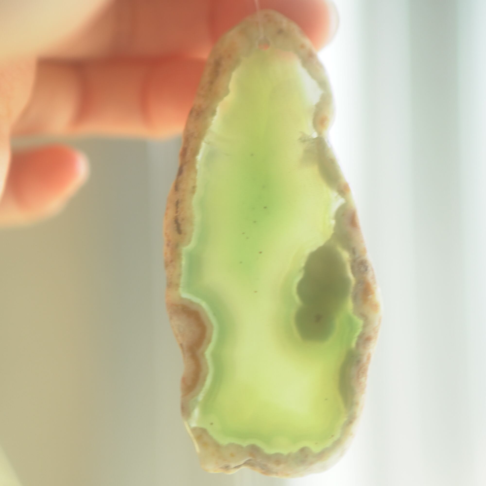 重ねる石同士の側面の加工状態によっても良い音が鳴ったり鳴らなかったり、石の見た目だけで組み合わせを決められないことが難しいポイントでもあるのですが、そんな中、たくさんの石の中から選ばれた5枚のスライスアゲートから出来上がったチャイムたちは、どこか悠々自適に空を泳ぐ妖精のようでもあり、それぞれの音を楽しそうに奏でてくれます。