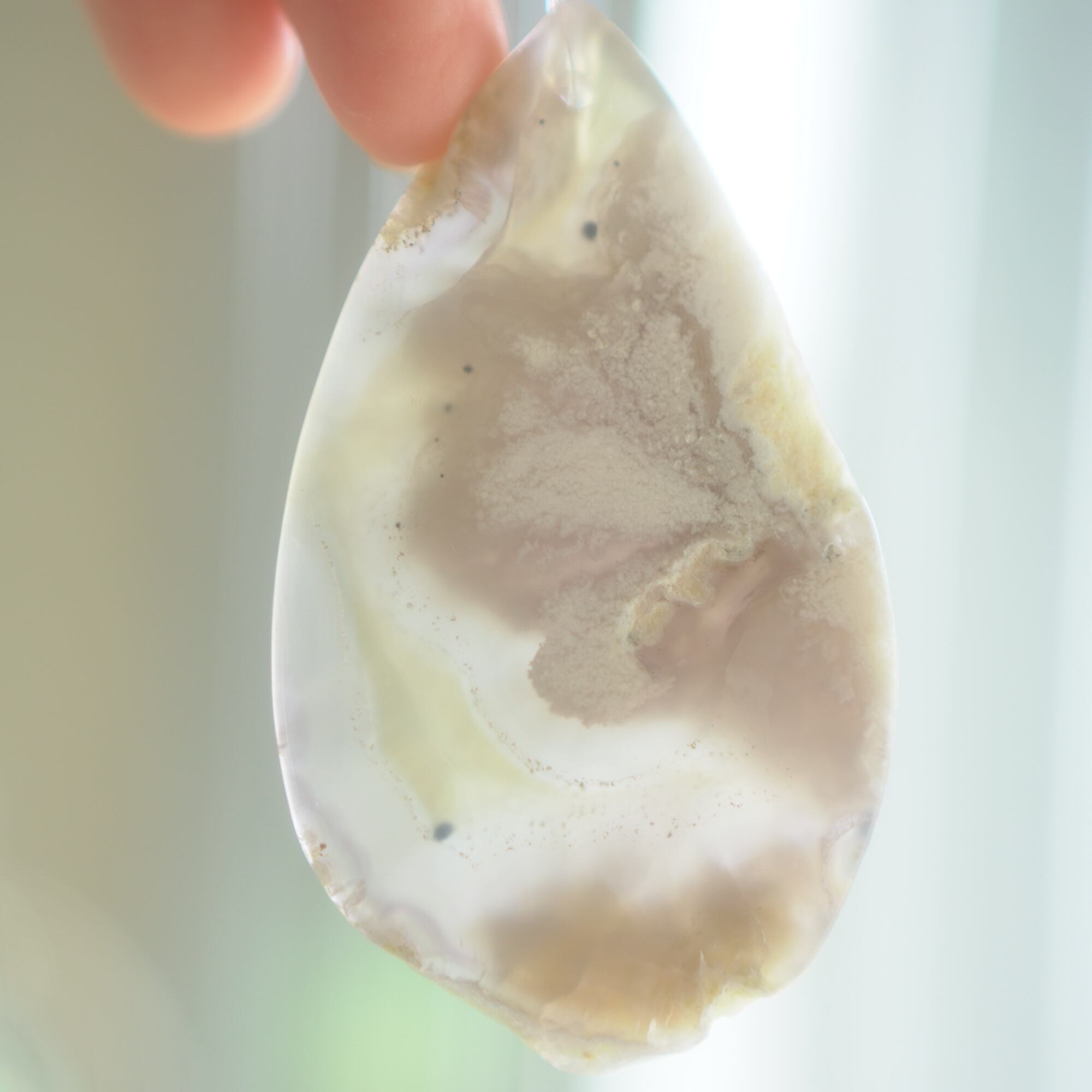 重ねる石同士の側面の加工状態によっても良い音が鳴ったり鳴らなかったり、石の見た目だけで組み合わせを決められないことが難しいポイントでもあるのですが、そんな中、たくさんの石の中から選ばれた5枚のスライスアゲートから出来上がったチャイムたちは、どこか悠々自適に空を泳ぐ妖精のようでもあり、それぞれの音を楽しそうに奏でてくれます。