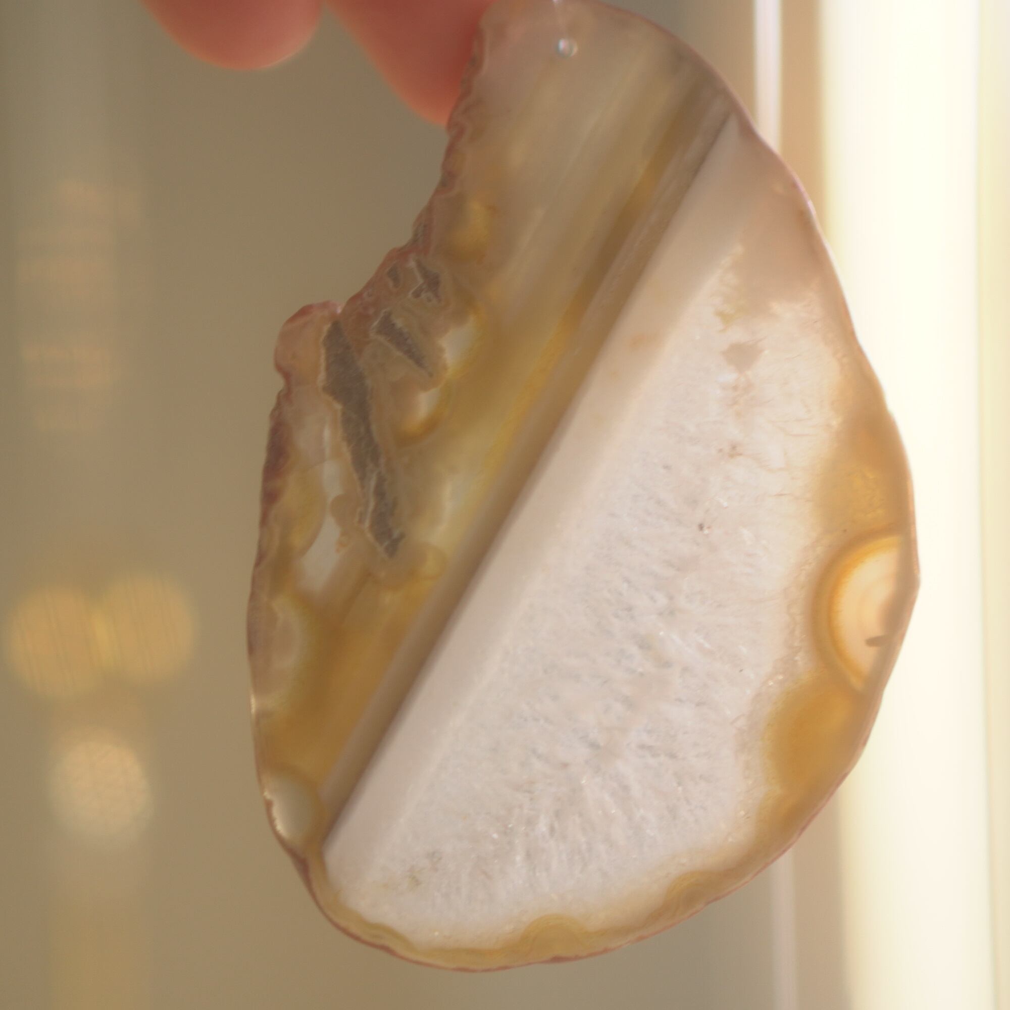 重ねる石同士の側面の加工状態によっても良い音が鳴ったり鳴らなかったり、石の見た目だけで組み合わせを決められないことが難しいポイントでもあるのですが、そんな中、たくさんの石の中から選ばれた5枚のスライスアゲートから出来上がったチャイムたちは、どこか悠々自適に空を泳ぐ妖精のようでもあり、それぞれの音を楽しそうに奏でてくれます。