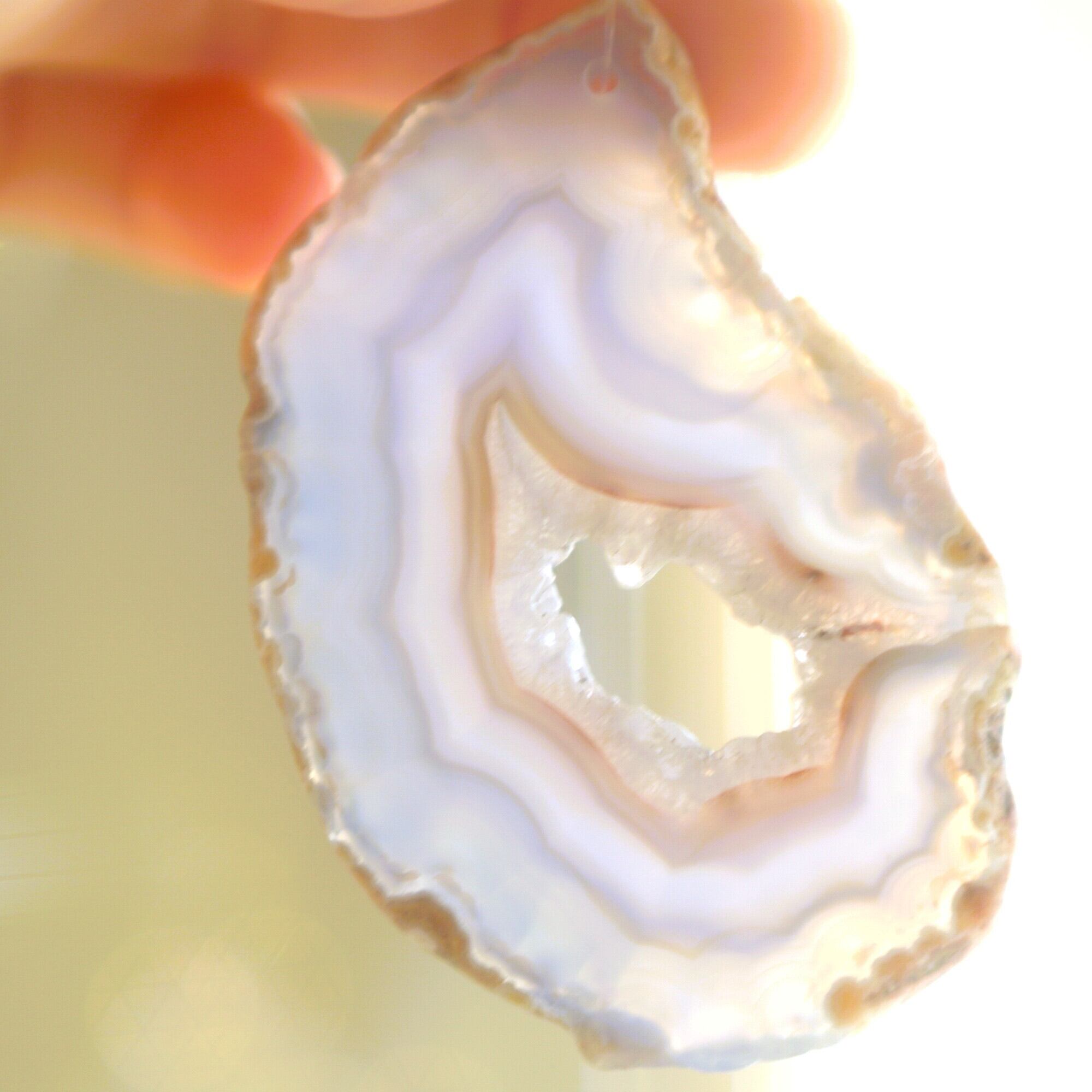 重ねる石同士の側面の加工状態によっても良い音が鳴ったり鳴らなかったり、石の見た目だけで組み合わせを決められないことが難しいポイントでもあるのですが、そんな中、たくさんの石の中から選ばれた5枚のスライスアゲートから出来上がったチャイムたちは、どこか悠々自適に空を泳ぐ妖精のようでもあり、それぞれの音を楽しそうに奏でてくれます。