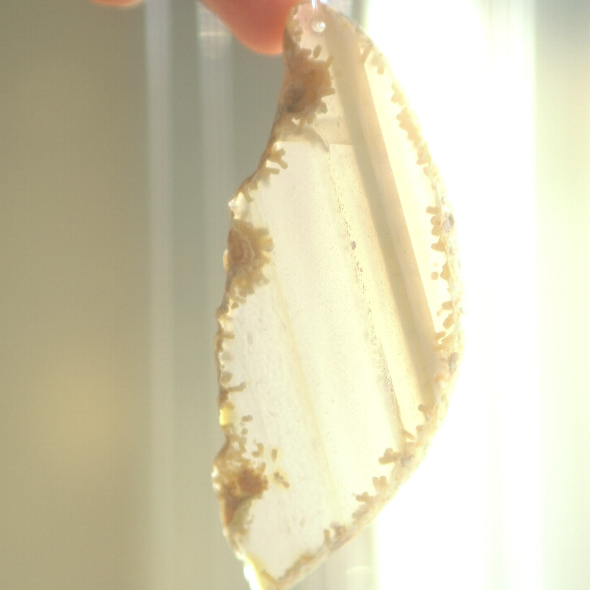 重ねる石同士の側面の加工状態によっても良い音が鳴ったり鳴らなかったり、石の見た目だけで組み合わせを決められないことが難しいポイントでもあるのですが、そんな中、たくさんの石の中から選ばれた5枚のスライスアゲートから出来上がったチャイムたちは、どこか悠々自適に空を泳ぐ妖精のようでもあり、それぞれの音を楽しそうに奏でてくれます。