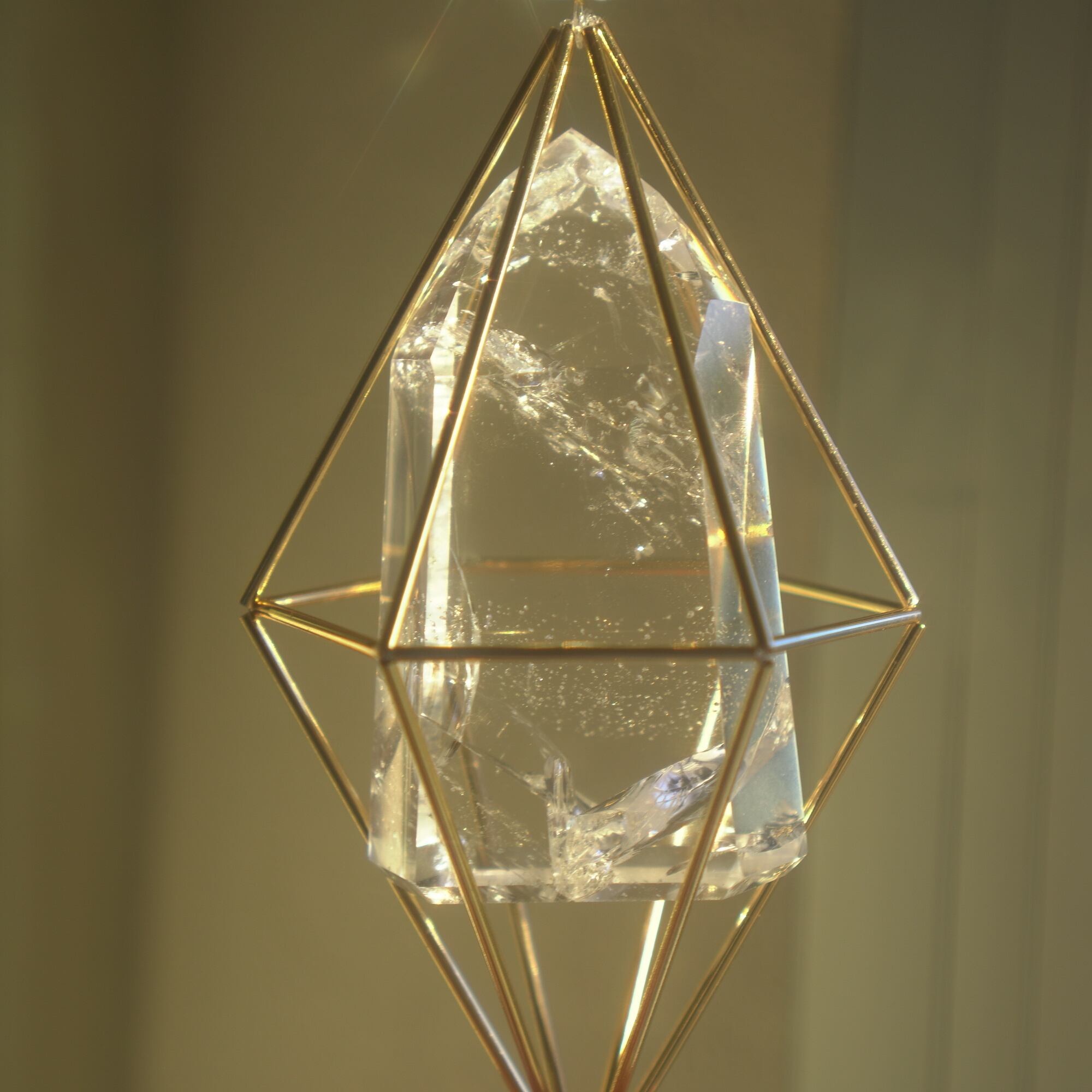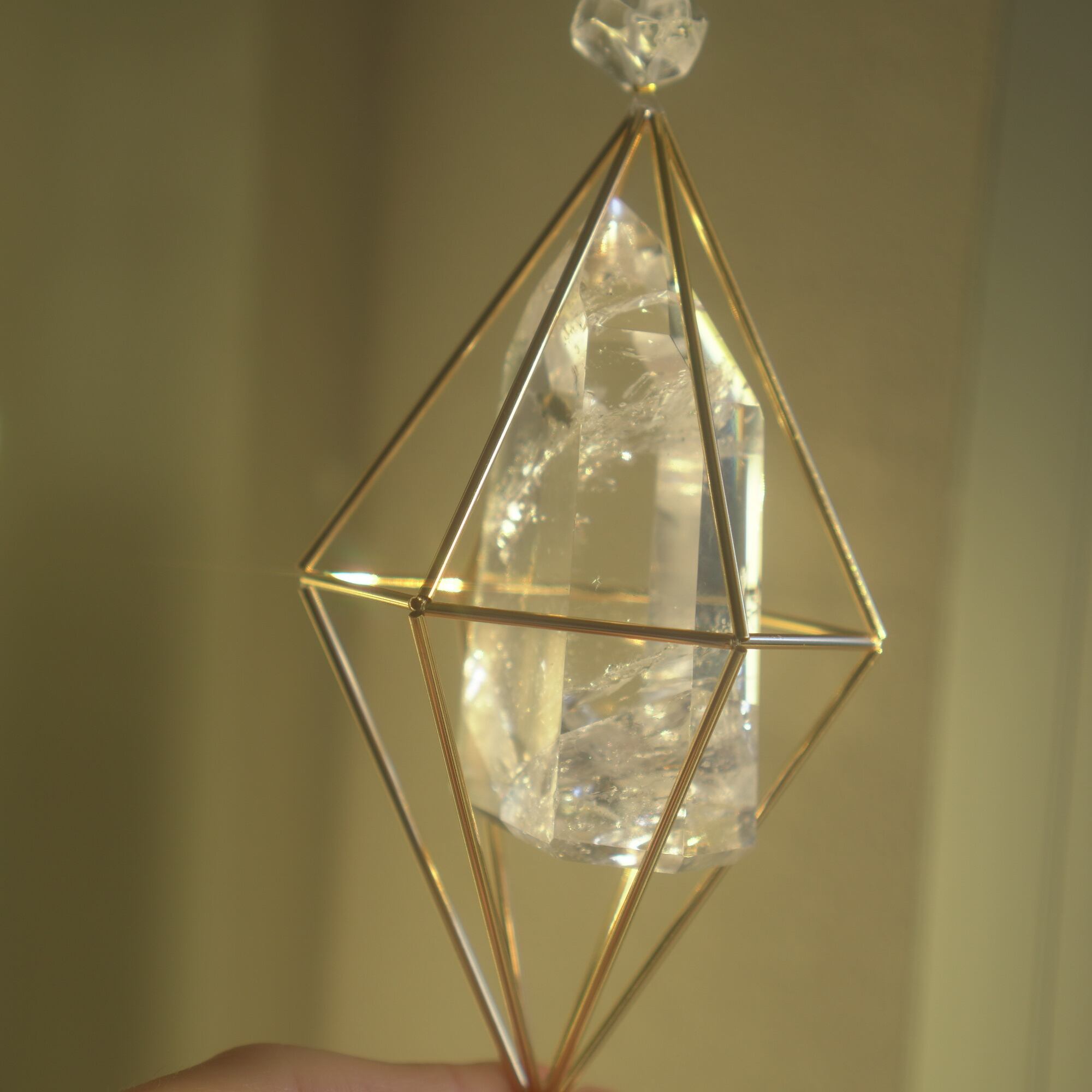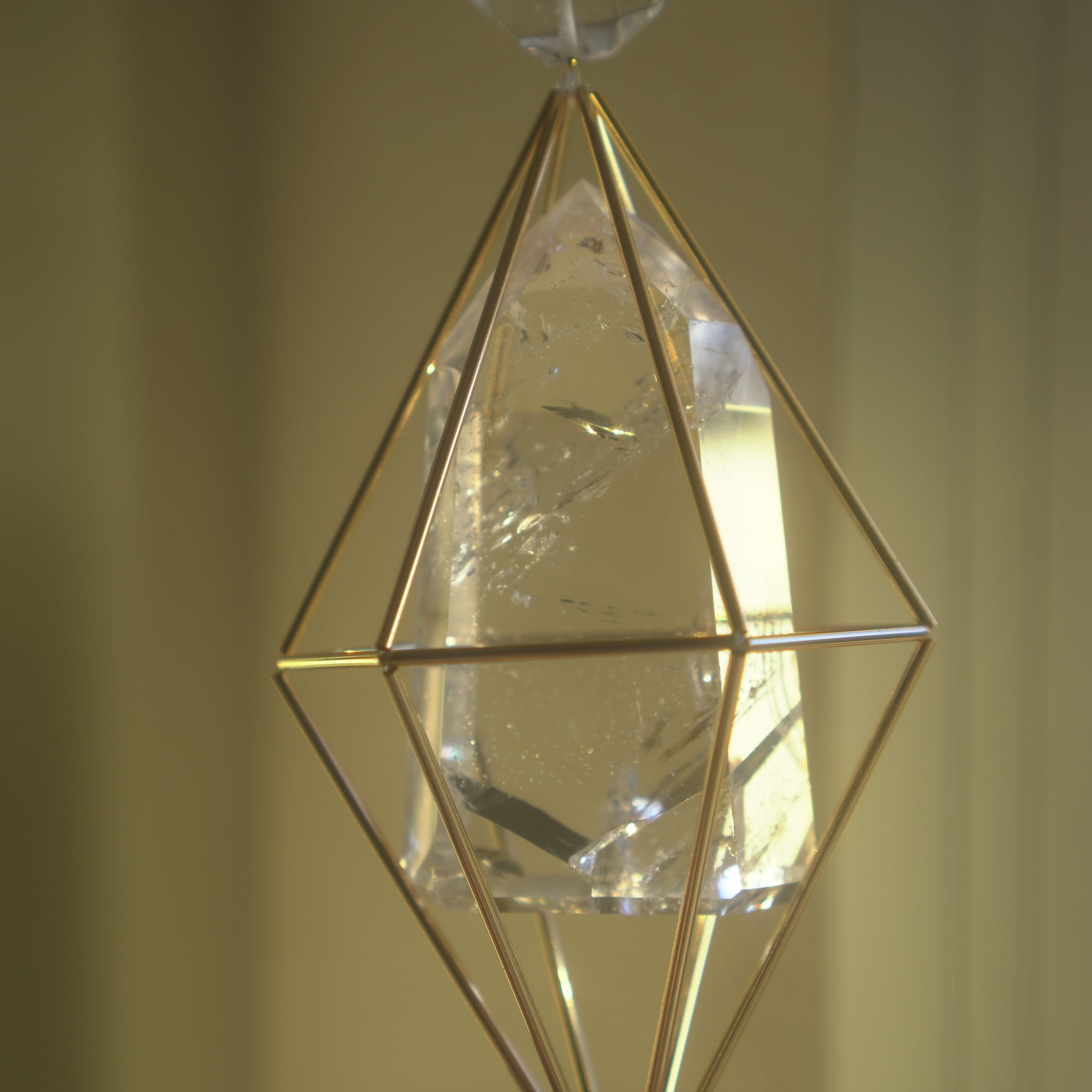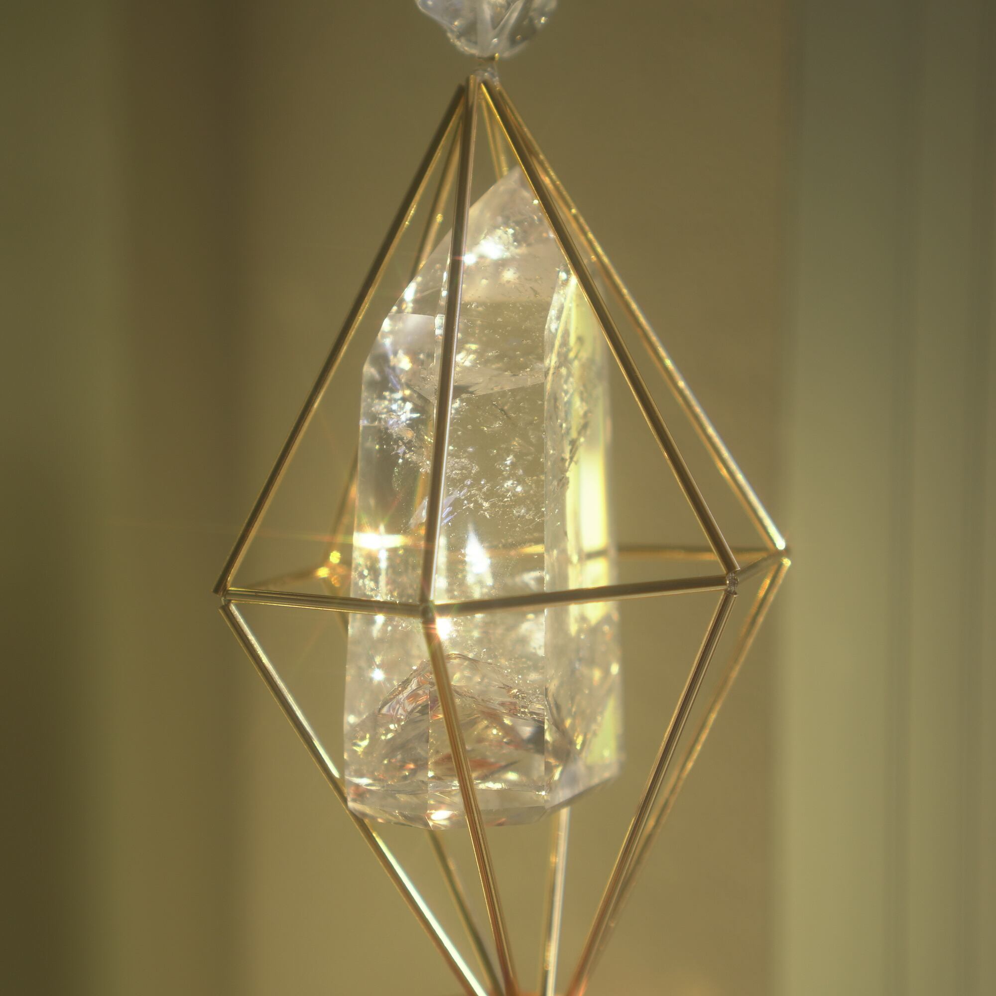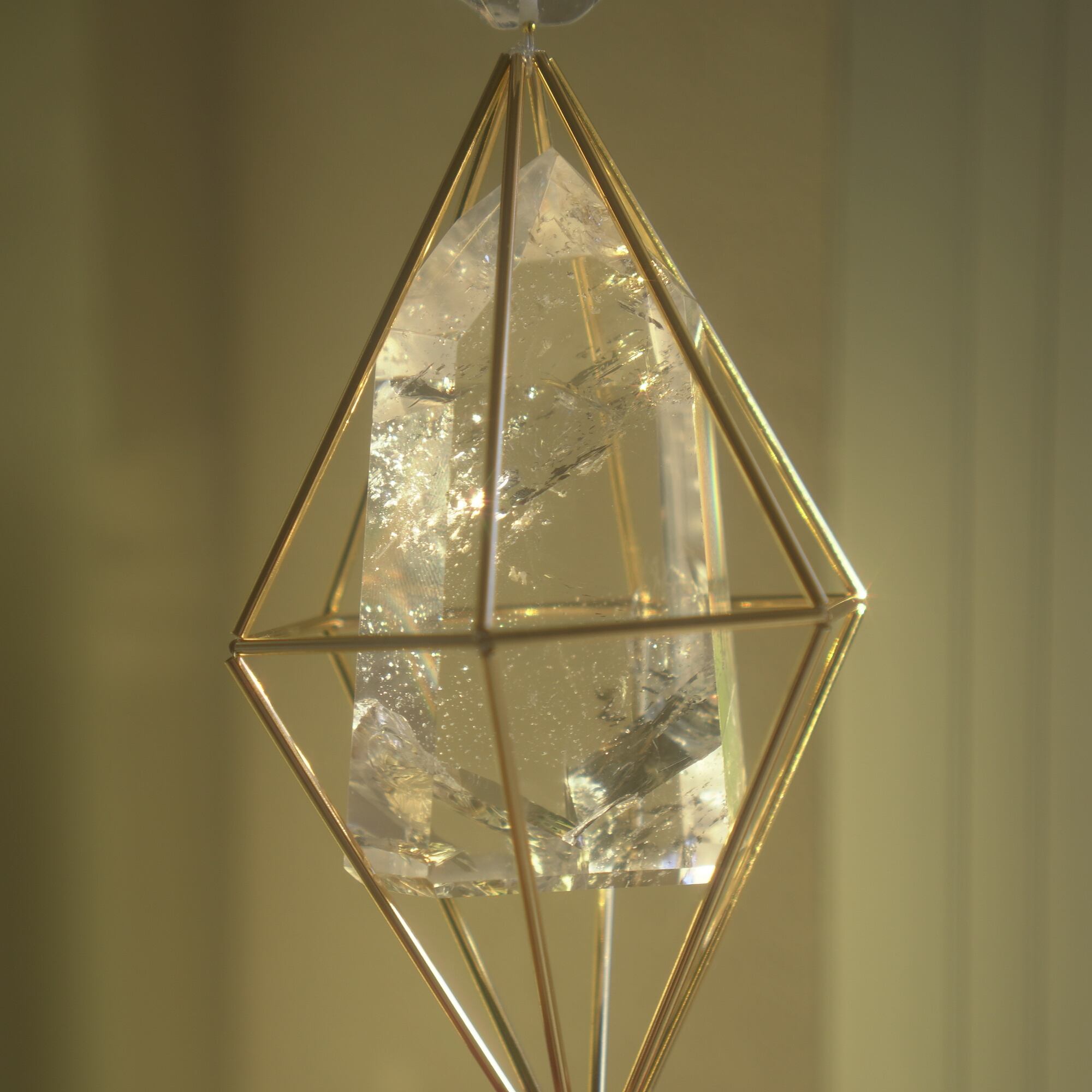 ヒンメリ用のメタルパイプを繋いだ幾何学形体に宿る、特別感のあるタワーカットの天然石。サンキャッチャーになるクリスタルカットのガラスボールやキラキラ輝くメタルパーツを組み合わせ、直射日光を浴びた際、キラキラと輝きながらたくさんの虹色の光がお部屋に広がります。