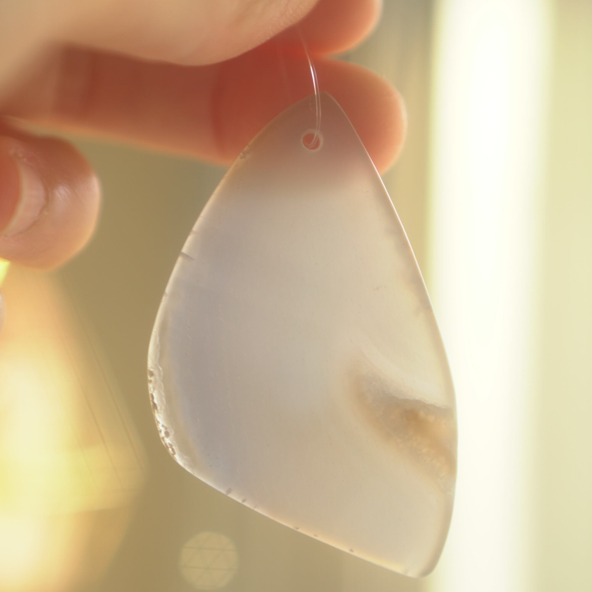 重ねる石同士の側面の加工状態によっても良い音が鳴ったり鳴らなかったり、石の見た目だけで組み合わせを決められないことが難しいポイントでもあるのですが、そんな中、たくさんの石の中から選ばれた5枚のスライスアゲートから出来上がったチャイムたちは、どこか悠々自適に空を泳ぐ妖精のようでもあり、それぞれの音を楽しそうに奏でてくれます。