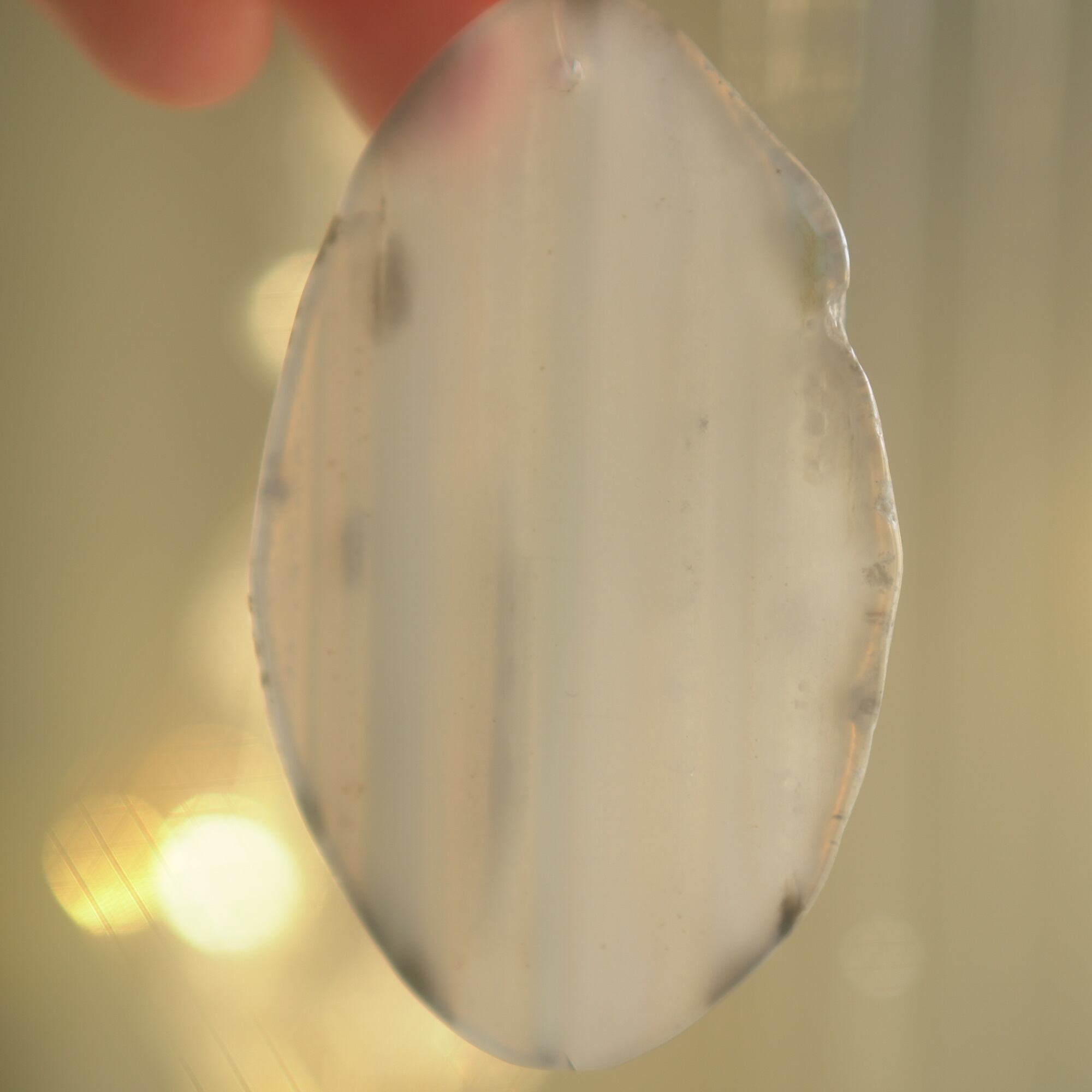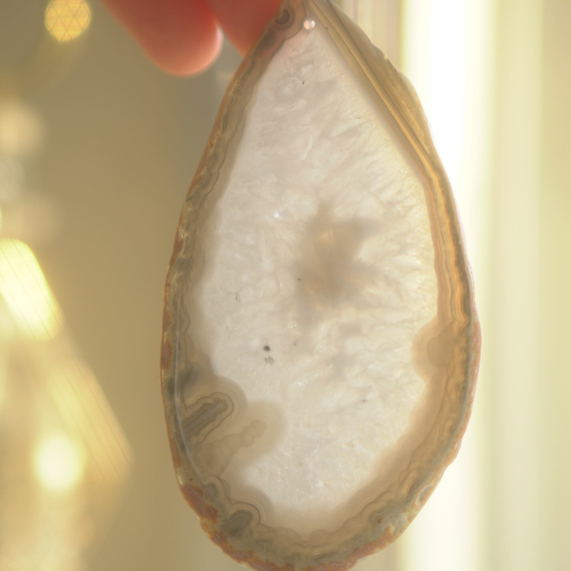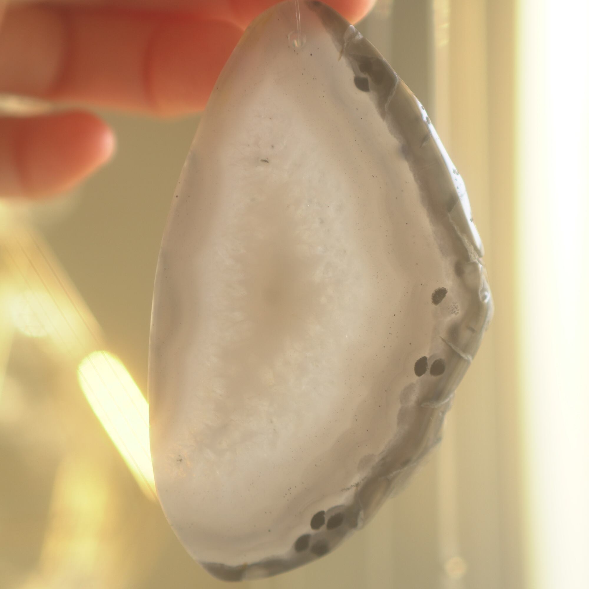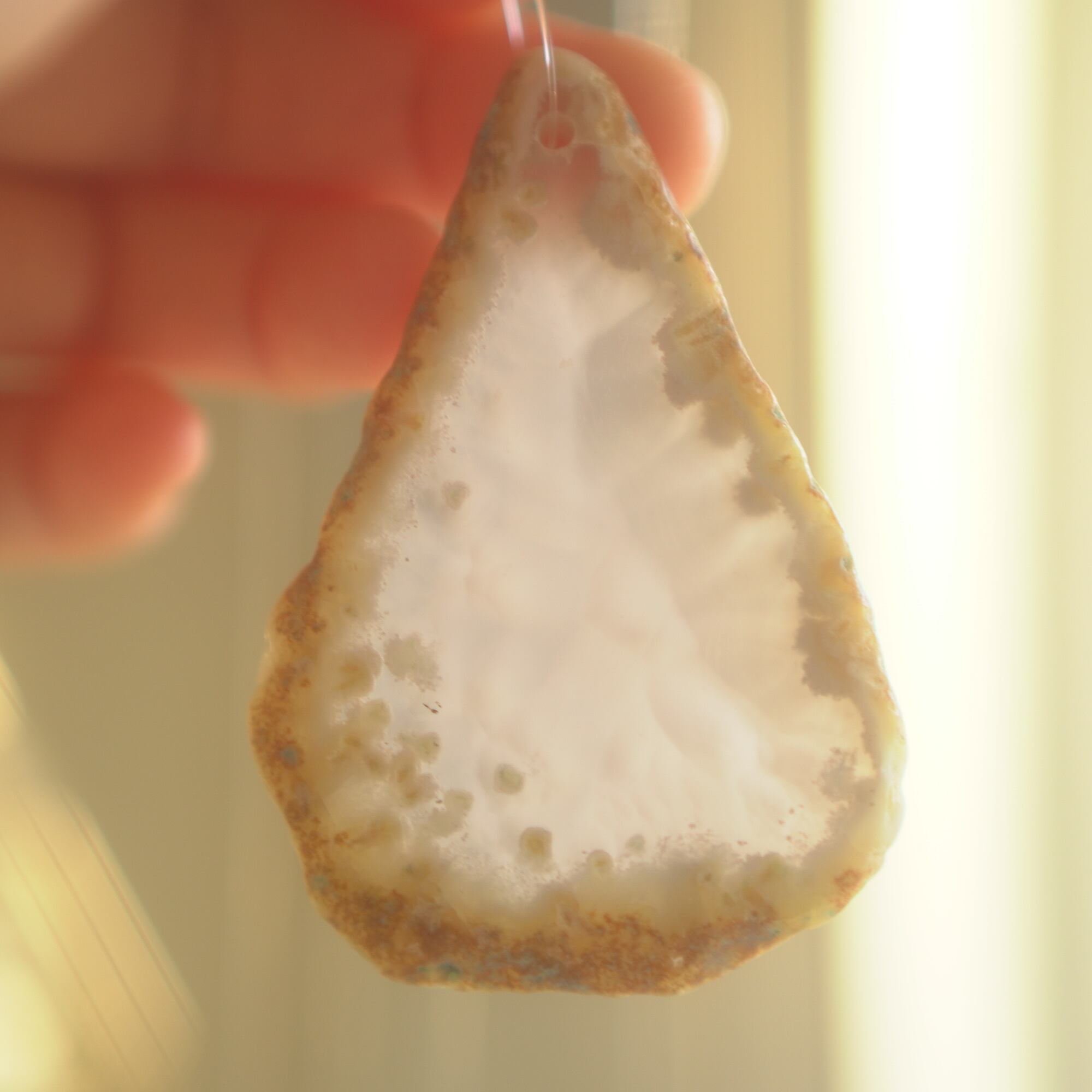 重ねる石同士の側面の加工状態によっても良い音が鳴ったり鳴らなかったり、石の見た目だけで組み合わせを決められないことが難しいポイントでもあるのですが、そんな中、たくさんの石の中から選ばれた5枚のスライスアゲートから出来上がったチャイムたちは、どこか悠々自適に空を泳ぐ妖精のようでもあり、それぞれの音を楽しそうに奏でてくれます。
