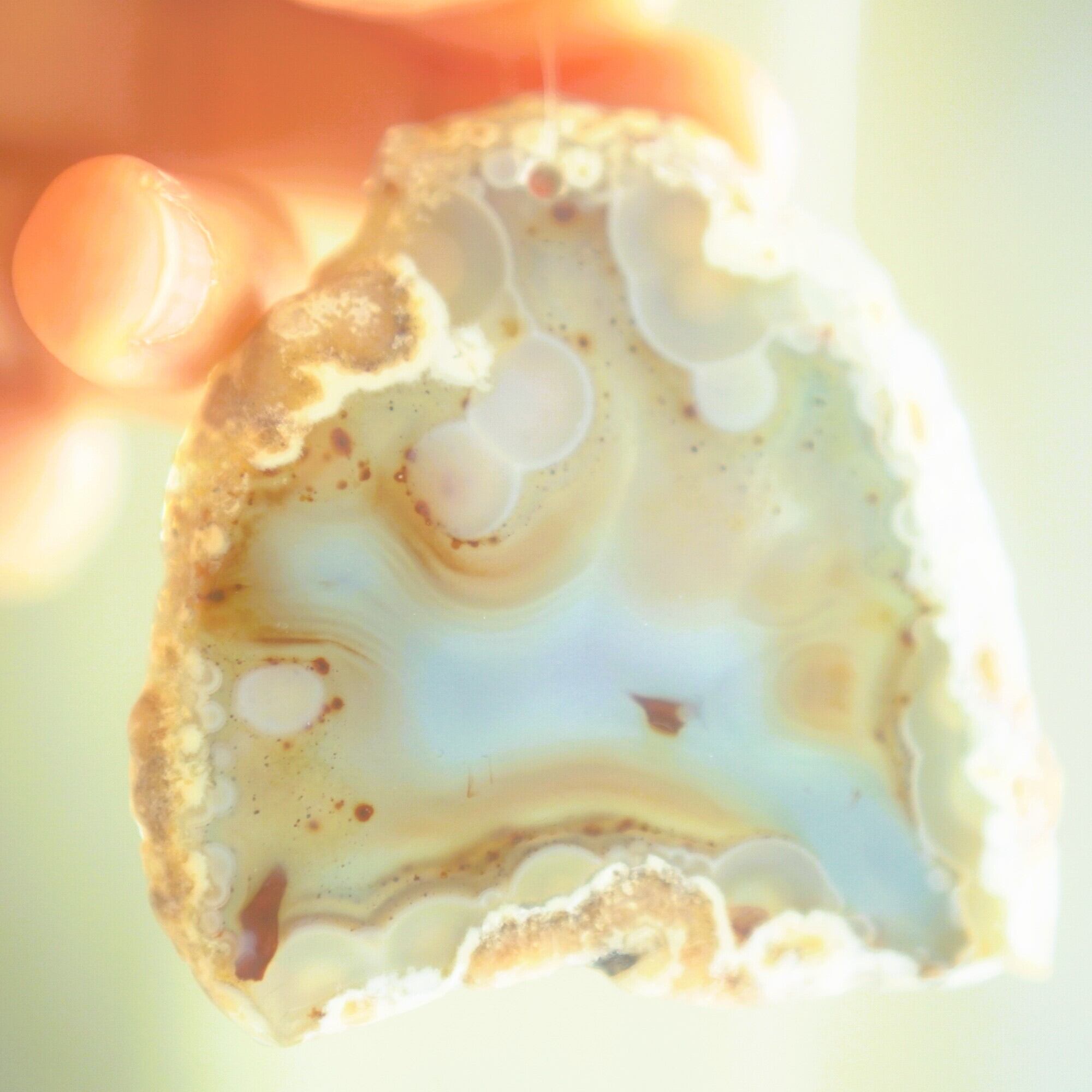 重ねる石同士の側面の加工状態によっても良い音が鳴ったり鳴らなかったり、石の見た目だけで組み合わせを決められないことが難しいポイントでもあるのですが、そんな中、たくさんの石の中から選ばれた5枚のスライスアゲートから出来上がったチャイムたちは、どこか悠々自適に空を泳ぐ妖精のようでもあり、それぞれの音を楽しそうに奏でてくれます。