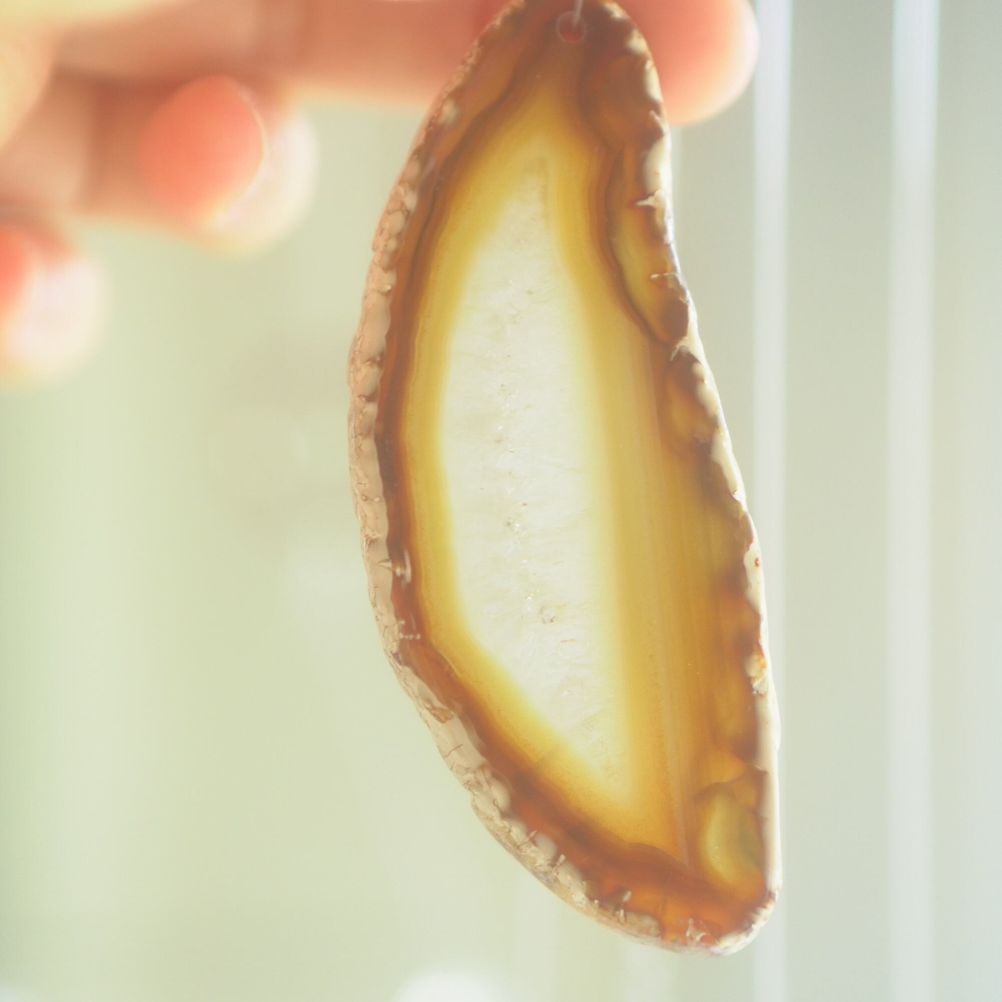 元々の瑪瑙風鈴とは使っている石の大きさや厚みが異なり、こちらのものはそれ同士重ねるだけでは特別音が鳴らない厚さのスライスアゲートを使用しているのですが、間に2本、細長い形状のアゲートを挟むことによって音が鳴る仕組みになっています。(もう少し変則的な組み合わせ方で音が鳴っていることもあります)
