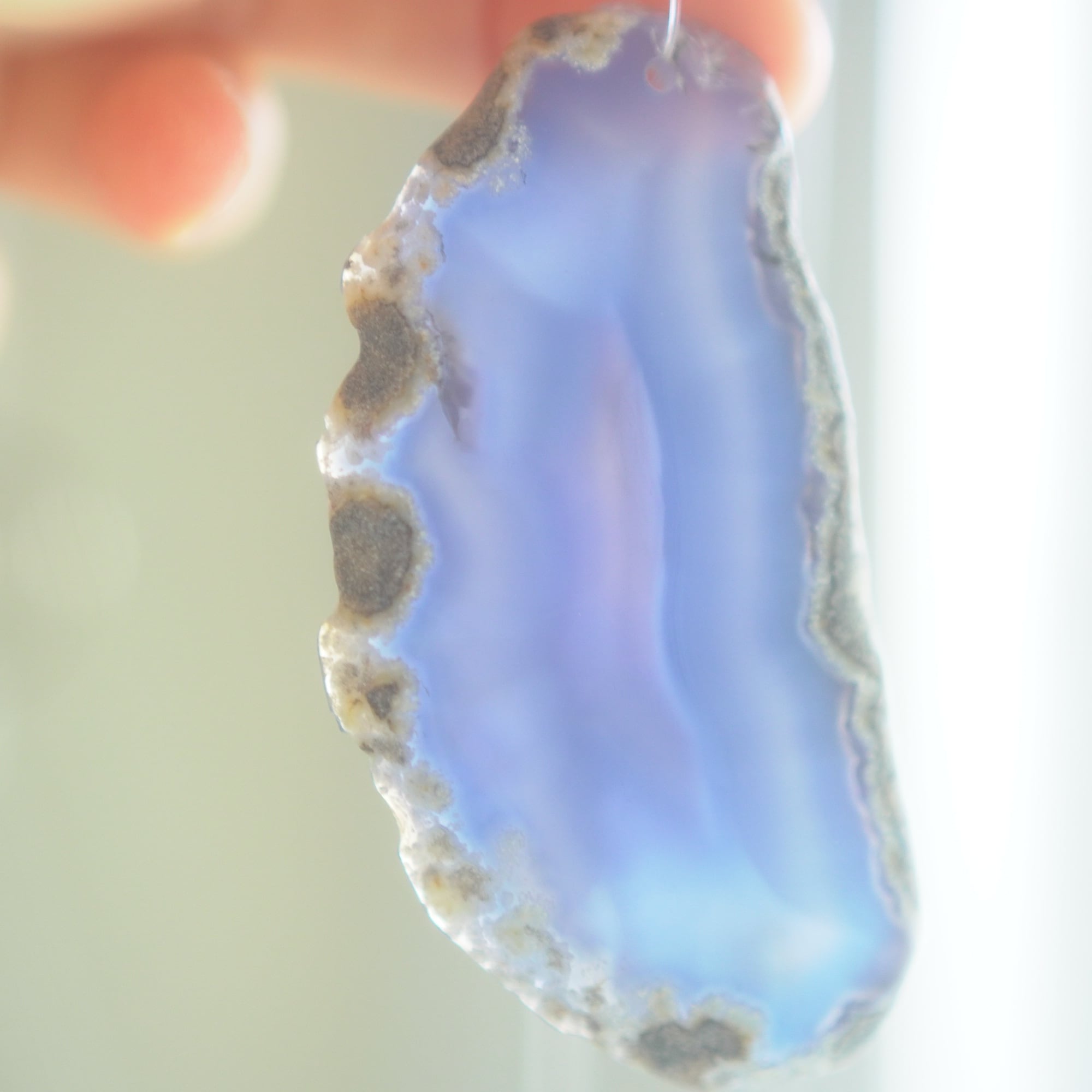 重ねる石同士の側面の加工状態によっても良い音が鳴ったり鳴らなかったり、石の見た目だけで組み合わせを決められないことが難しいポイントでもあるのですが、そんな中、たくさんの石の中から選ばれた5枚のスライスアゲートから出来上がったチャイムたちは、どこか悠々自適に空を泳ぐ妖精のようでもあり、それぞれの音を楽しそうに奏でてくれます。