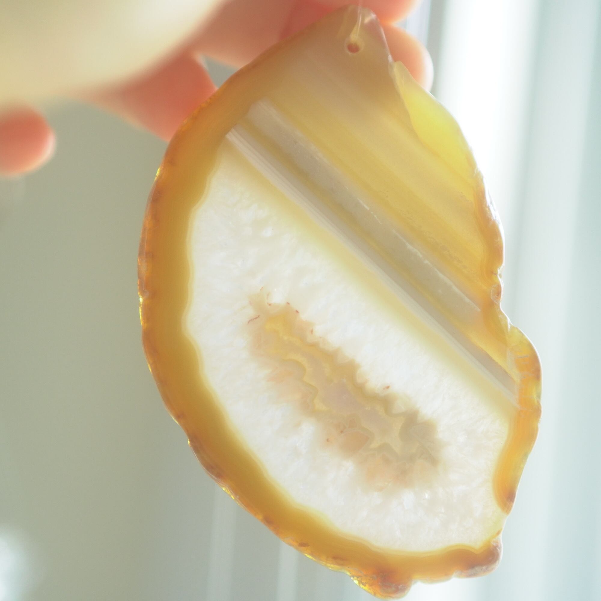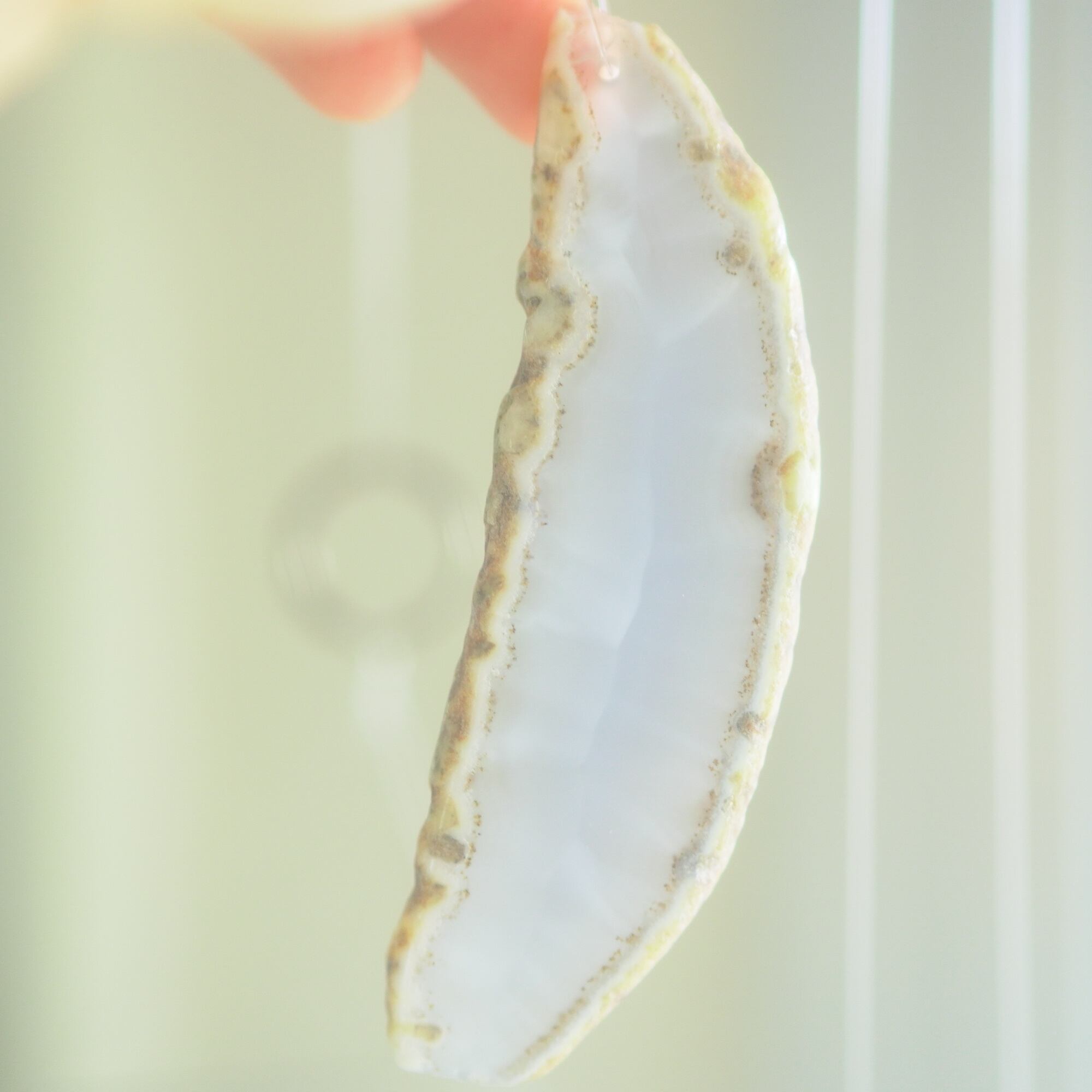 元々の瑪瑙風鈴とは使っている石の大きさや厚みが異なり、こちらのものはそれ同士重ねるだけでは特別音が鳴らない厚さのスライスアゲートを使用しているのですが、間に2本、細長い形状のアゲートを挟むことによって音が鳴る仕組みになっています。(もう少し変則的な組み合わせ方で音が鳴っていることもあります)