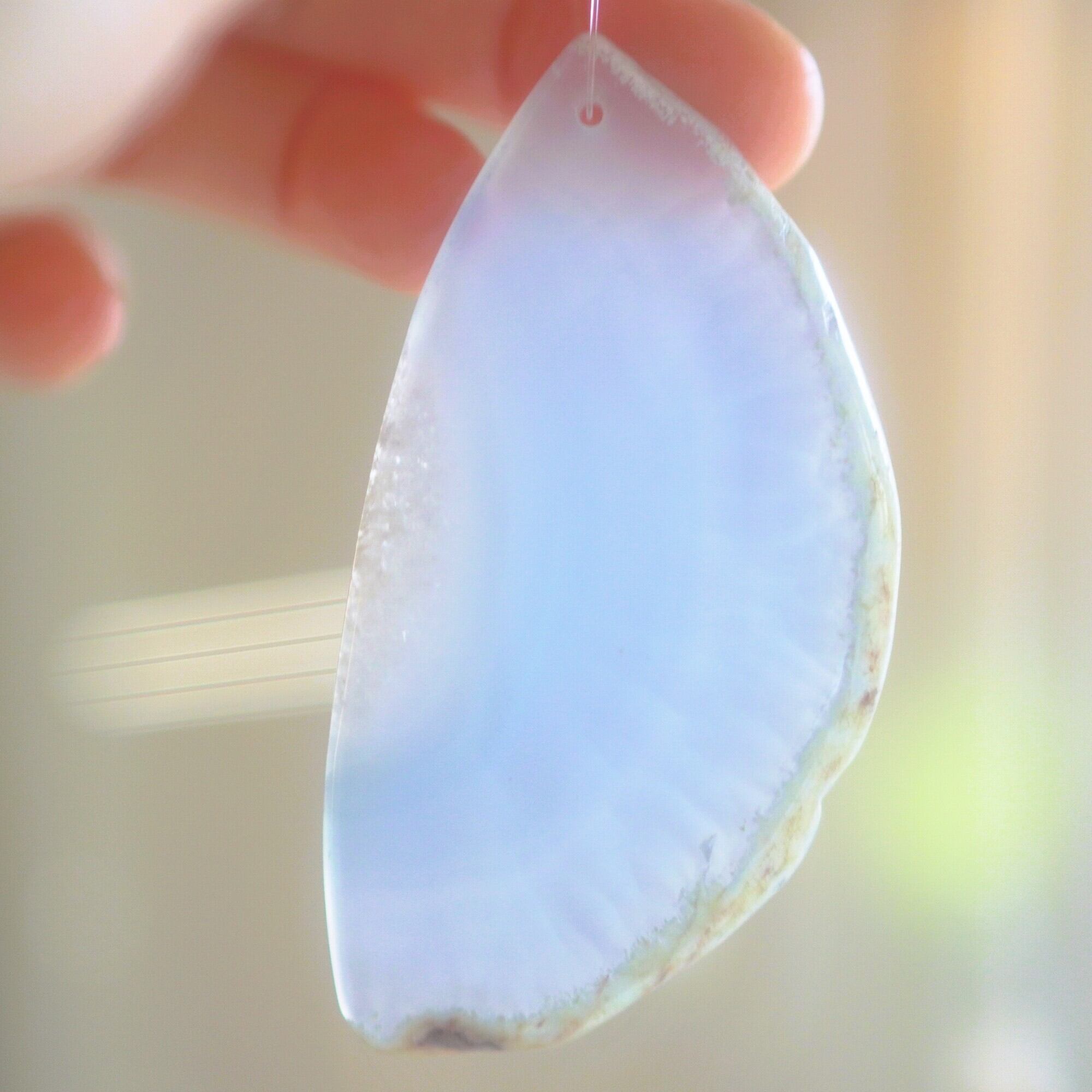 重ねる石同士の側面の加工状態によっても良い音が鳴ったり鳴らなかったり、石の見た目だけで組み合わせを決められないことが難しいポイントでもあるのですが、そんな中、たくさんの石の中から選ばれた5枚のスライスアゲートから出来上がったチャイムたちは、どこか悠々自適に空を泳ぐ妖精のようでもあり、それぞれの音を楽しそうに奏でてくれます。