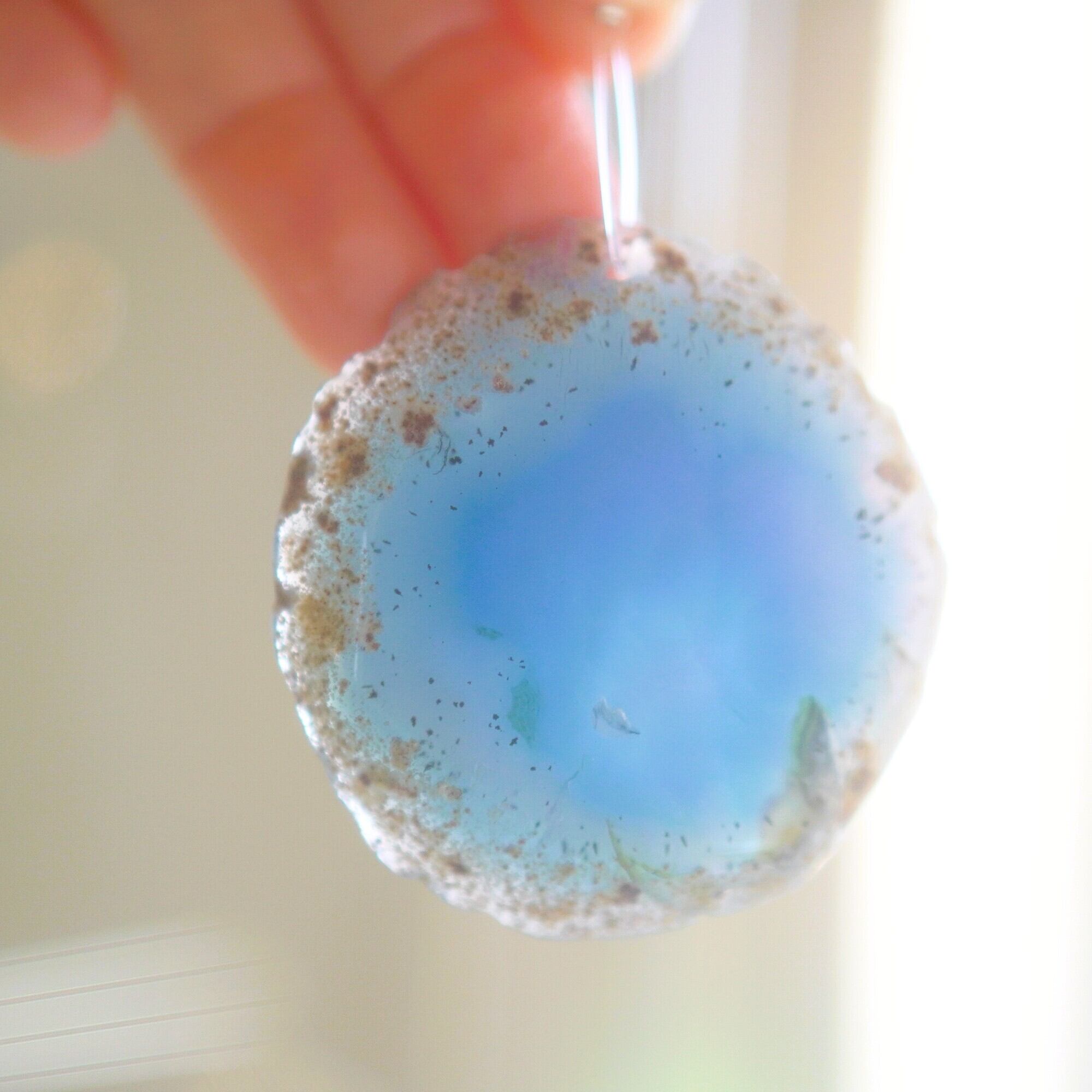 ✧染色の石なので耐光性(光による経年でのカラー変化の耐性)に優れているわけではなくベランダなど一日の中で長時間強い日光に当たるような場所に飾られるのはおすすめしないのですが、陽光に透かした時にだけ真価を発揮する美しさがありますので、是非、時折翳したりして光と一緒にお楽しみいただけたらと思います。特に濃い鮮やかな色など、色変化が気になられる場合は、日光のあまり当たらない場所に飾ってくださいね✧