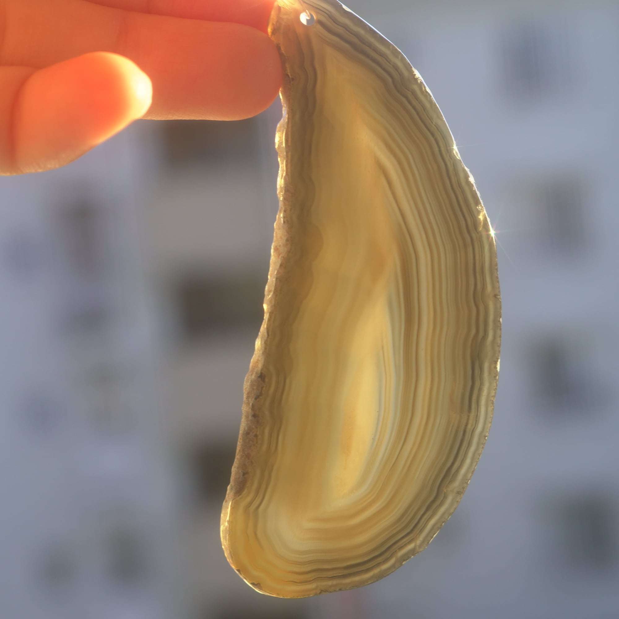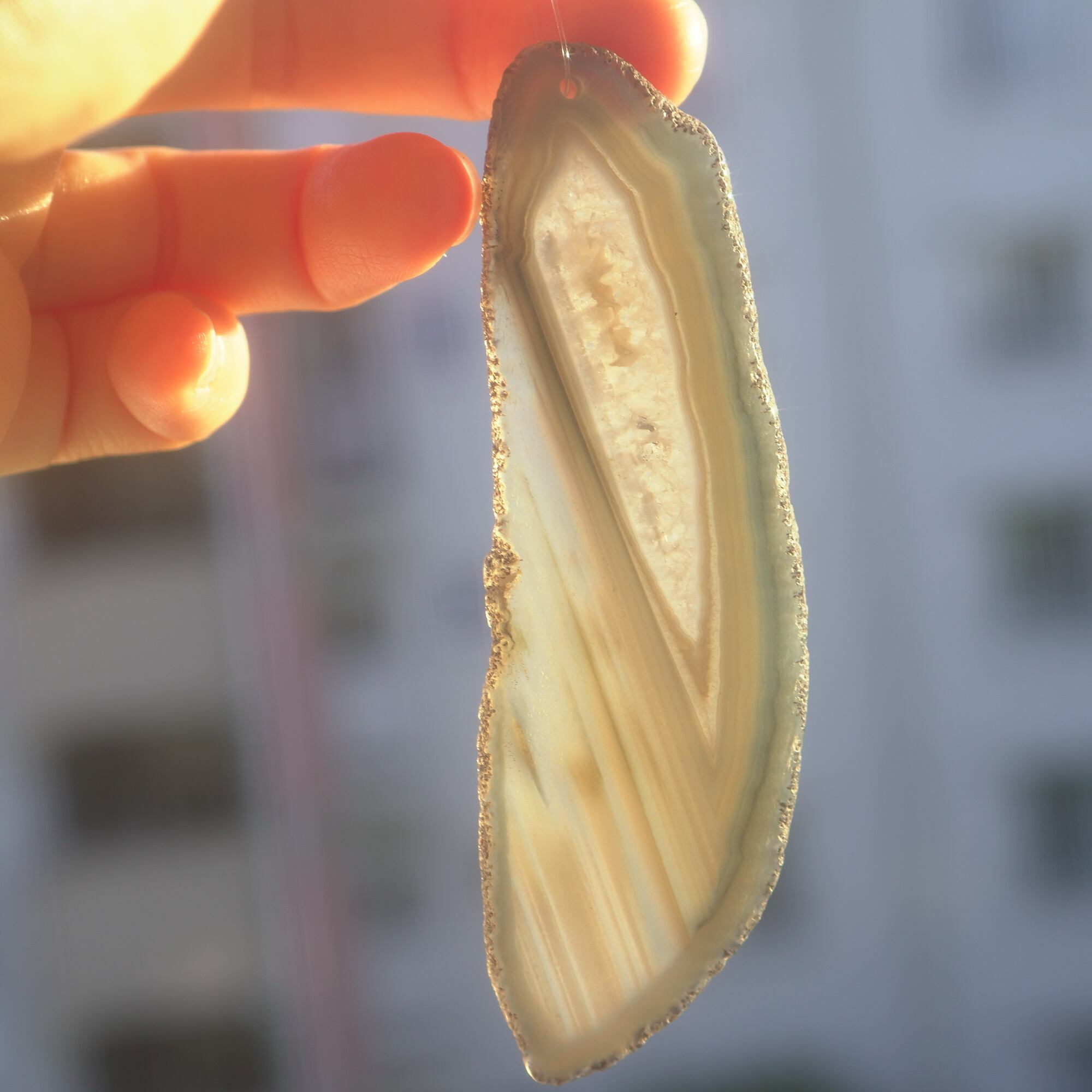 重ねる石同士の側面の加工状態によっても良い音が鳴ったり鳴らなかったり、石の見た目だけで組み合わせを決められないことが難しいポイントでもあるのですが、そんな中、たくさんの石の中から選ばれた5枚のスライスアゲートから出来上がったチャイムたちは、どこか悠々自適に空を泳ぐ妖精のようでもあり、それぞれの音を楽しそうに奏でてくれます。