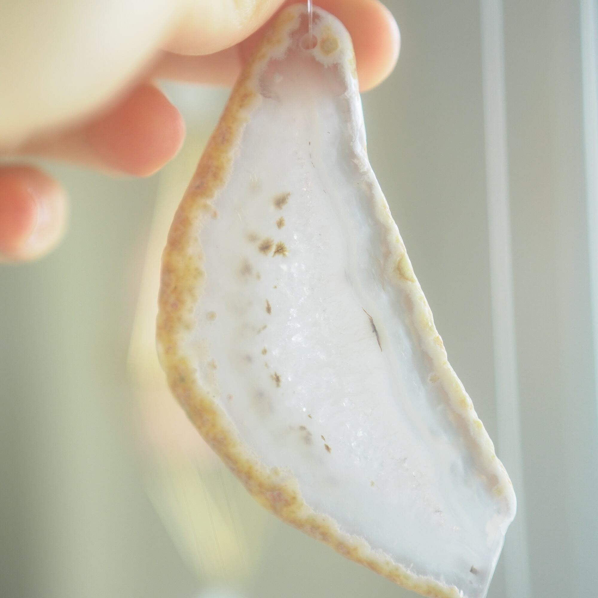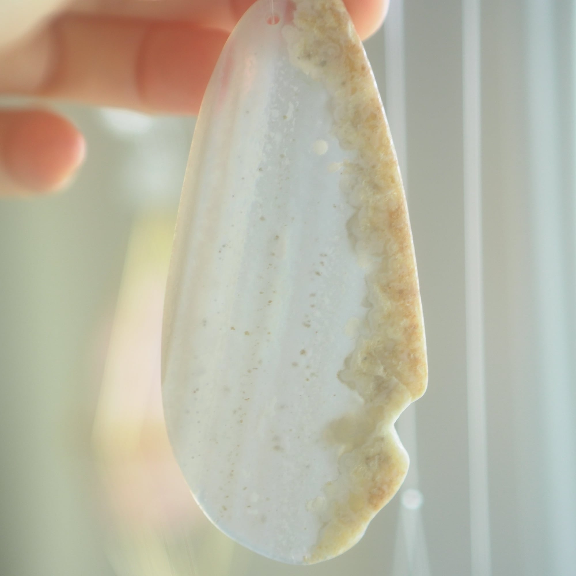 重ねる石同士の側面の加工状態によっても良い音が鳴ったり鳴らなかったり、石の見た目だけで組み合わせを決められないことが難しいポイントでもあるのですが、そんな中、たくさんの石の中から選ばれた5枚のスライスアゲートから出来上がったチャイムたちは、どこか悠々自適に空を泳ぐ妖精のようでもあり、それぞれの音を楽しそうに奏でてくれます。