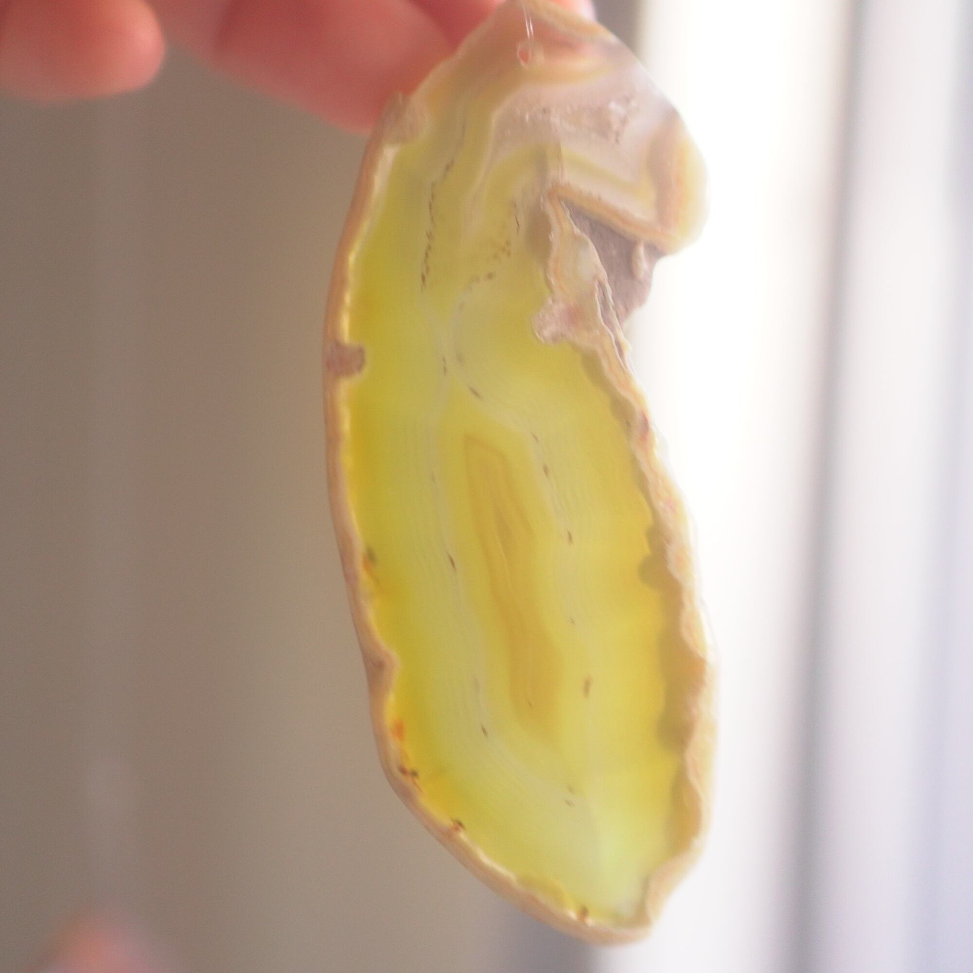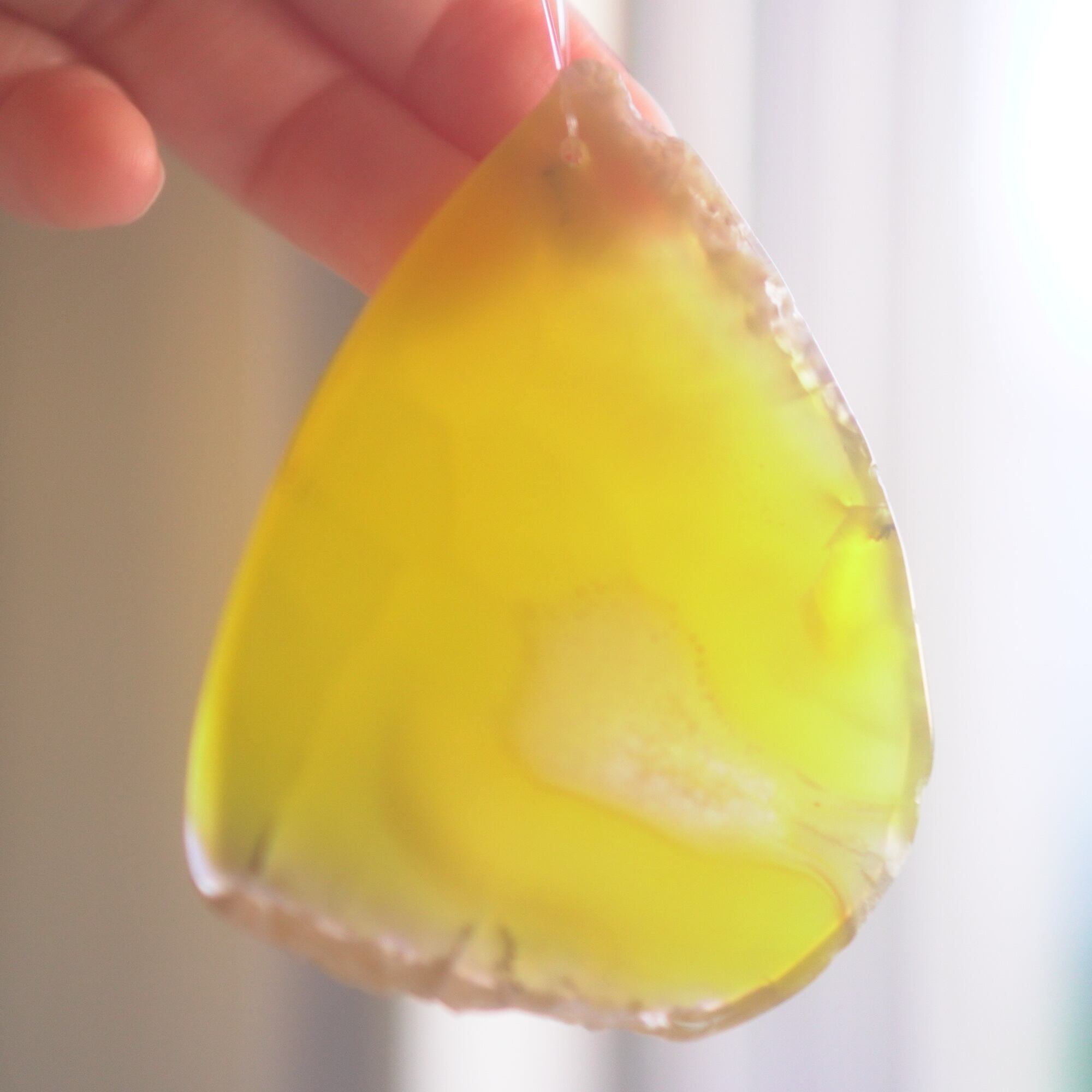 ✧染色の石なので耐光性(光による経年でのカラー変化の耐性)に優れているわけではなくベランダなど一日の中で長時間強い日光に当たるような場所に飾られるのはおすすめしないのですが、陽光に透かした時にだけ真価を発揮する美しさがありますので、是非、時折翳したりして光と一緒にお楽しみいただけたらと思います。特に濃い鮮やかな色など、色変化が気になられる場合は、日光のあまり当たらない場所に飾ってくださいね✧