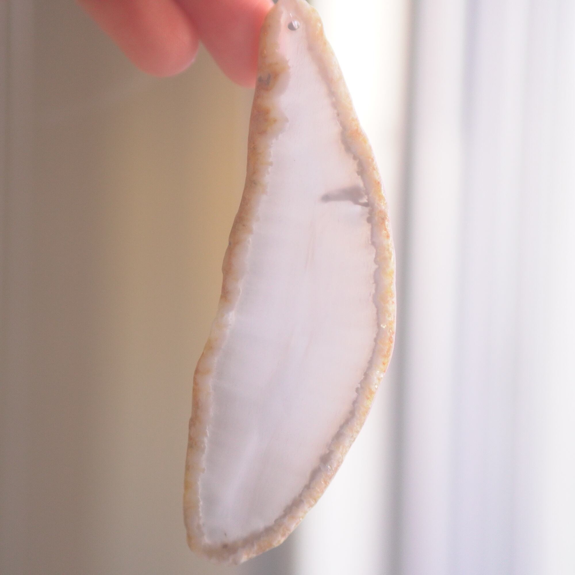 重ねる石同士の側面の加工状態によっても良い音が鳴ったり鳴らなかったり、石の見た目だけで組み合わせを決められないことが難しいポイントでもあるのですが、そんな中、たくさんの石の中から選ばれた5枚のスライスアゲートから出来上がったチャイムたちは、どこか悠々自適に空を泳ぐ妖精のようでもあり、それぞれの音を楽しそうに奏でてくれます。