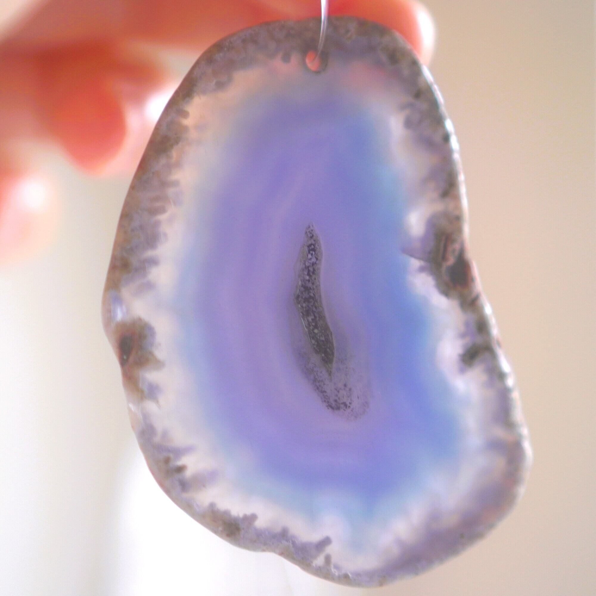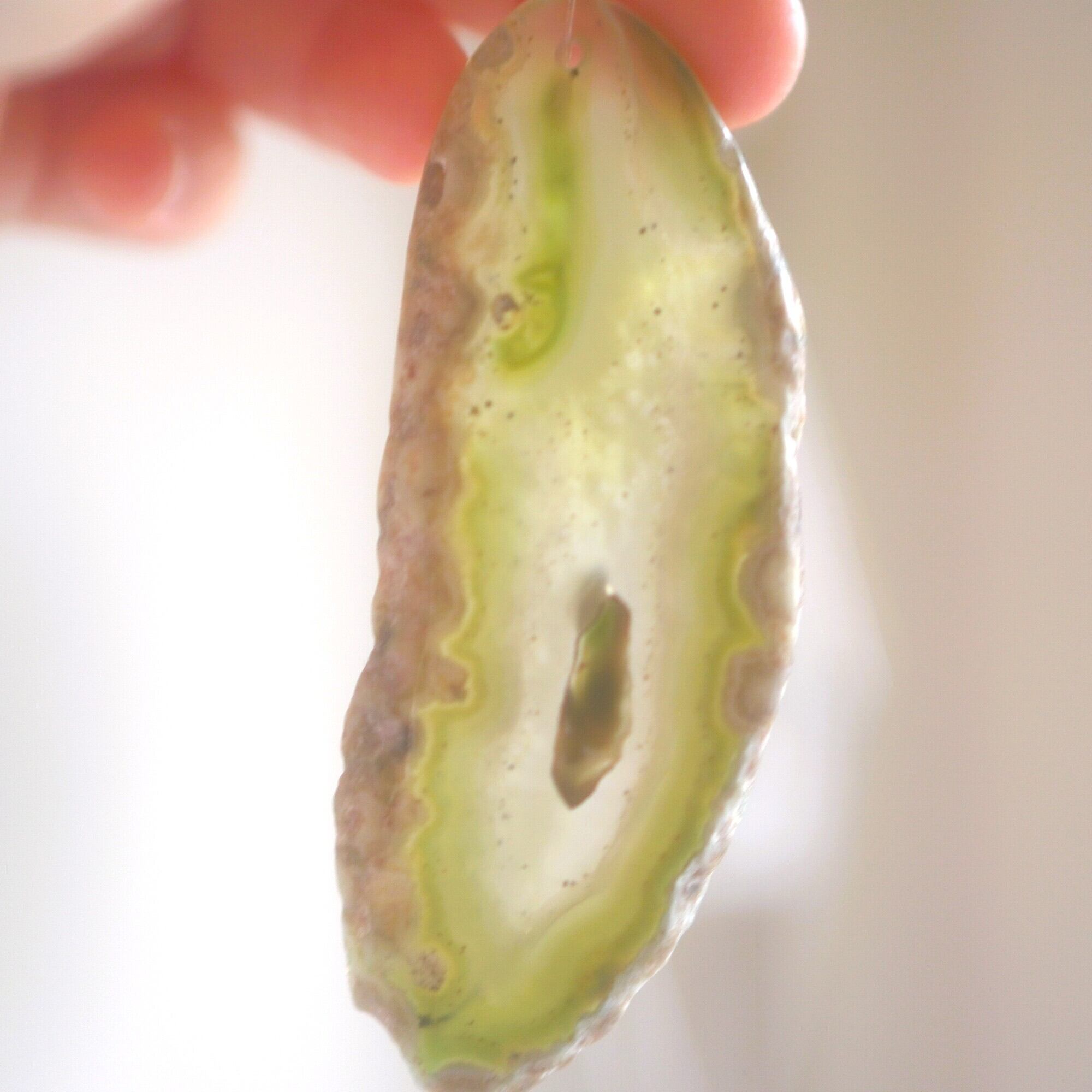 重ねる石同士の側面の加工状態によっても良い音が鳴ったり鳴らなかったり、石の見た目だけで組み合わせを決められないことが難しいポイントでもあるのですが、そんな中、たくさんの石の中から選ばれた5枚のスライスアゲートから出来上がったチャイムたちは、どこか悠々自適に空を泳ぐ妖精のようでもあり、それぞれの音を楽しそうに奏でてくれます。