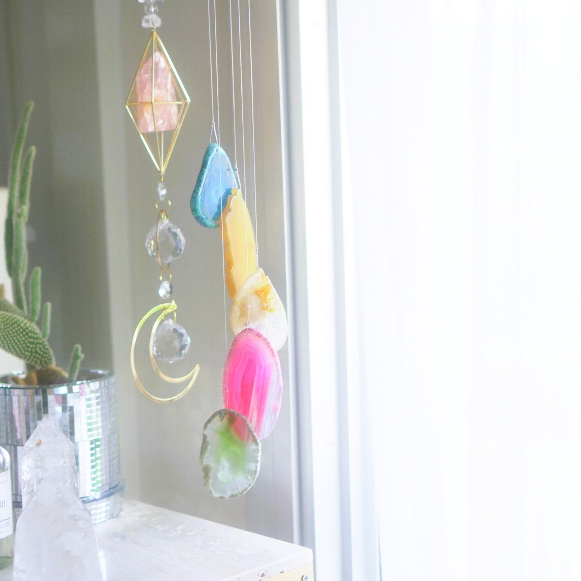 そしてカーテン越しではなく直射日光を当てた際のサンキャッチャーとしてのチャイムも、ピカピカとした美しい光をお部屋の中に運んでくれます。