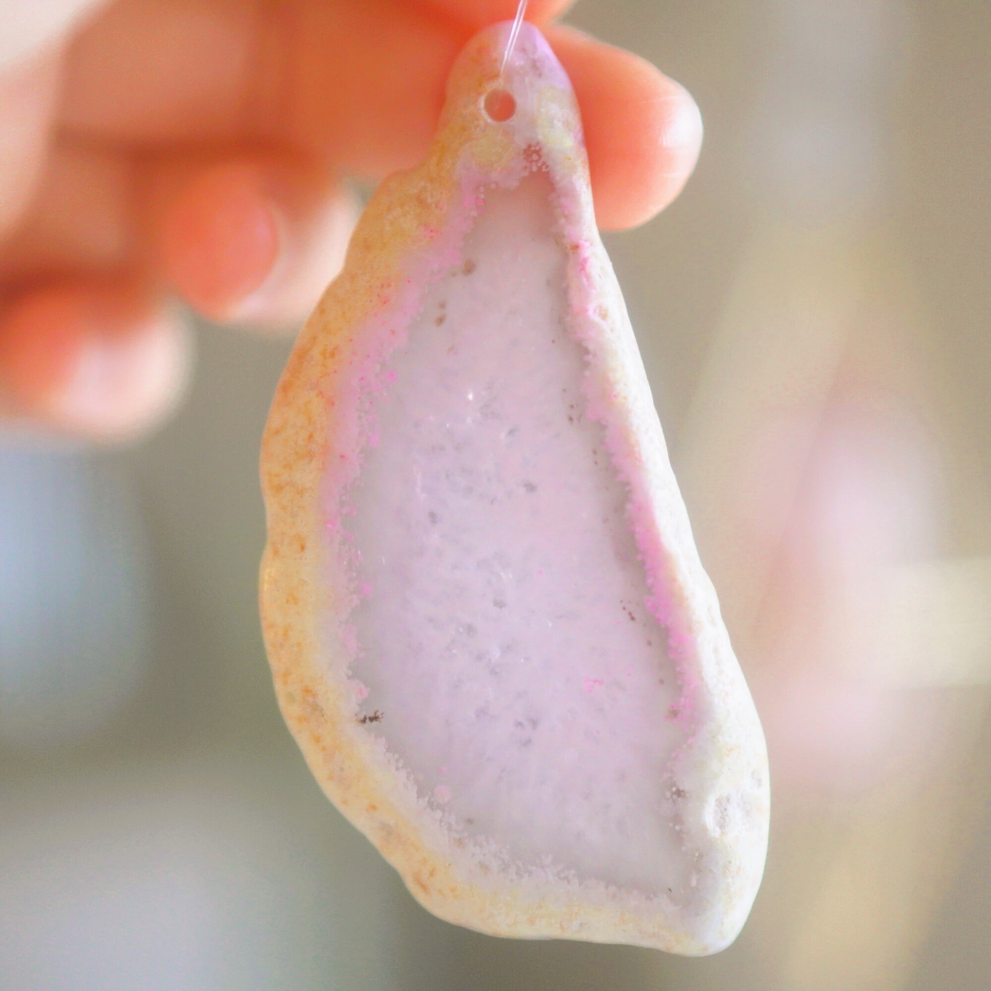 重ねる石同士の側面の加工状態によっても良い音が鳴ったり鳴らなかったり、石の見た目だけで組み合わせを決められないことが難しいポイントでもあるのですが、そんな中、たくさんの石の中から選ばれた5枚のスライスアゲートから出来上がったチャイムたちは、どこか悠々自適に空を泳ぐ妖精のようでもあり、それぞれの音を楽しそうに奏でてくれます。