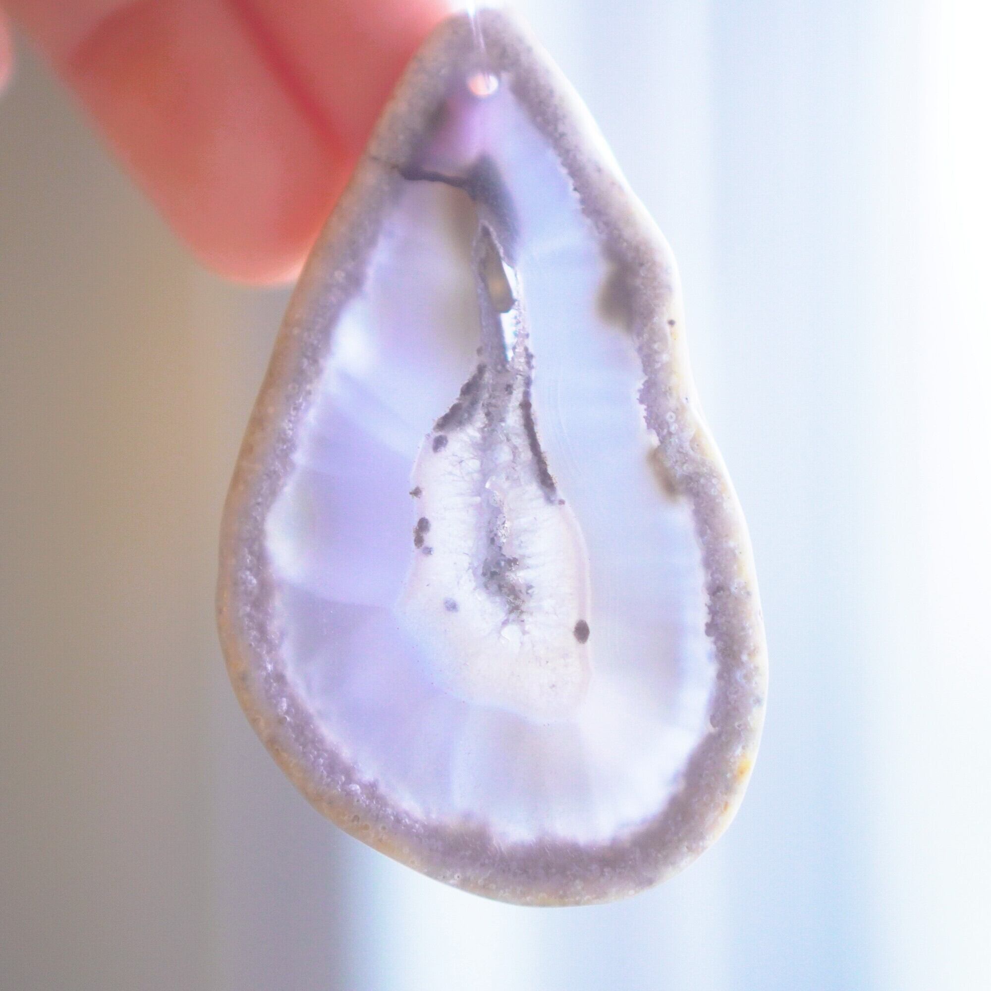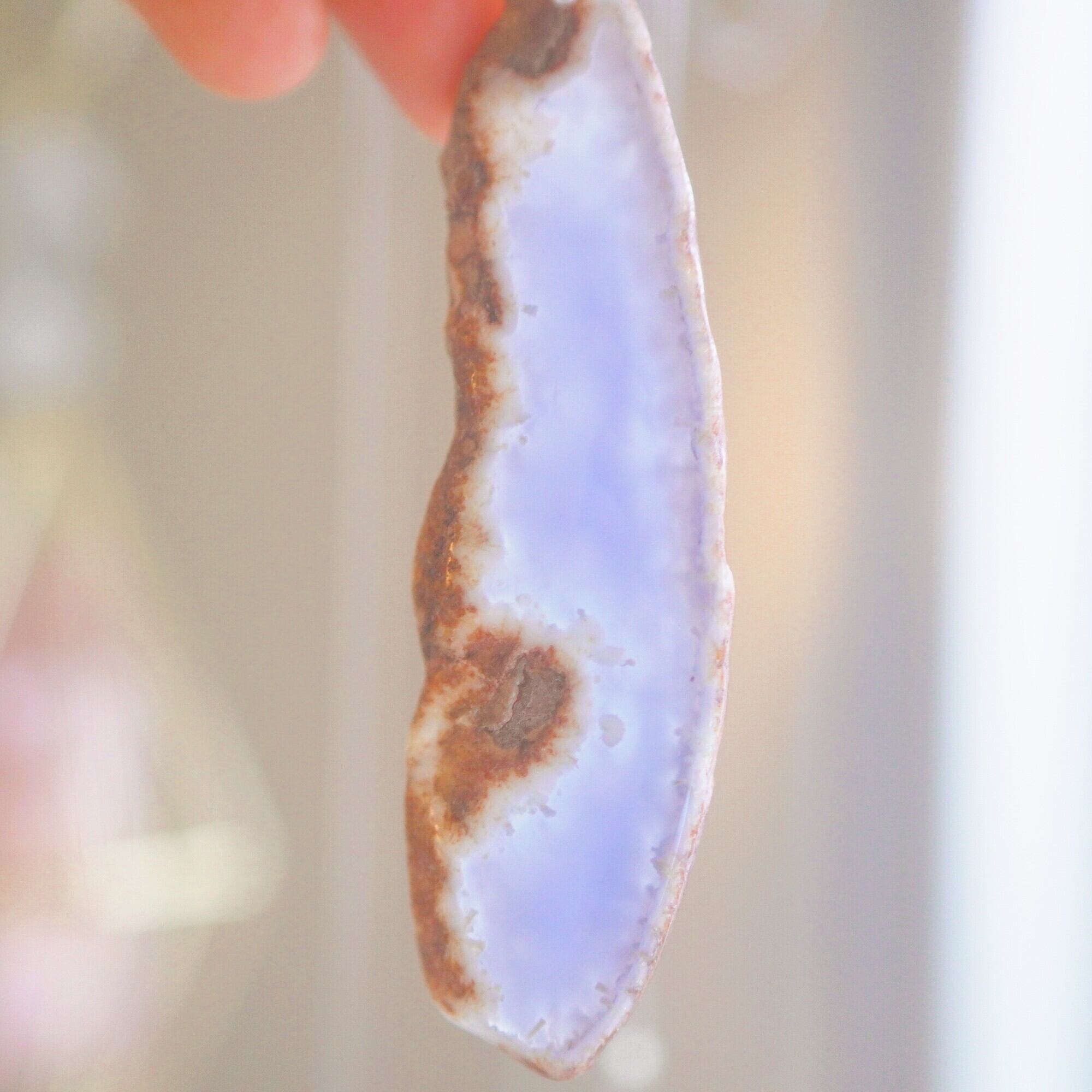 重ねる石同士の側面の加工状態によっても良い音が鳴ったり鳴らなかったり、石の見た目だけで組み合わせを決められないことが難しいポイントでもあるのですが、そんな中、たくさんの石の中から選ばれた5枚のスライスアゲートから出来上がったチャイムたちは、どこか悠々自適に空を泳ぐ妖精のようでもあり、それぞれの音を楽しそうに奏でてくれます。