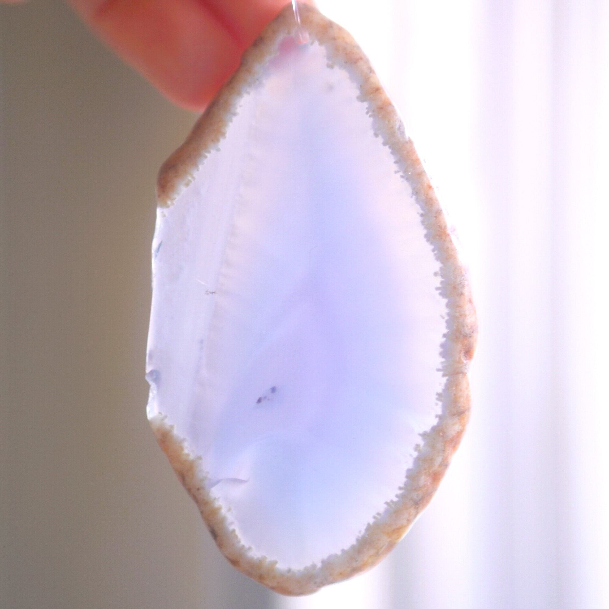 重ねる石同士の側面の加工状態によっても良い音が鳴ったり鳴らなかったり、石の見た目だけで組み合わせを決められないことが難しいポイントでもあるのですが、そんな中、たくさんの石の中から選ばれた5枚のスライスアゲートから出来上がったチャイムたちは、どこか悠々自適に空を泳ぐ妖精のようでもあり、それぞれの音を楽しそうに奏でてくれます。