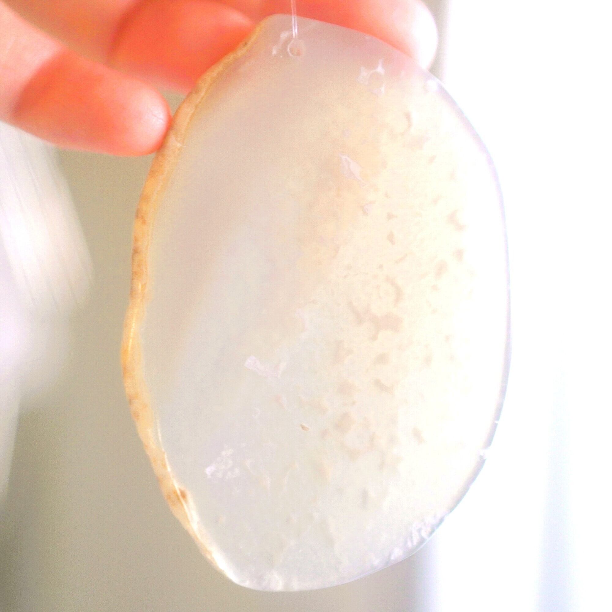 重ねる石同士の側面の加工状態によっても良い音が鳴ったり鳴らなかったり、石の見た目だけで組み合わせを決められないことが難しいポイントでもあるのですが、そんな中、たくさんの石の中から選ばれた5枚のスライスアゲートから出来上がったチャイムたちは、どこか悠々自適に空を泳ぐ妖精のようでもあり、それぞれの音を楽しそうに奏でてくれます。