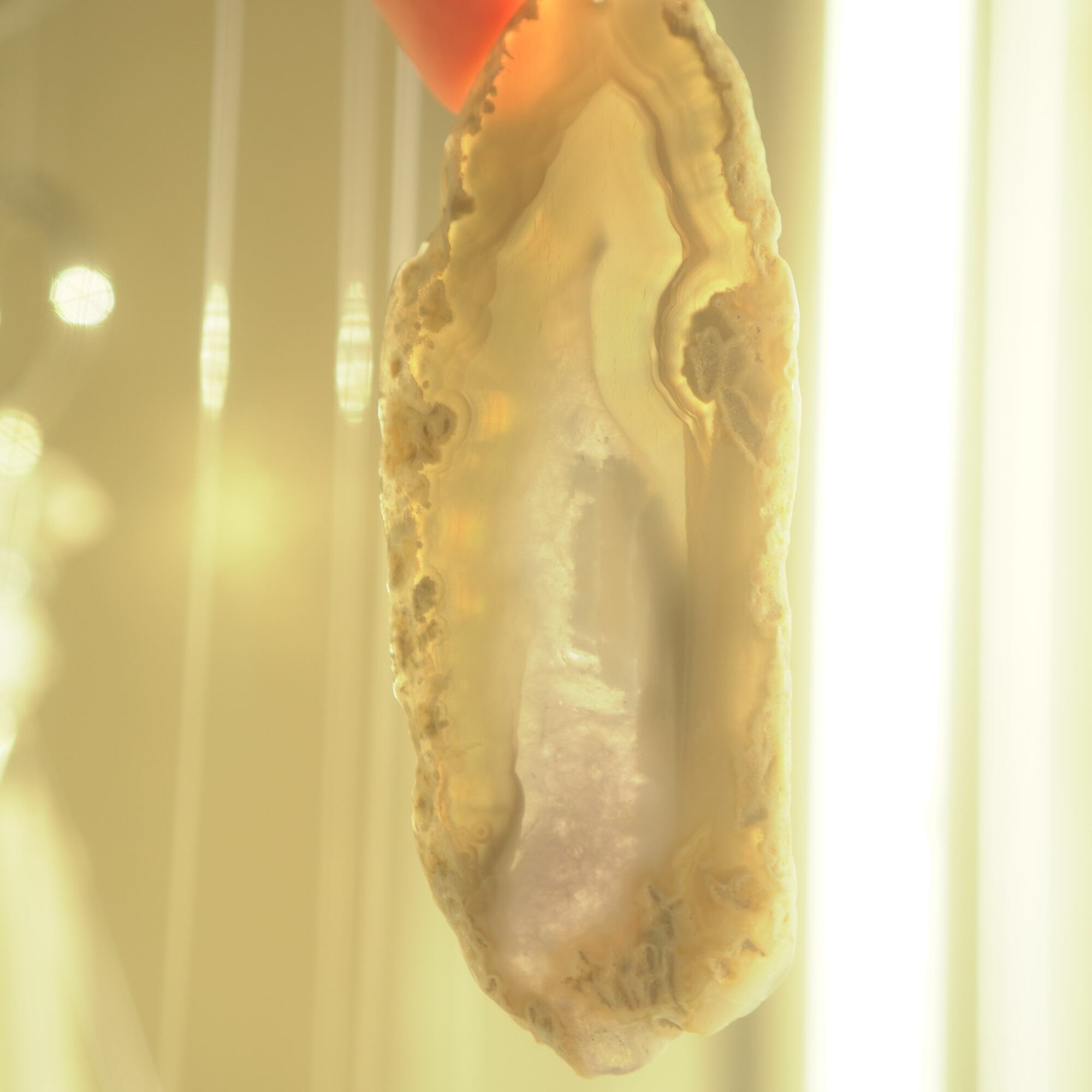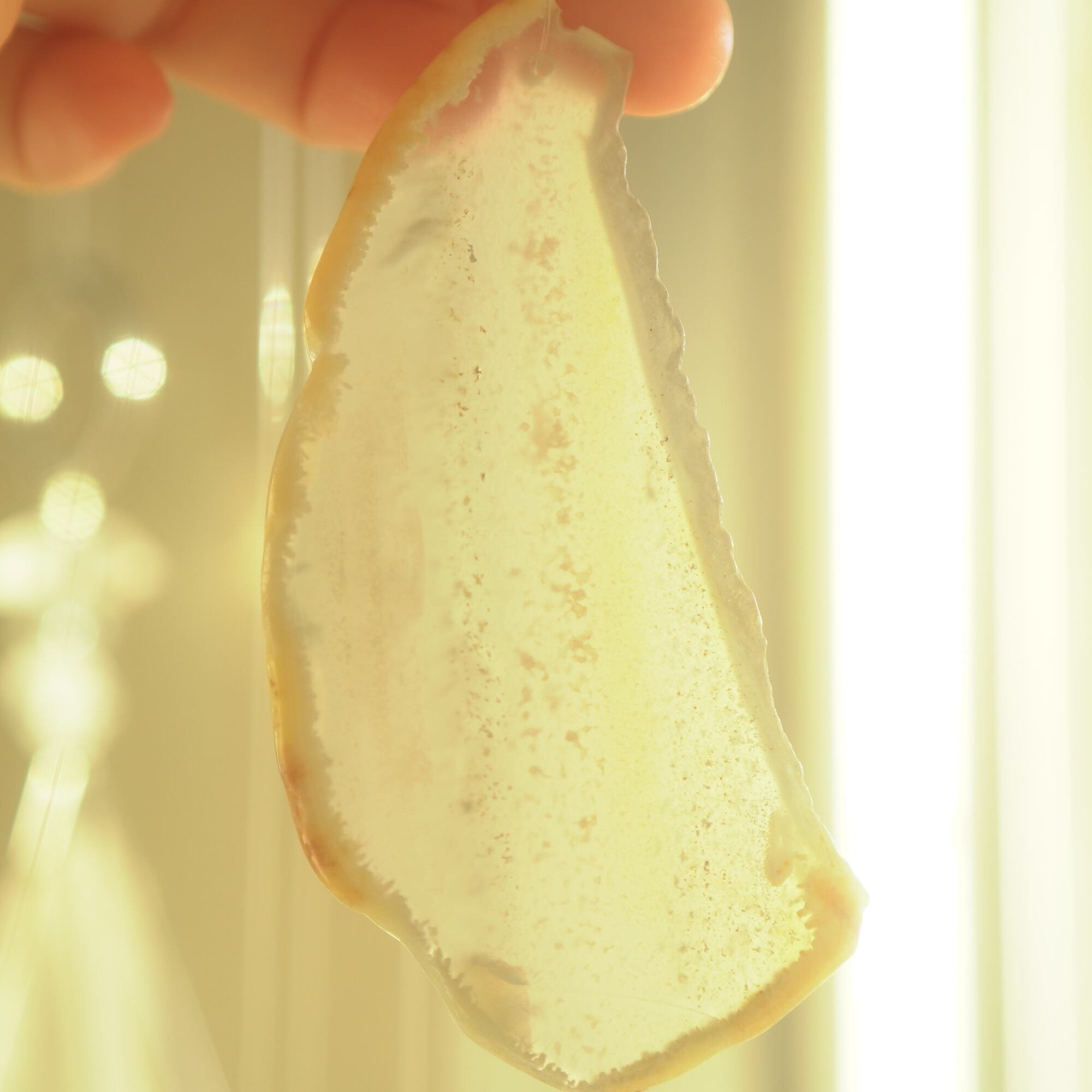 重ねる石同士の側面の加工状態によっても良い音が鳴ったり鳴らなかったり、石の見た目だけで組み合わせを決められないことが難しいポイントでもあるのですが、そんな中、たくさんの石の中から選ばれた5枚のスライスアゲートから出来上がったチャイムたちは、どこか悠々自適に空を泳ぐ妖精のようでもあり、それぞれの音を楽しそうに奏でてくれます。