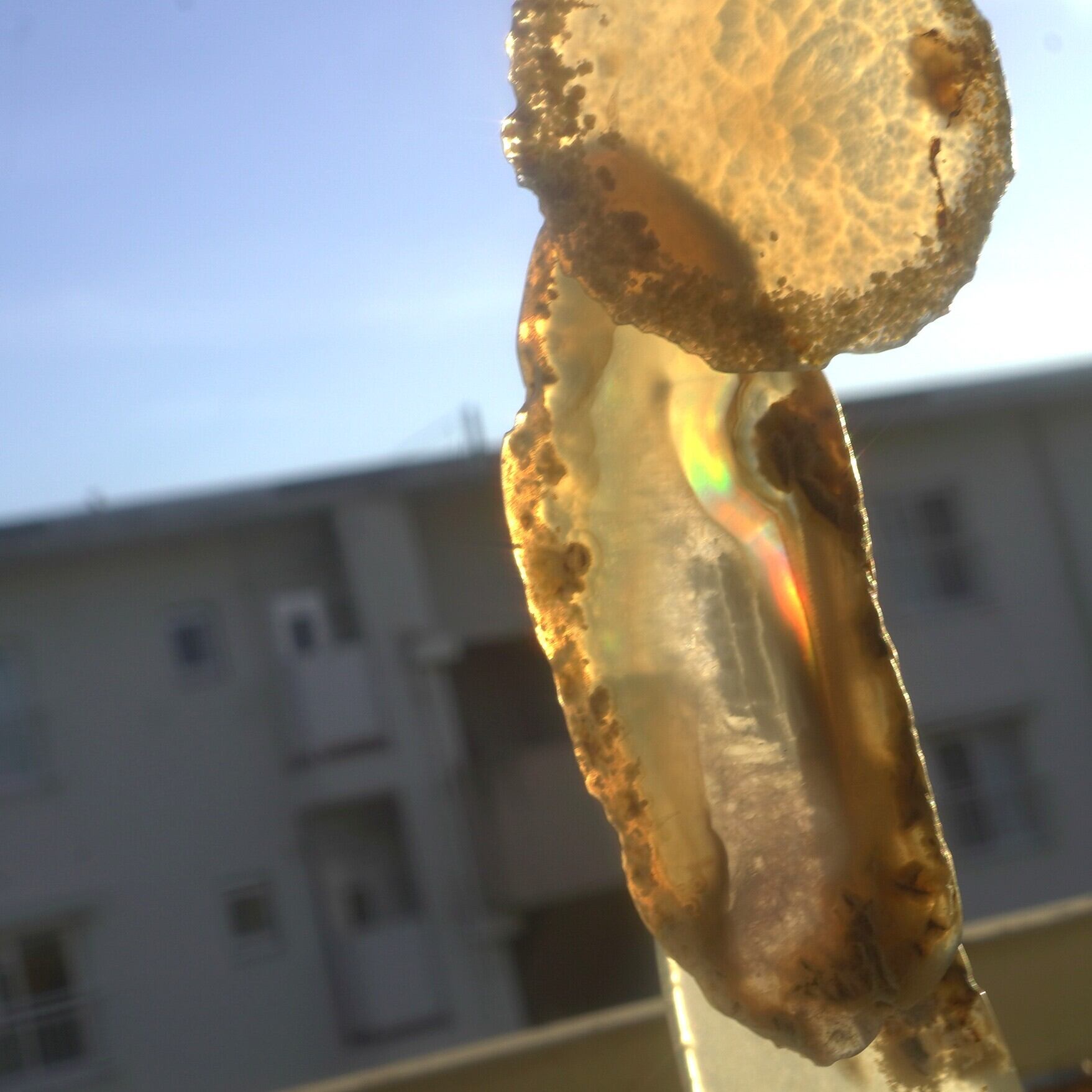 ✧染色の石なので耐光性(光による経年でのカラー変化の耐性)に優れているわけではなくベランダなど一日の中で長時間強い日光に当たるような場所に飾られるのはおすすめしないのですが、陽光に透かした時にだけ真価を発揮する美しさがありますので、是非、時折翳したりして光と一緒にお楽しみいただけたらと思います。特に濃い鮮やかな色など、色変化が気になられる場合は、日光のあまり当たらない場所に飾ってくださいね✧
