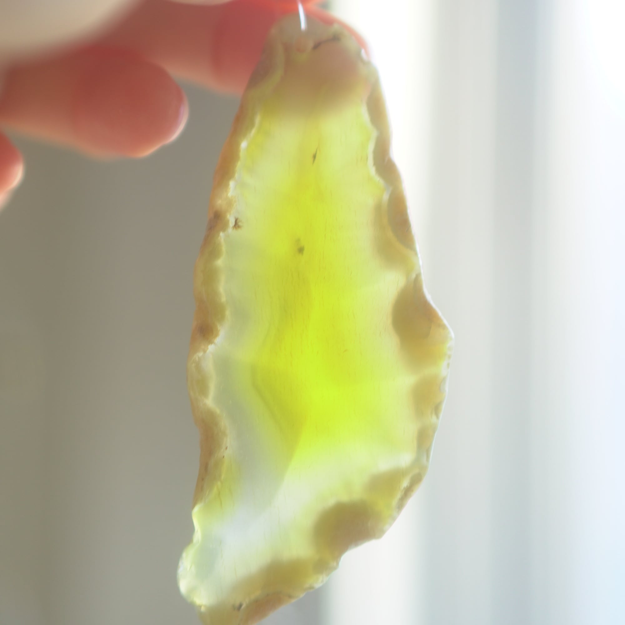 重ねる石同士の側面の加工状態によっても良い音が鳴ったり鳴らなかったり、石の見た目だけで組み合わせを決められないことが難しいポイントでもあるのですが、そんな中、たくさんの石の中から選ばれた5枚のスライスアゲートから出来上がったチャイムたちは、どこか悠々自適に空を泳ぐ妖精のようでもあり、それぞれの音を楽しそうに奏でてくれます。