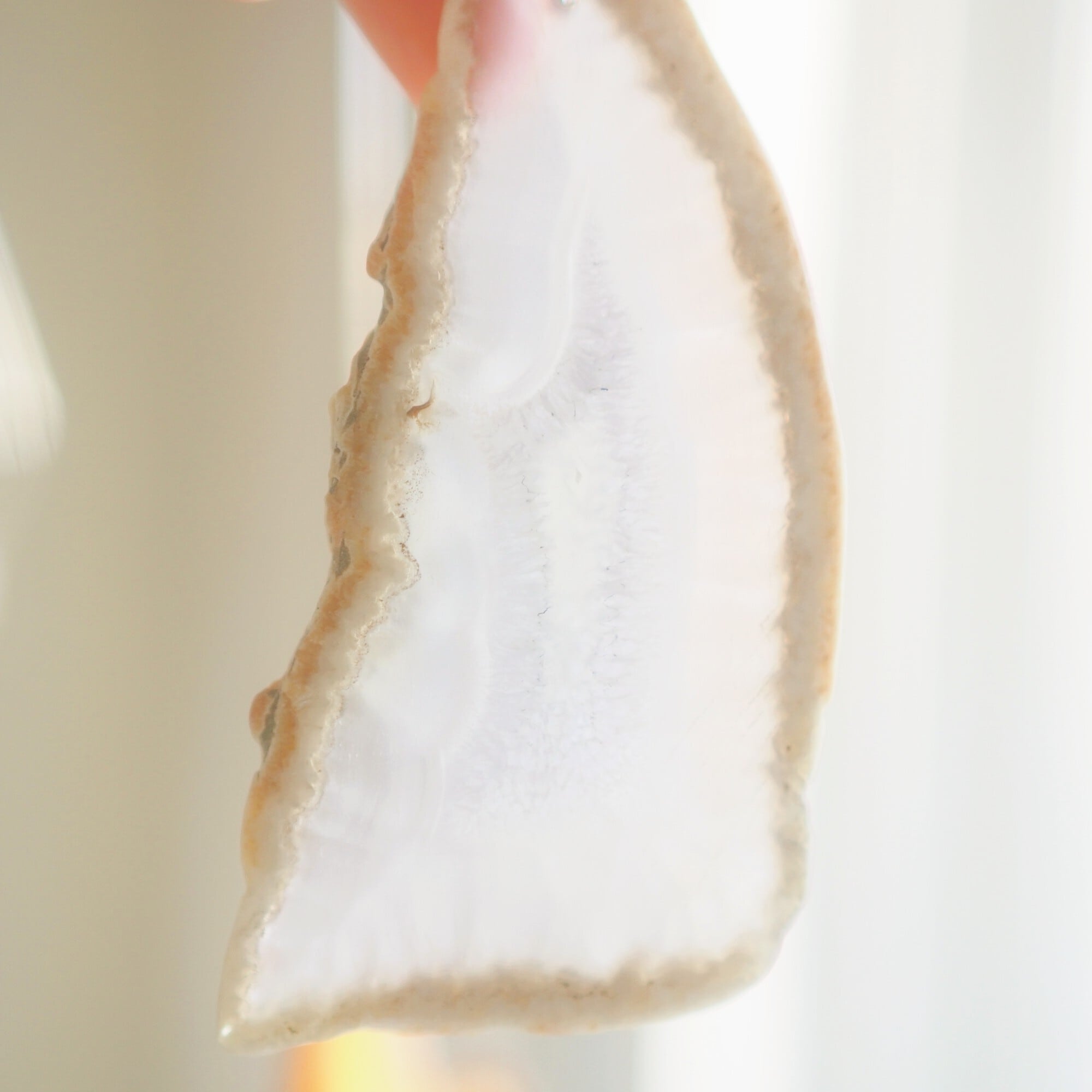 重ねる石同士の側面の加工状態によっても良い音が鳴ったり鳴らなかったり、石の見た目だけで組み合わせを決められないことが難しいポイントでもあるのですが、そんな中、たくさんの石の中から選ばれた5枚のスライスアゲートから出来上がったチャイムたちは、どこか悠々自適に空を泳ぐ妖精のようでもあり、それぞれの音を楽しそうに奏でてくれます。
