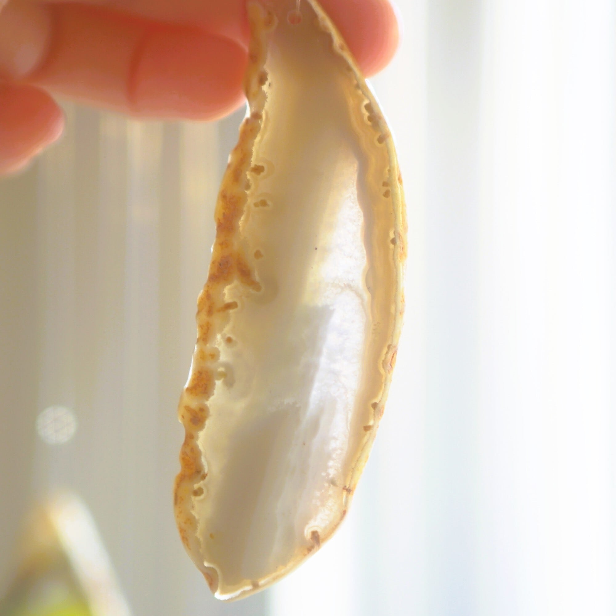 重ねる石同士の側面の加工状態によっても良い音が鳴ったり鳴らなかったり、石の見た目だけで組み合わせを決められないことが難しいポイントでもあるのですが、そんな中、たくさんの石の中から選ばれた5枚のスライスアゲートから出来上がったチャイムたちは、どこか悠々自適に空を泳ぐ妖精のようでもあり、それぞれの音を楽しそうに奏でてくれます。