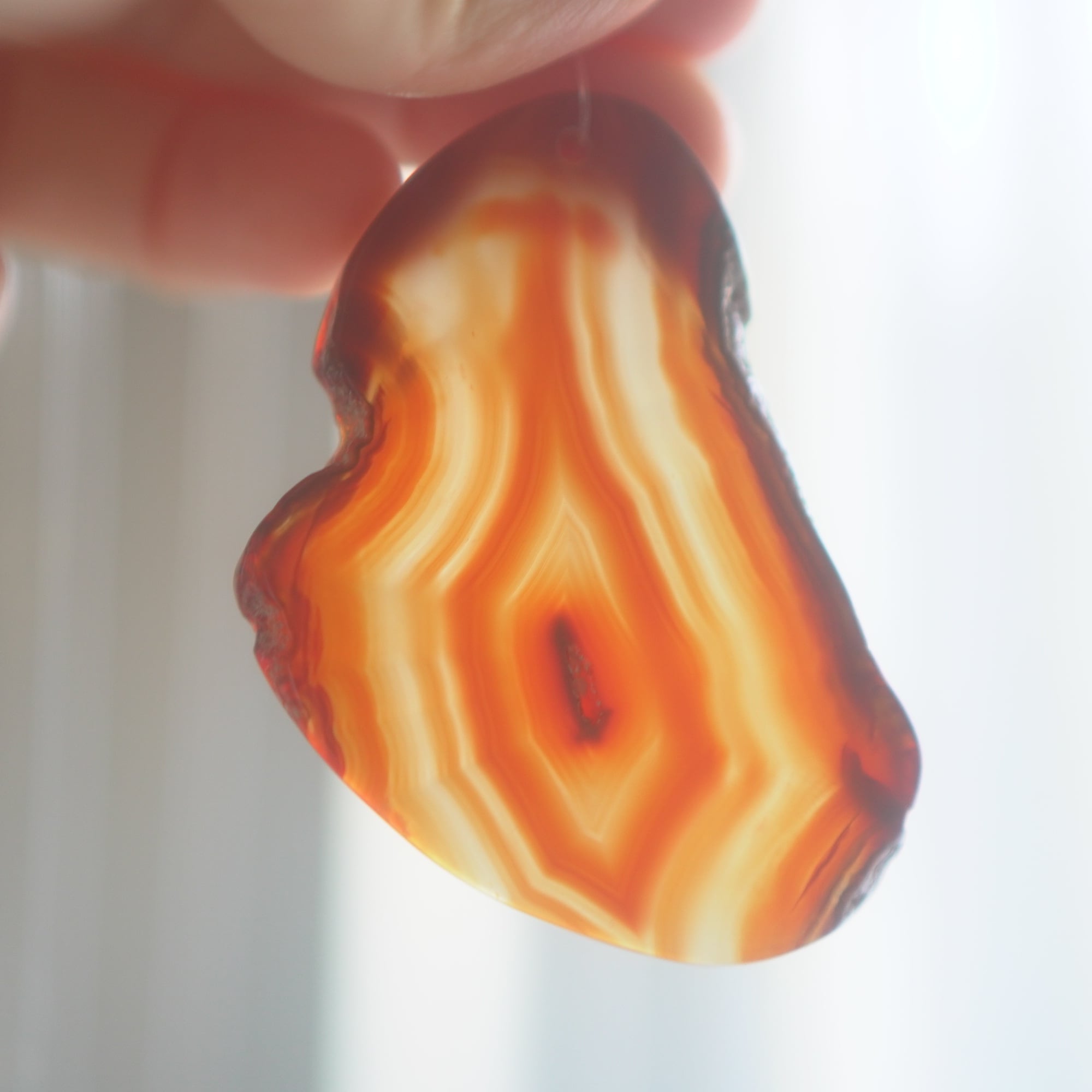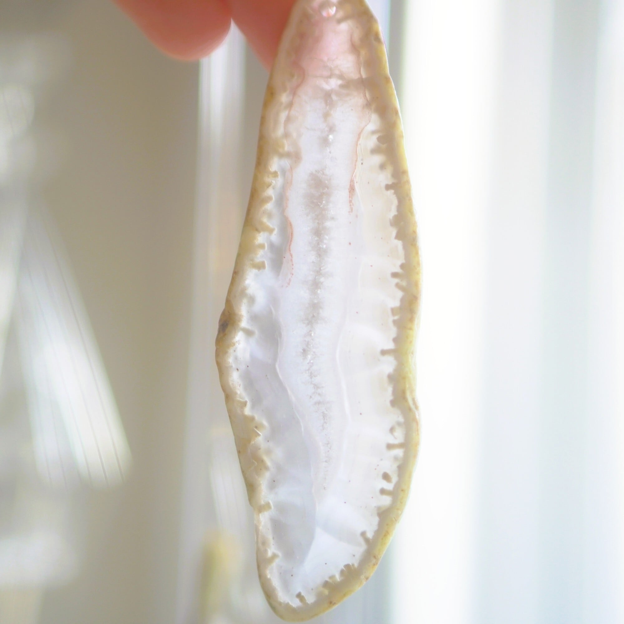 重ねる石同士の側面の加工状態によっても良い音が鳴ったり鳴らなかったり、石の見た目だけで組み合わせを決められないことが難しいポイントでもあるのですが、そんな中、たくさんの石の中から選ばれた5枚のスライスアゲートから出来上がったチャイムたちは、どこか悠々自適に空を泳ぐ妖精のようでもあり、それぞれの音を楽しそうに奏でてくれます。