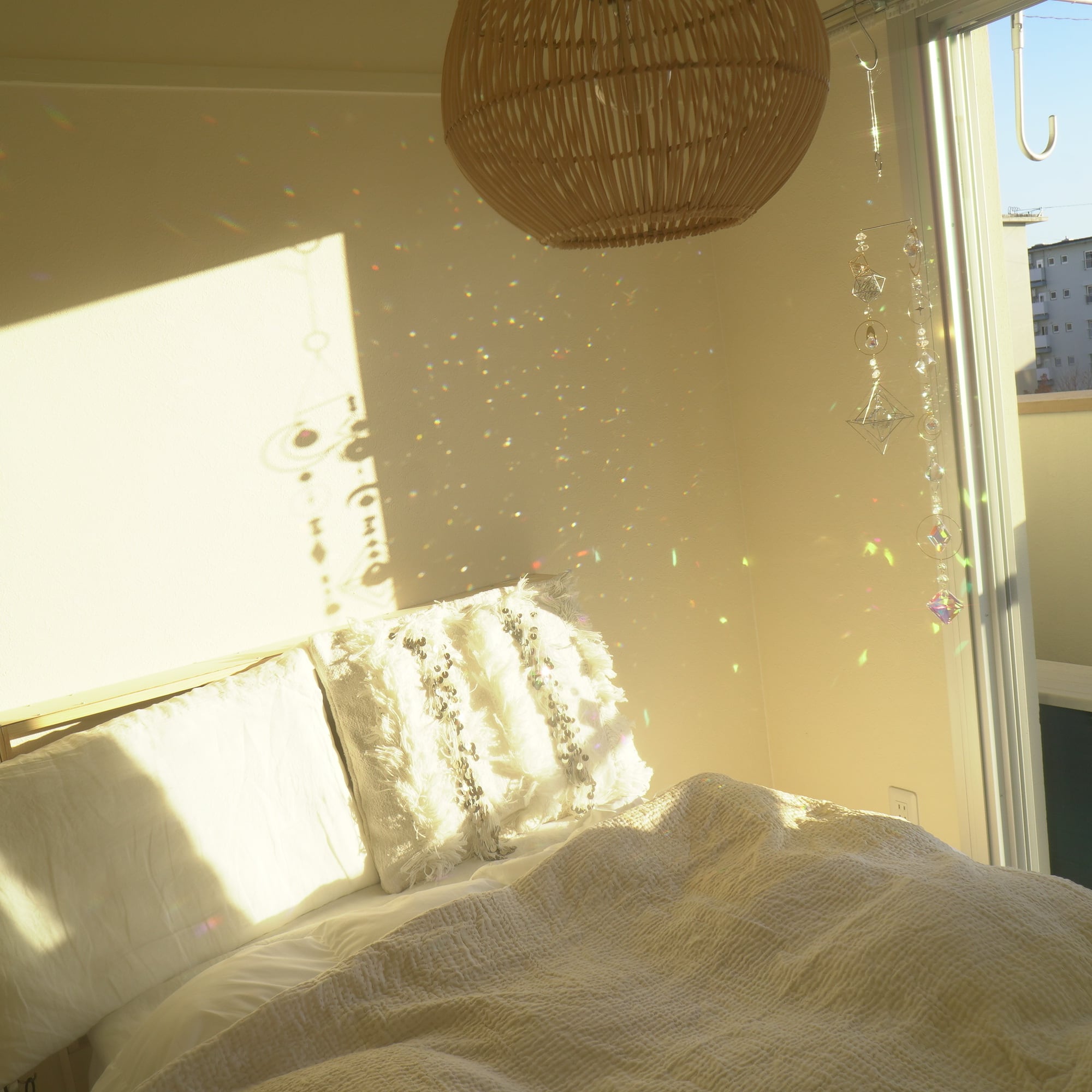 大きいので重みはありますが窓を開ければ自然の風でゆったりと回りながら揺れ、直射日光が当たっている際はそれに合わせて光の粒もお部屋中をしぶきのように舞うのが魅力です。
